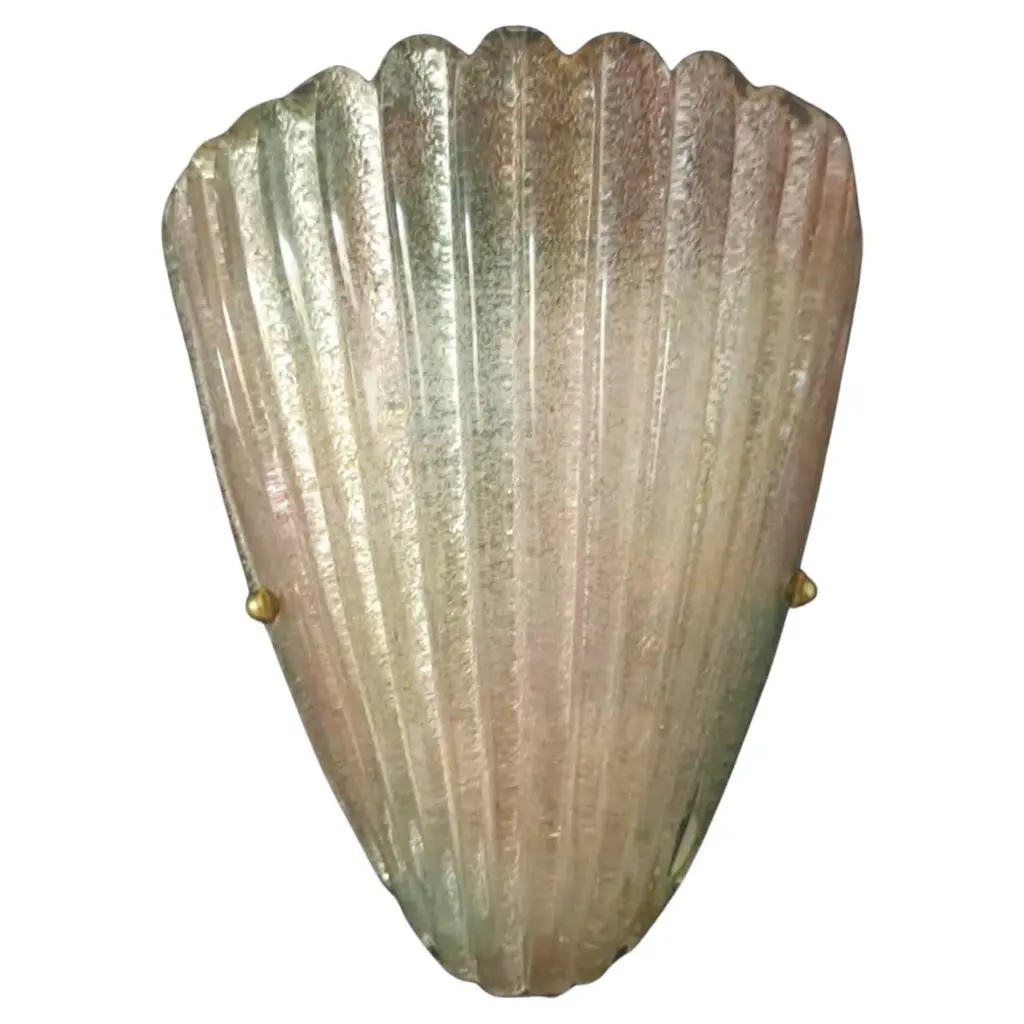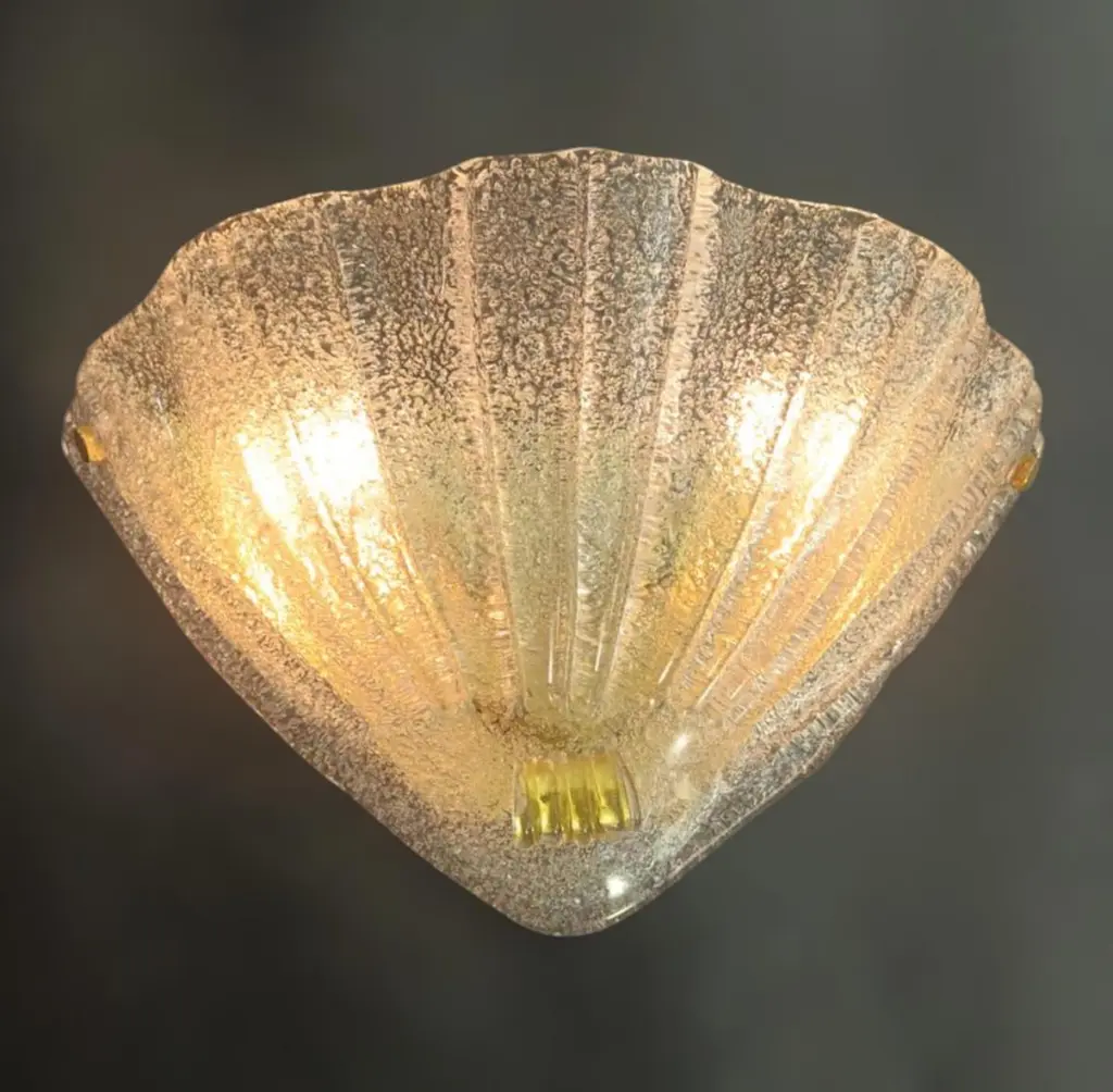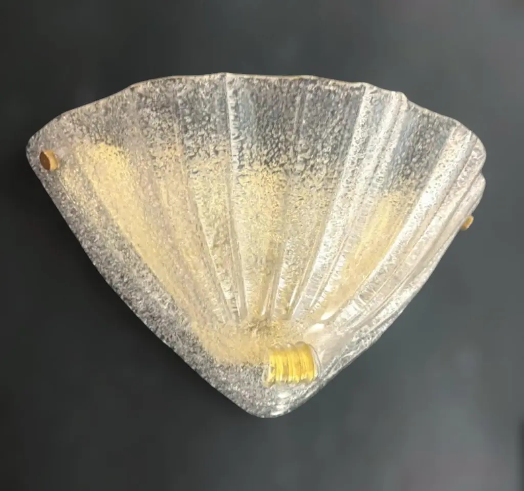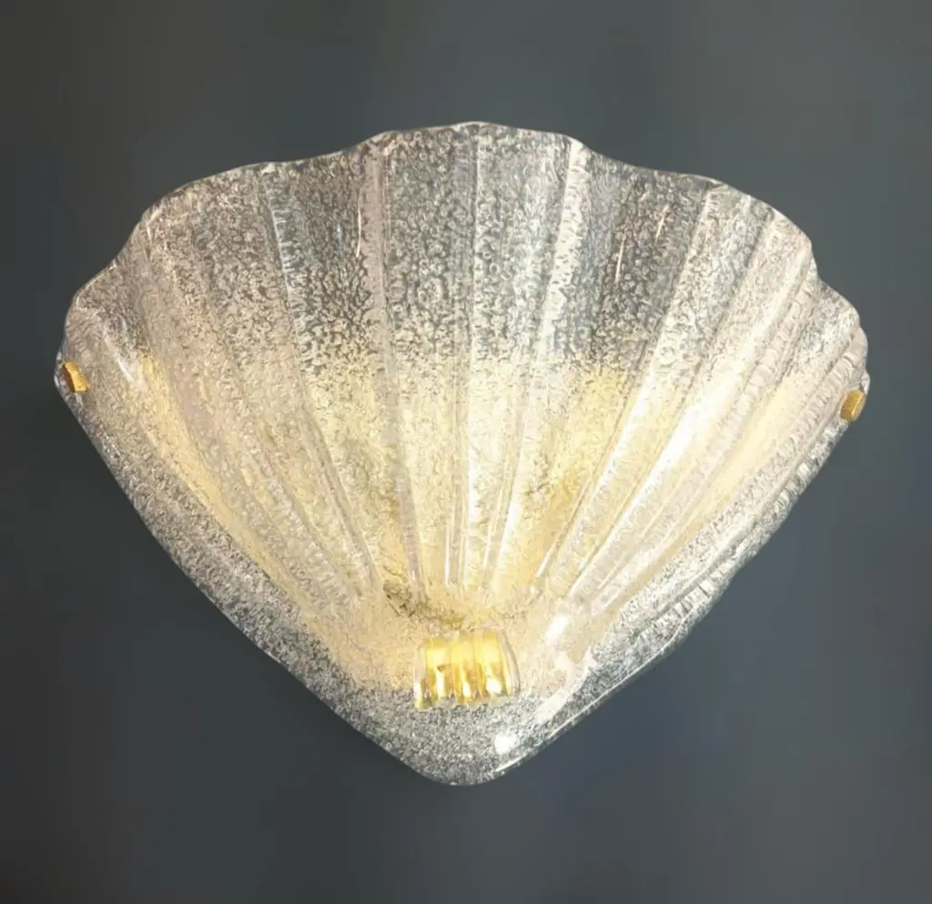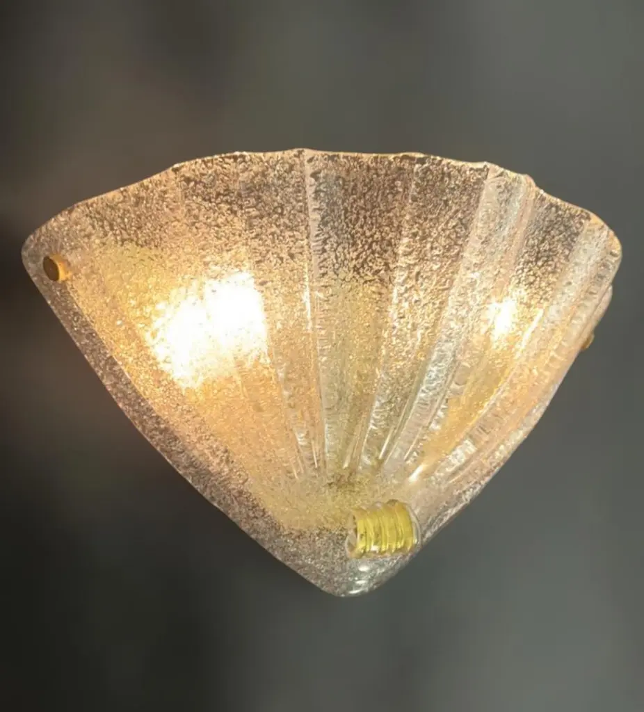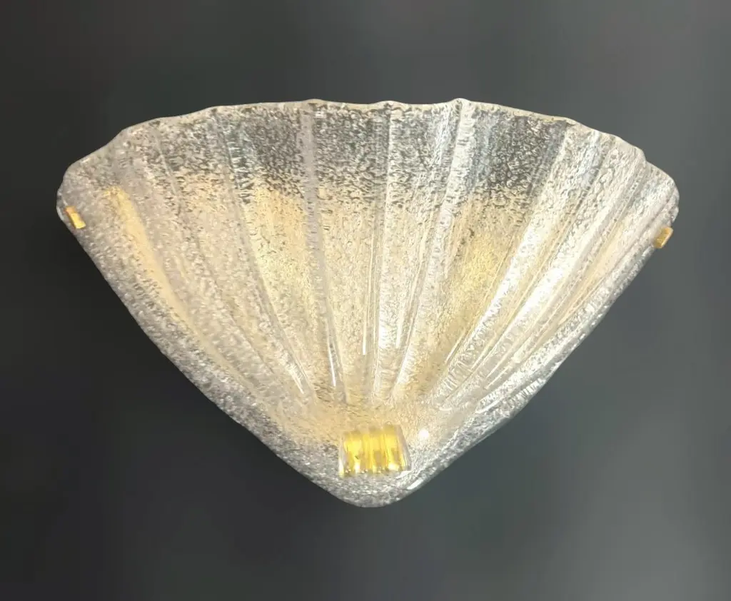 Vintage Italian uplight sconce with clear Murano glass shade hand blown using graniglia technique to produce granular textured effect / Made in Italy in the style of Barovier e Toso, circa 1960sMeasures: width 16 inches / Height 8 inches / Depth 6 inches2 lights / E12 or E14 type / max 40W each5 available in stock in Italy, price is for each itemOrder reference #: FABIOLTD H197
