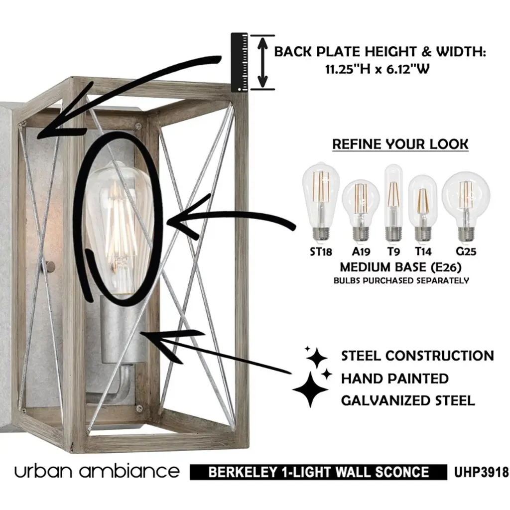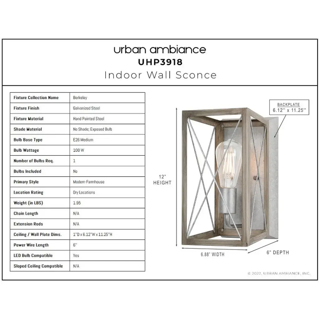Urban Ambiance Luxury Industrial Wall Sconce 12''h X 6.875''w, Galvanized Steel Finish, Berkeley Collection, Uhp3918
