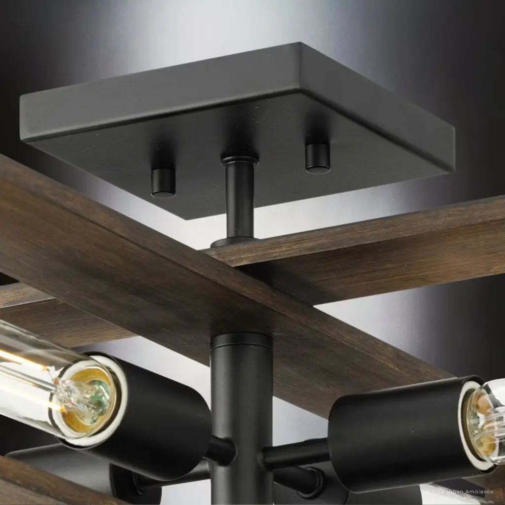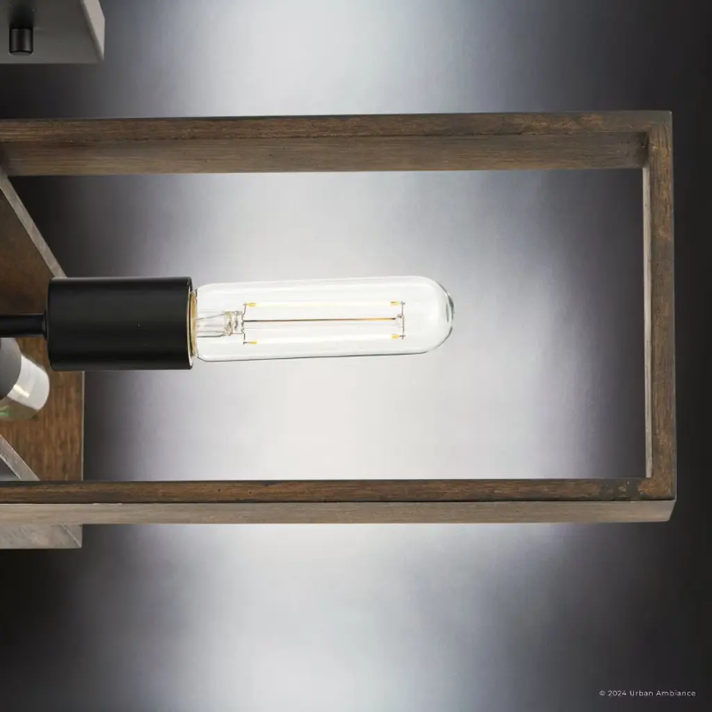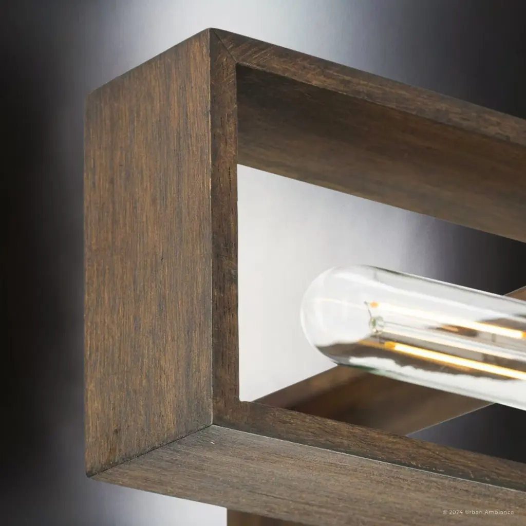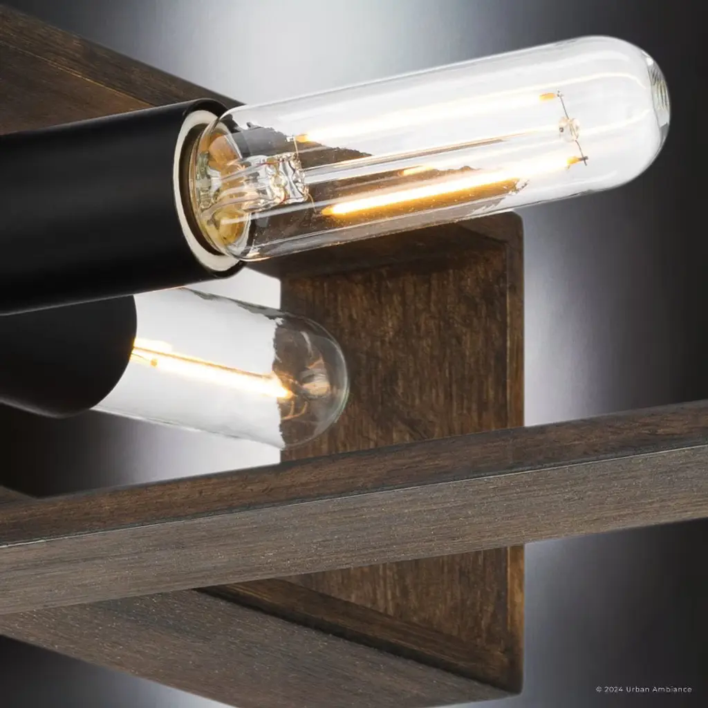 The Roswell Collection of light fixtures is a blend of modern and rustic elements, characterized by its distinctive geometric structure. The collection’s fixtures, which include chandeliers, pendants, ceiling lights, and wall sconces are constructed from a combination of metal and wood. The metal components, finished in matte black or brushed nickel, contrast beautifully with the natural, slightly weathered finish of the wooden frames. This combination creates a striking visual appeal, enhancing the fixture’s modern and industrial look. The design of both the Roswell chandelier and ceiling light is both dynamic and layered, consisting of two rectangular wooden frames oriented at different angles or intersecting at the middle. This geometric arrangement, along with the exposed tubular bulbs housed within the frames, makes the fixtures a focal point in any room. The bulbs, connected by metal rods extending from the central metal hub, ensure even light distribution. The Roswell pendant lights and wall sconces, on the other hand, feature a single rectangular frame, to which one or two light bulbs are attached. The chandeliers and pendants are suspended from the ceiling by a single metal rod, maintaining a clean and modern aesthetic. This rod connects to a square canopy that secures the fixture to the ceiling, providing stability. Suitable for spaces such as dining rooms, living rooms, or large entryways, the fixtures’ open design ensures that they do not overpower the space, while still providing ample illumination.