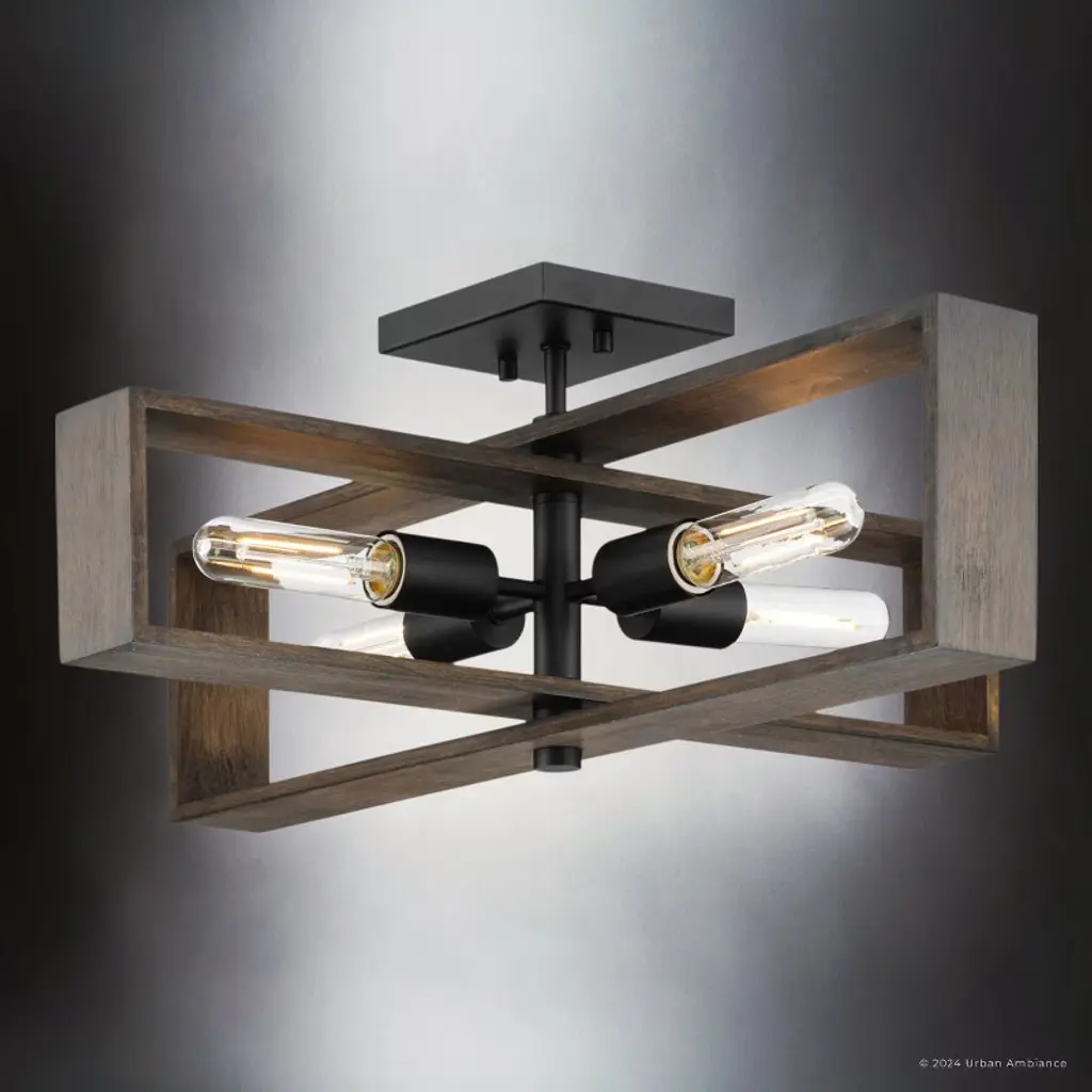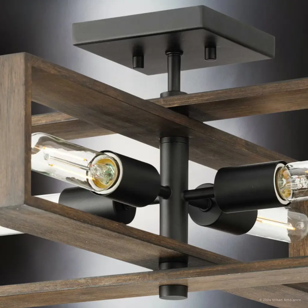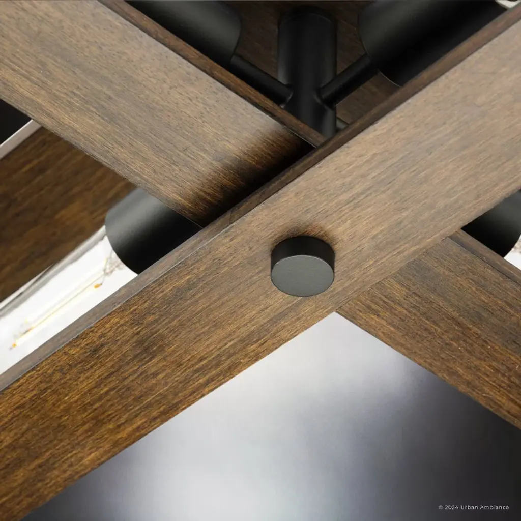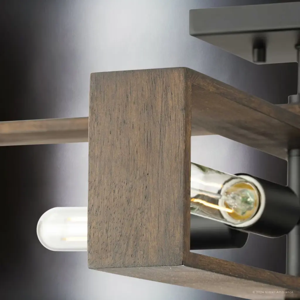 The Roswell Collection of light fixtures is a blend of modern and rustic elements, characterized by its distinctive geometric structure. The collection’s fixtures, which include chandeliers, pendants, ceiling lights, and wall sconces are constructed from a combination of metal and wood. The metal components, finished in matte black or brushed nickel, contrast beautifully with the natural, slightly weathered finish of the wooden frames. This combination creates a striking visual appeal, enhancing the fixture’s modern and industrial look. The design of both the Roswell chandelier and ceiling light is both dynamic and layered, consisting of two rectangular wooden frames oriented at different angles or intersecting at the middle. This geometric arrangement, along with the exposed tubular bulbs housed within the frames, makes the fixtures a focal point in any room. The bulbs, connected by metal rods extending from the central metal hub, ensure even light distribution. The Roswell pendant lights and wall sconces, on the other hand, feature a single rectangular frame, to which one or two light bulbs are attached. The chandeliers and pendants are suspended from the ceiling by a single metal rod, maintaining a clean and modern aesthetic. This rod connects to a square canopy that secures the fixture to the ceiling, providing stability. Suitable for spaces such as dining rooms, living rooms, or large entryways, the fixtures’ open design ensures that they do not overpower the space, while still providing ample illumination.