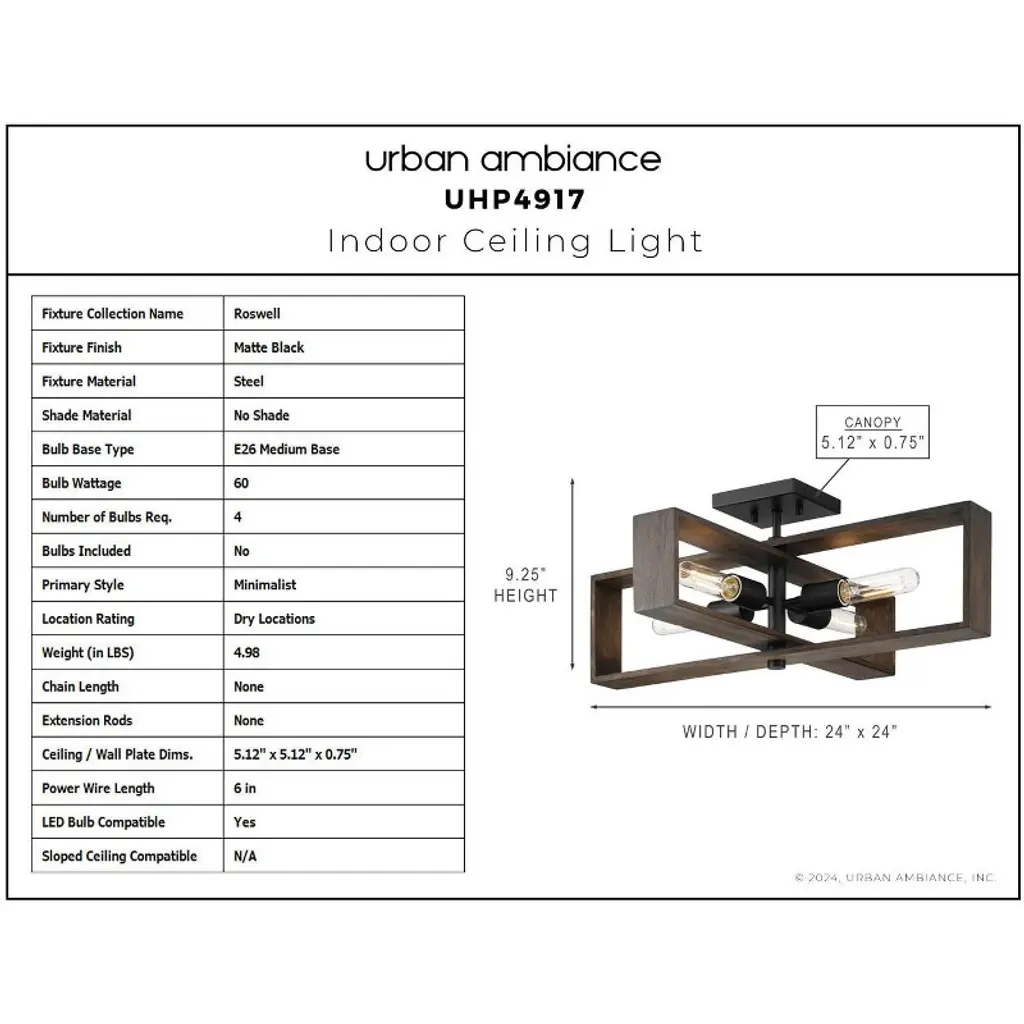 Urban Ambiance Luxury Minimalist Indoor Ceiling Light, 9-1/4''h X 24"w X 24''d, Matte Black Finish, Uhp4917