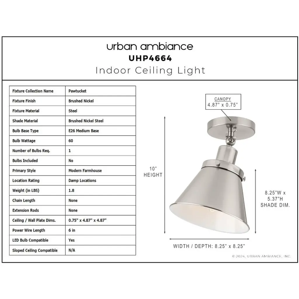 Urban Ambiance Luxury Modern Farmhouse Indoor Ceiling Light, 10''h X 8-1/4"w X 8-1/4''d, Brushed Nickel Finish, Uhp4664