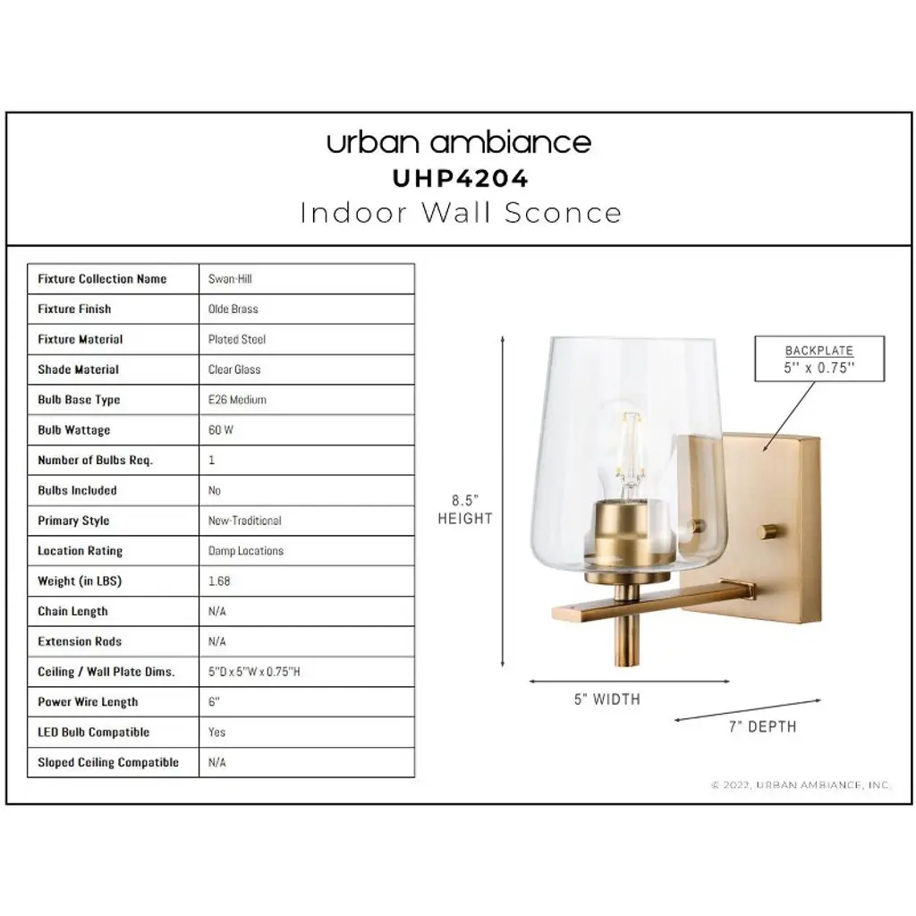 Urban Ambiance Luxury New Traditional Wall Sconce 8.5''h X 5''w, Olde Brass Finish, Swan-hill Collection, Uhp4204