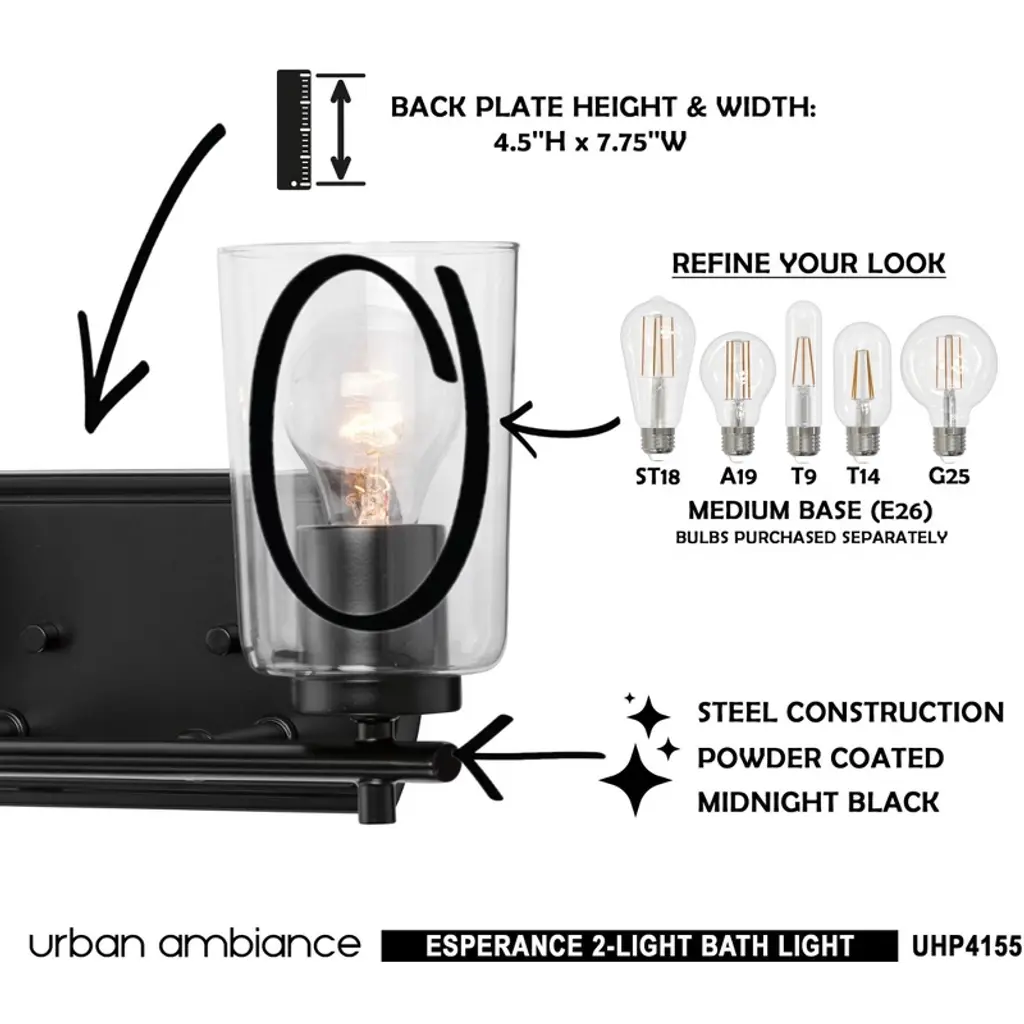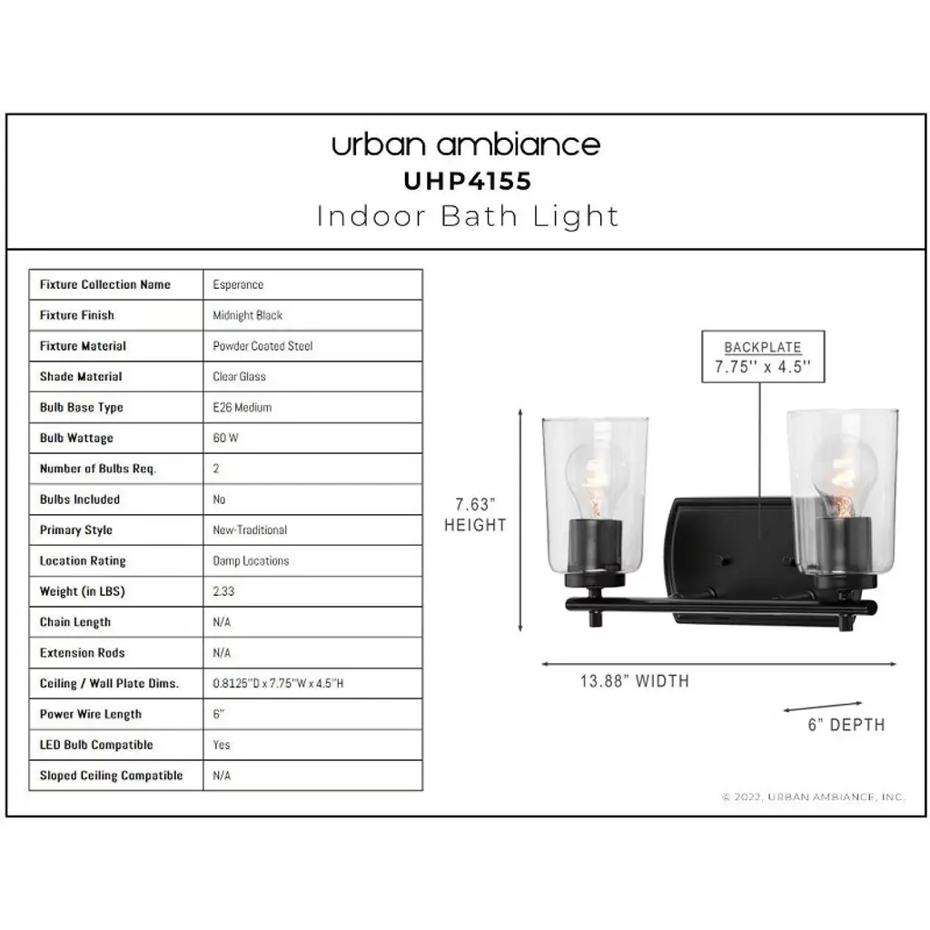 Urban Ambiance Luxury Traditional Bath Light 7.625''h X 13.875''w, Midnight Black Finish, Esperance Collection, Uhp4155