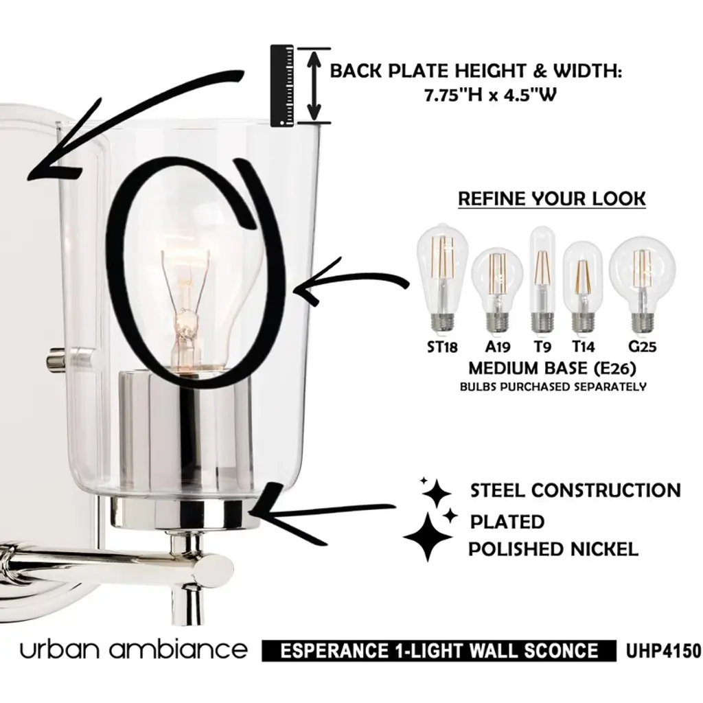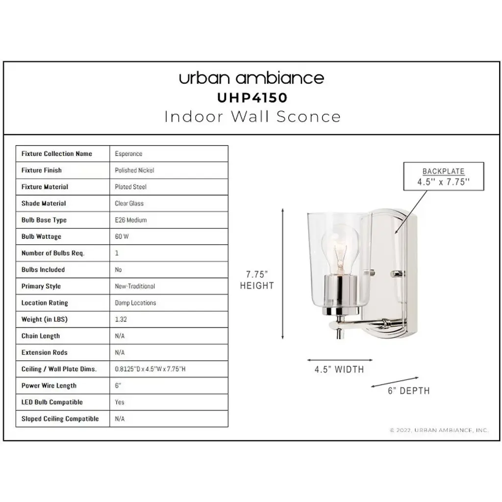 Urban Ambiance Luxury Traditional Wall Sconce 7.75''h X 4.5''w, Polished Nickel Finish, Esperance Collection, Uhp4150