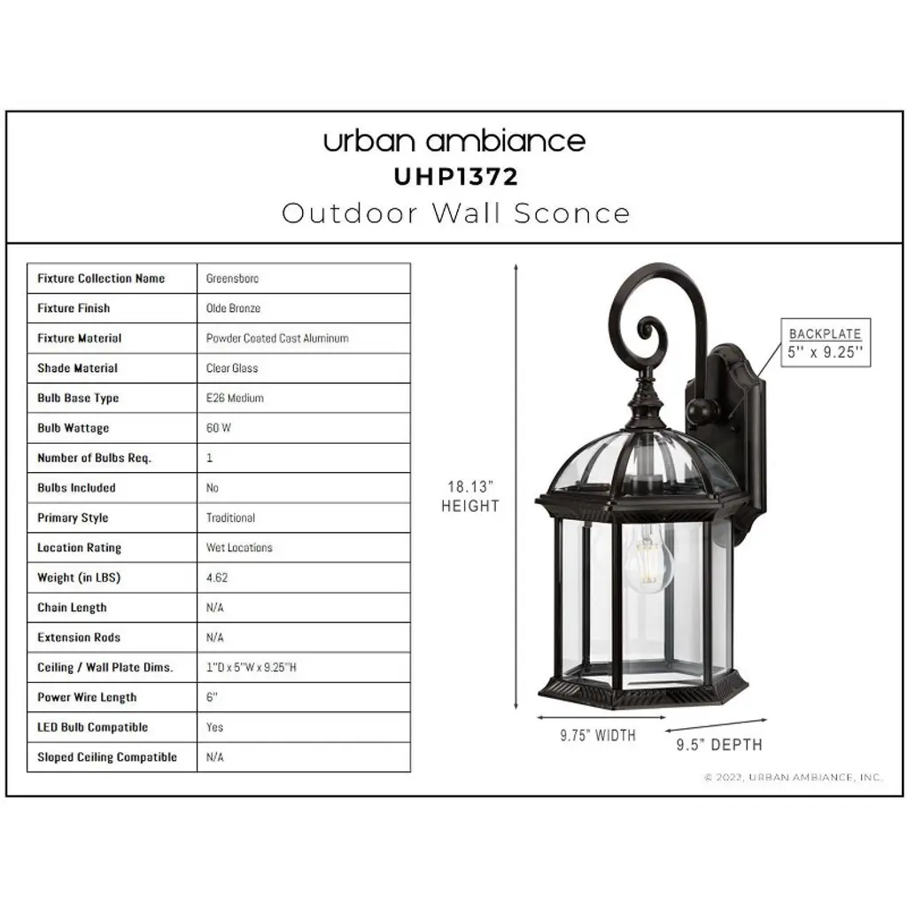 Urban Ambiance Luxury Transitional Outdoor Wall Sconce 18.125''h X 9.75''w, Olde Bronze Finish, Greensboro Collection, Uhp1372
