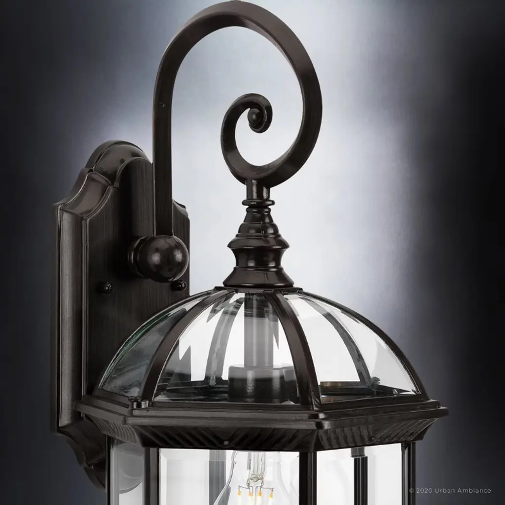 Bringing the timeless detail of classical designs, the Greensboro Collection of outdoor light fixtures introduce elegant sophistication in any space through their detailed ornamentation. With clear beveled glass panes, these fixtures produce an eye-catching glow fit for any traditional or rustic style setting. The lantern-shaped fixtures boast an elegantly ornamented frame that comes with a stylized finial and a scrolled arm as the highlights of their vintage aesthetics. As a six-sided fixture, the vertical bars separating the beveled glass panes create the appearance of historical glass with mullion dividers. The overall look is that of sophistication and class.