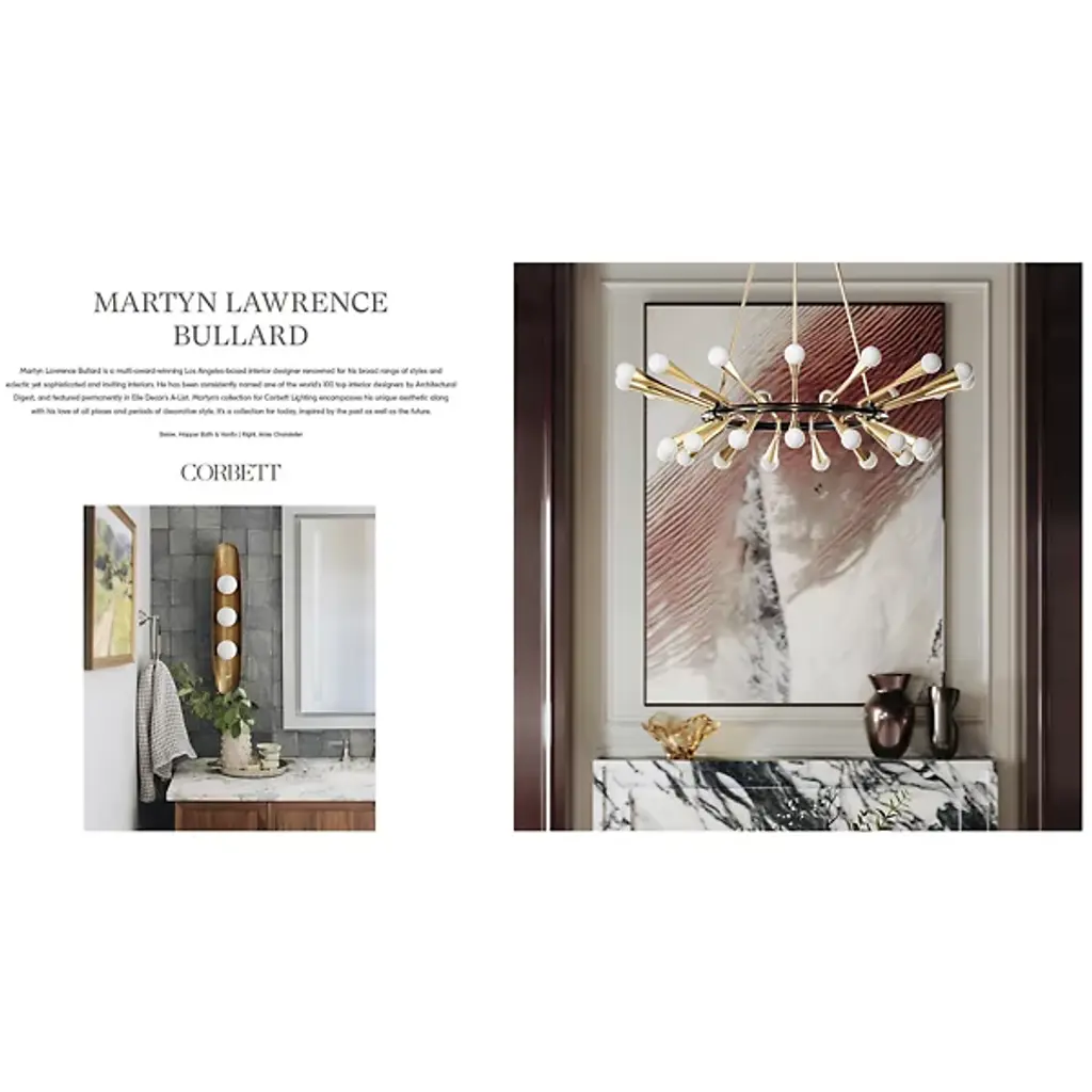 Unique lighting with universal appeal. Designed by Martyn Lawrence Bullard for Corbett Lighting, the Utopia LED Wall Sconce gets its inspiration from the Italian sculptural light fixtures of the 1950’s. Petite and sophisticated, the handcrafted Iron wall light features a dressed-in-black wallplate and arm with a polished Brass fitting that enables the downlight to tilt for directional lighting in a foyer, hallway or above a bedside table. Reminiscent of the curved drinking vessels used in ancient India, the shade holds a single LED light for bright, clear illumination. An artful combination of time periods, cultures, form and texture, this eye-catching wall light is the perfect complement to the Utopia LED Chandelier.