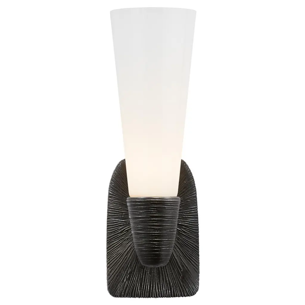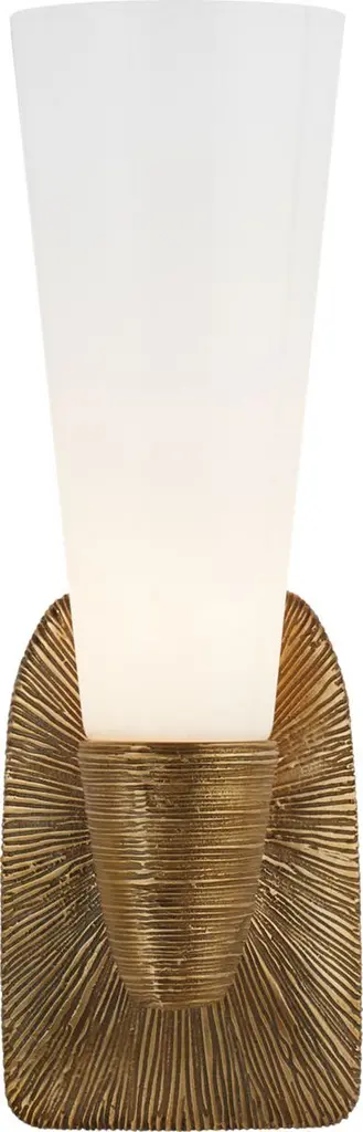 The Visual Comfort Signature, formerly known as Visual Comfort, Utopia Small Bath Sconce puts a design spin on the standard wall light. A flared glass shade is contrasted against textured metalwork, which adds an unexpected element to the piece. Simple with little added touches, this modern meets artistic piece will illuminate your bathroom or vanity with a sense of style.