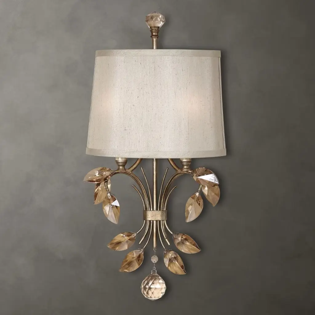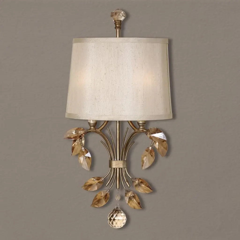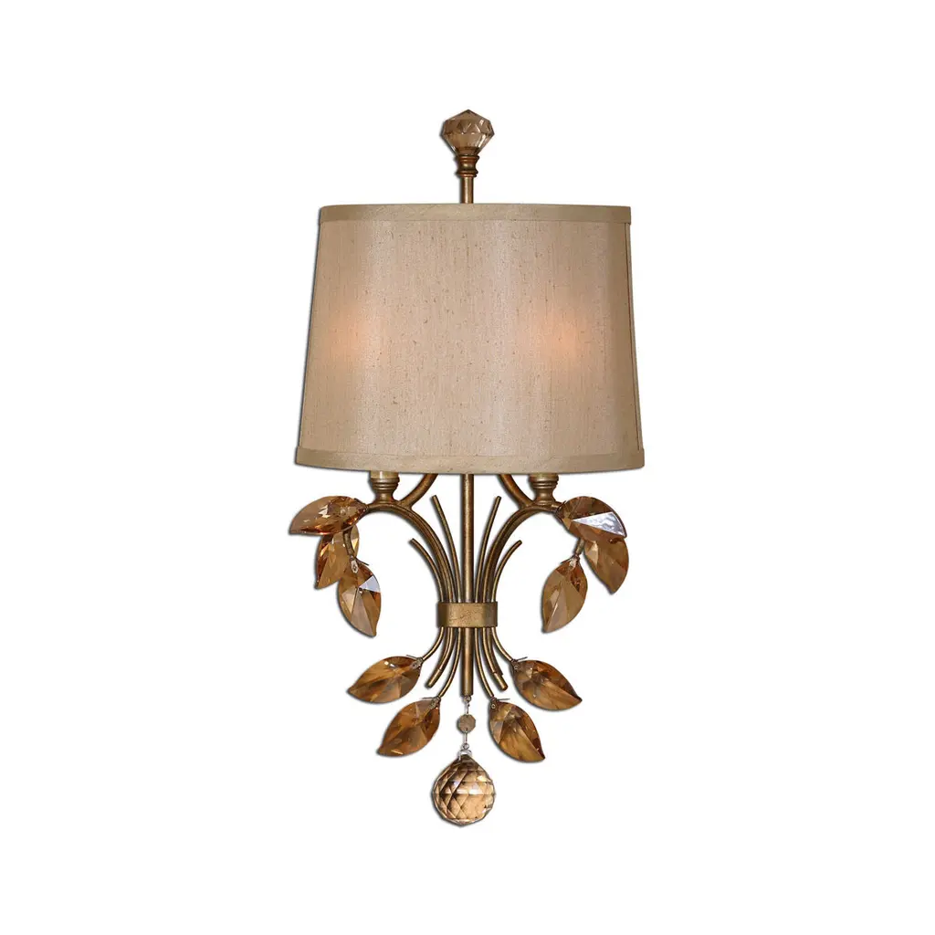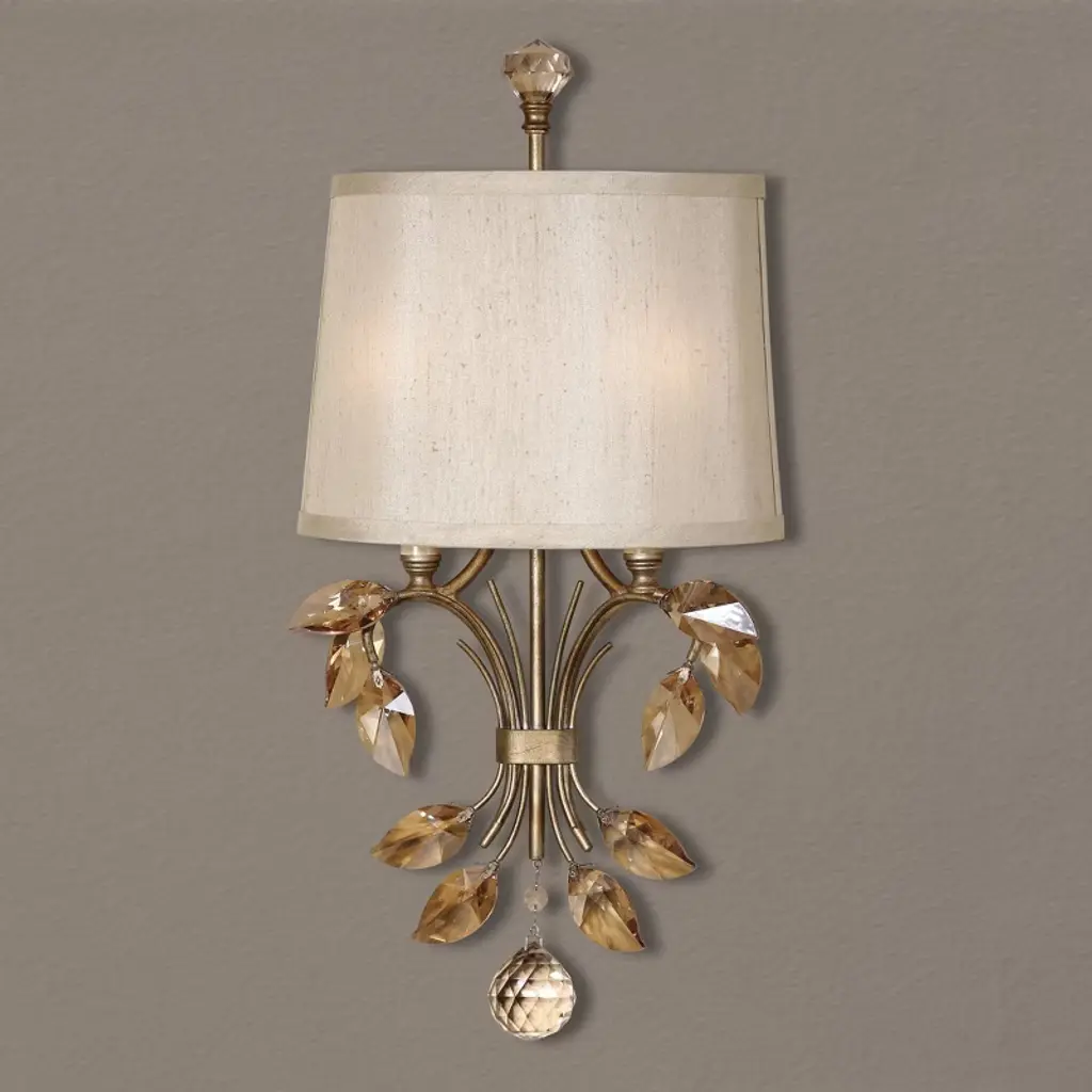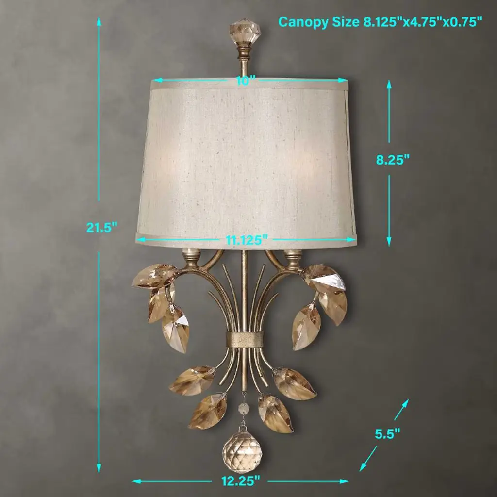 Uttermost Alenya 2-light Wall Sconce – 22"h X 12"w Burnished Gold With Crystal Leaves And Silken Champagne Shade