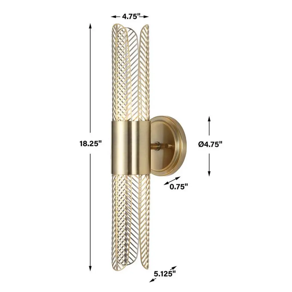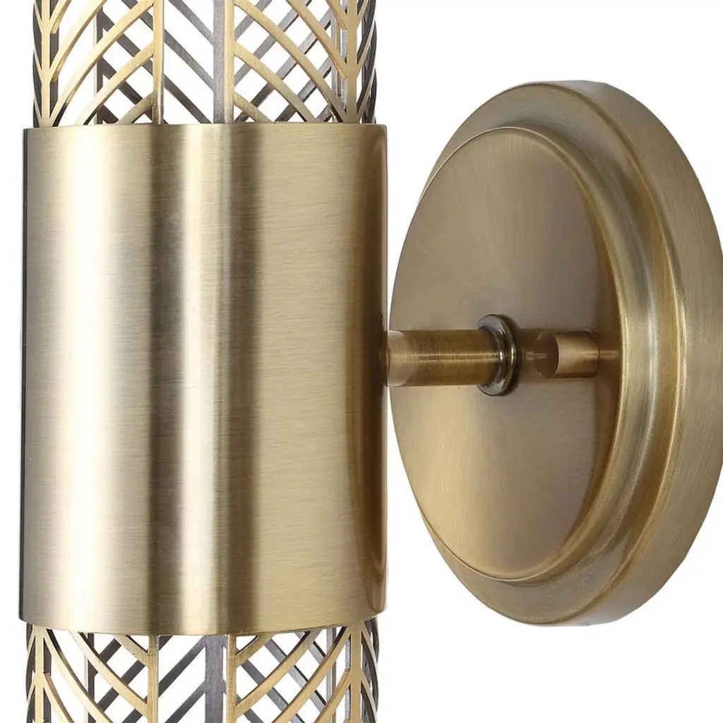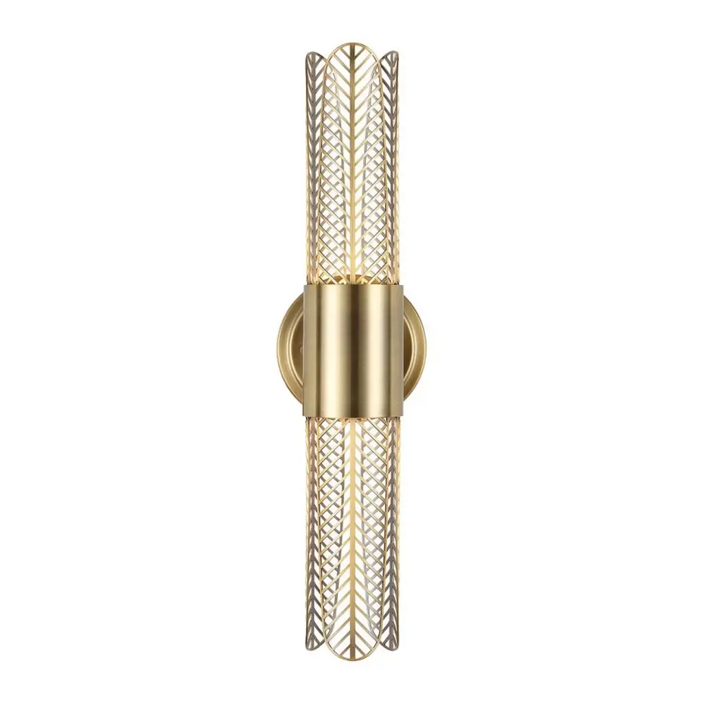 The Cret 2 Light LED Brass Sconce brings a bold yet refined elegance to any wall with its Art Deco-inspired geometry and craftsmanship. The oxidized brass finish enhances the unique silhouette of its cutout-style shades, offering striking visual texture through hand-applied detailing and natural variation. Key Features: Striking Art Deco design with oxidized brass finish Cutout metal shades with subtle hand-applied variations Integrated 16W LED, 3000K, CRI 93, 1440 Lumens, 50,000 hour life Mount horizontally or vertically, ideal for bathroom vanities Dimensions: 18 H X 5 W X 5 D (in), Weight: 4 lbs