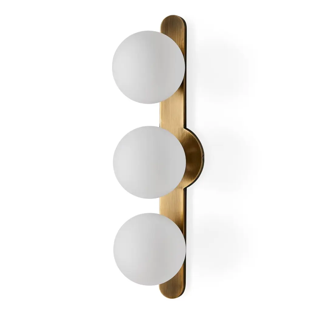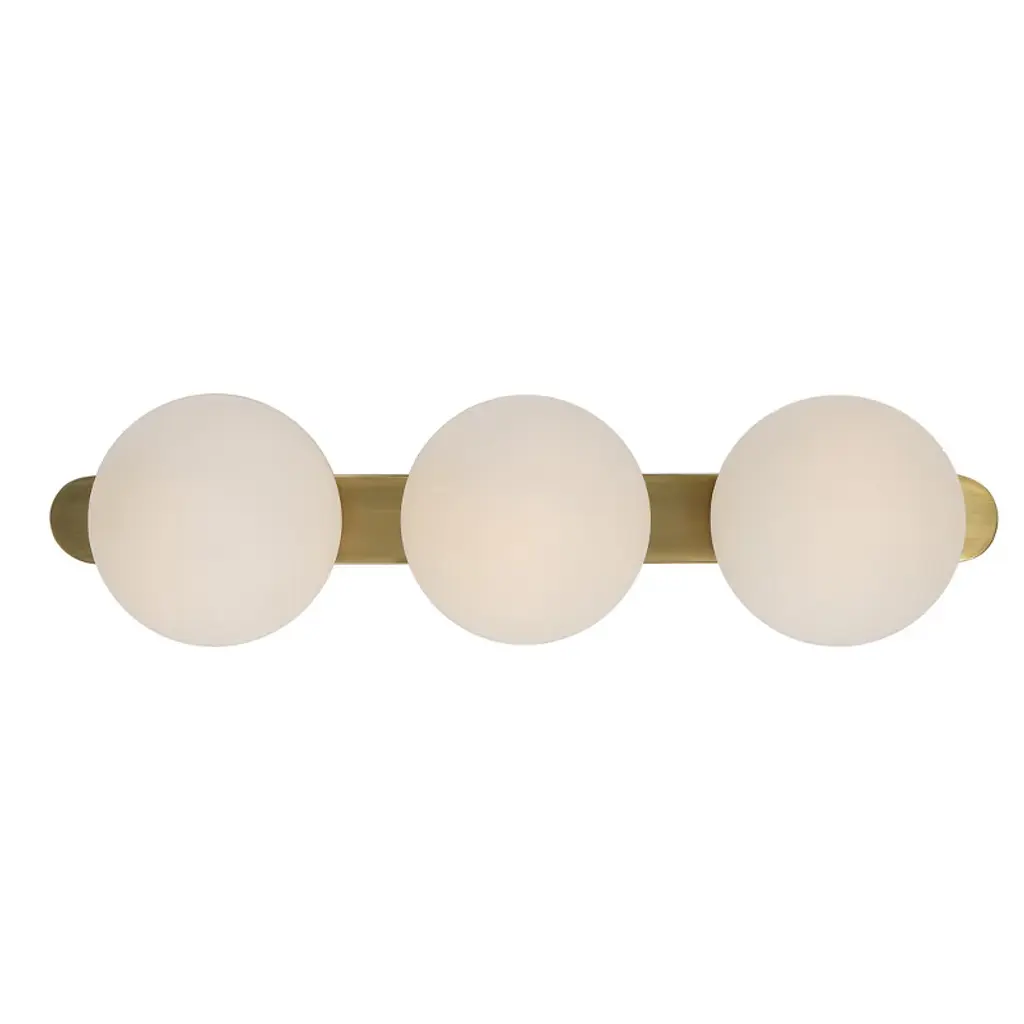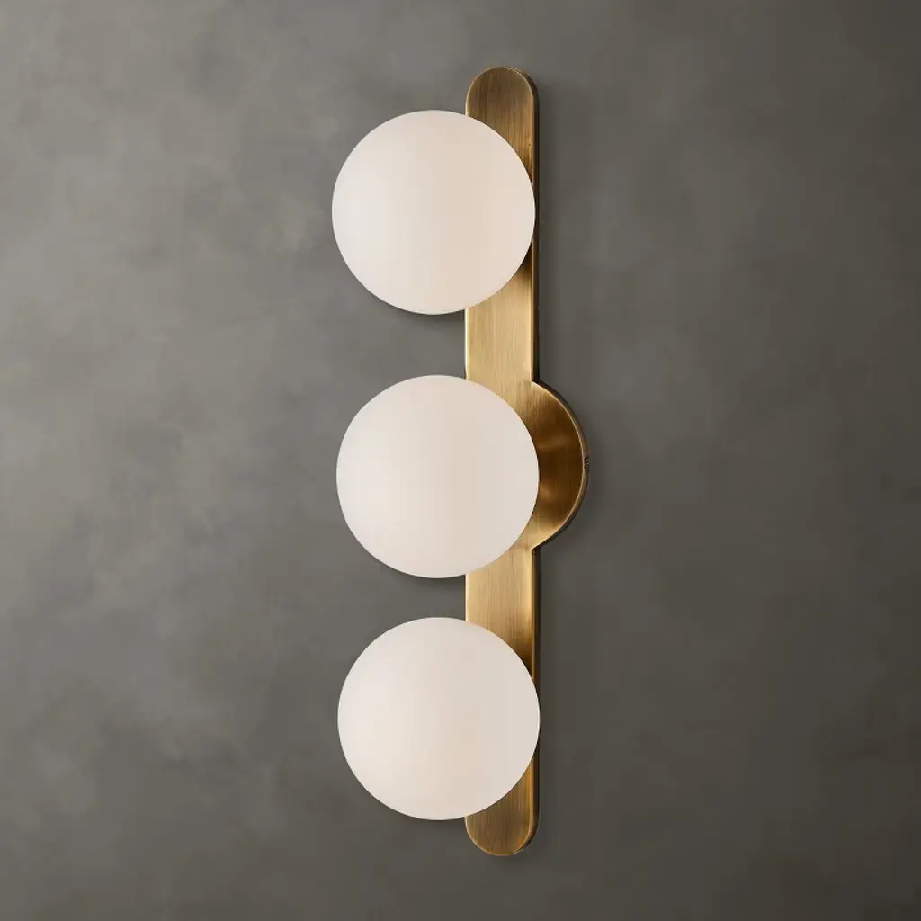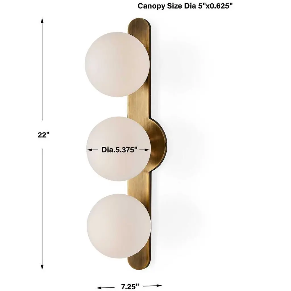 Uttermost Droplet 3 Light Sconce 22"H Antique Brass Steel and Glass Mid-Century Modern The Uttermost Droplet 3-Light Sconce combines Mid-Century inspiration with modern elegance. Featuring warm antique brass and 5" matte white opal globes, this sconce offers a fresh take on classic design. Perfect for horizontal or vertical installation, it is ideal for hallways, living rooms, or bath vanity spaces. Compatible with 3 candelabra bulbs, each up to 60W. Bulbs not included. Constructed from durable steel and glass, this sconce is crafted for indoor use, combining style with long-lasting functionality. Easy to install and clean. Key Features : Mid-Century Style – Antique brass with matte white opal globes for a timeless look. Versatile Placement – Can be installed horizontally or vertically. Functional Lighting – 3-light design with candelabra sockets for soft, ambient illumination. Durable Materials – Steel frame with glass globes ensures long-lasting quality. Indoor Accent – Ideal for bath vanity, hallways, or living areas.