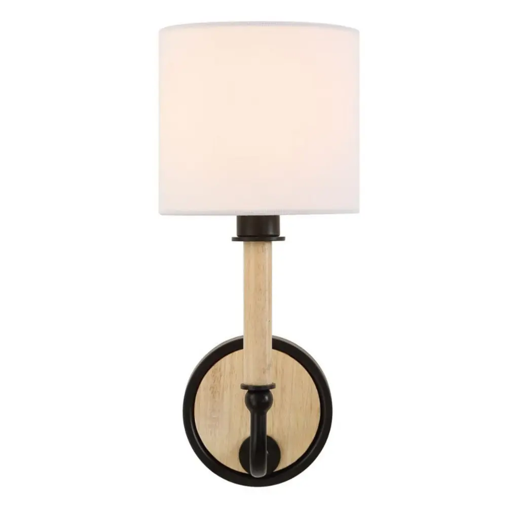 Uttermost Franconia 1 Light Wall Sconce 12"H Matte Black Iron and Blonde Wood with White Linen Shade Casual Lighting This 1-light sconce offers casual, timeless style perfect for any interior. Its earthy blond wood accents pair beautifully with a matte black iron frame. The white linen fabric shade provides soft, diffused lighting ideal for bedrooms, hallways, or accent walls. Constructed from iron and rubber wood, this sconce is durable and compatible with 60W max candelabra bulbs (not included). Key Features : Classic Design – Linear sconce with wood accents complements casual and modern interiors. Soft Lighting – White linen shade provides warm, diffused illumination. Durable Build – Crafted from iron and rubber wood for lasting use. Indoor Versatility – Ideal for bedrooms, living areas, or hallways. Easy Installation – Small parcel-friendly design reduces shipping damage.