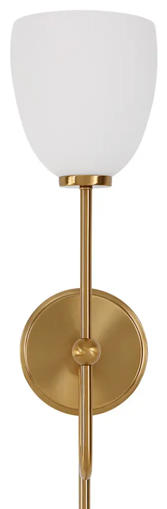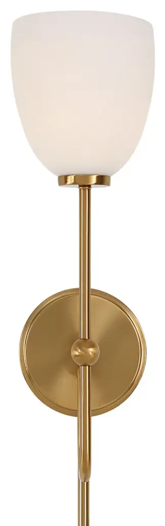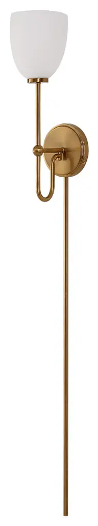 A Classic Urban Sconce In A Warm Brass Finish Enhanced With A Matte Opal Glass Shade. Includes Dual Mount Option With 8'' Of Wire & Plug, In-line Dimmer Switch, And 3-12" Metal Cord Covers For Easy Plug In Installation Or It Can Be Wired Directly To An Outlet Box As A Sconce. 1-60 Watt Max, Edison Socket. Bulb Not Included.