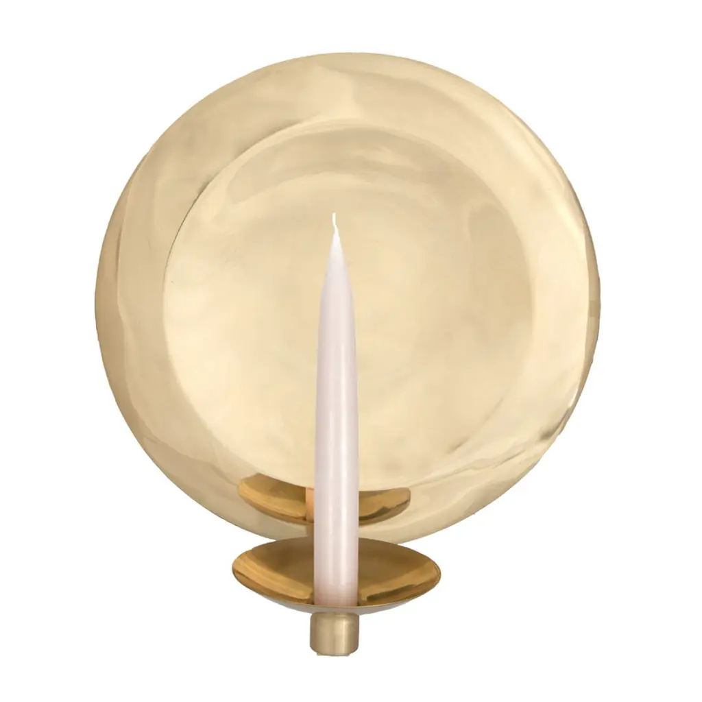 The Uusikuu sconce by Aarikka invites the sensuous spirit of the 70s into the modern home. Designed by Kaija Aarikka in 1974, the handmade candle sconce's warm tone gleams in competition with the candle placed in it. Brass plating will accumulate a unique patina over time, adding yet another layer of charisma to the stunning piece. The concave background of the Uusikuu sconce reflects the flickering light of the candle into a beautiful and even, magically atmospheric glow.
