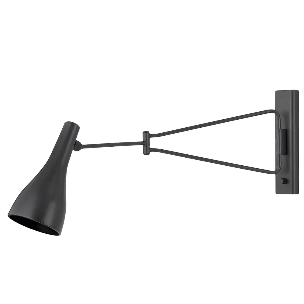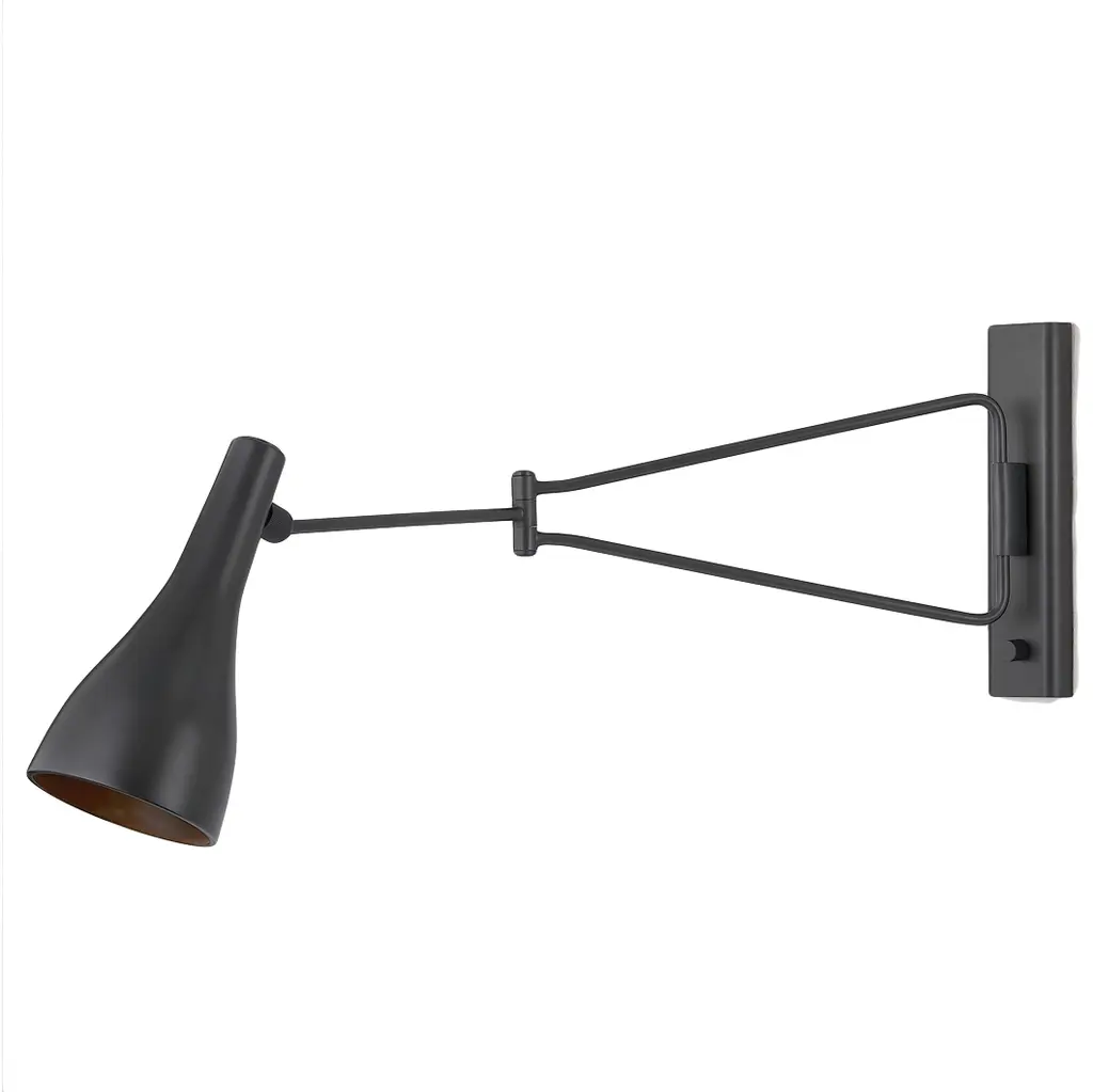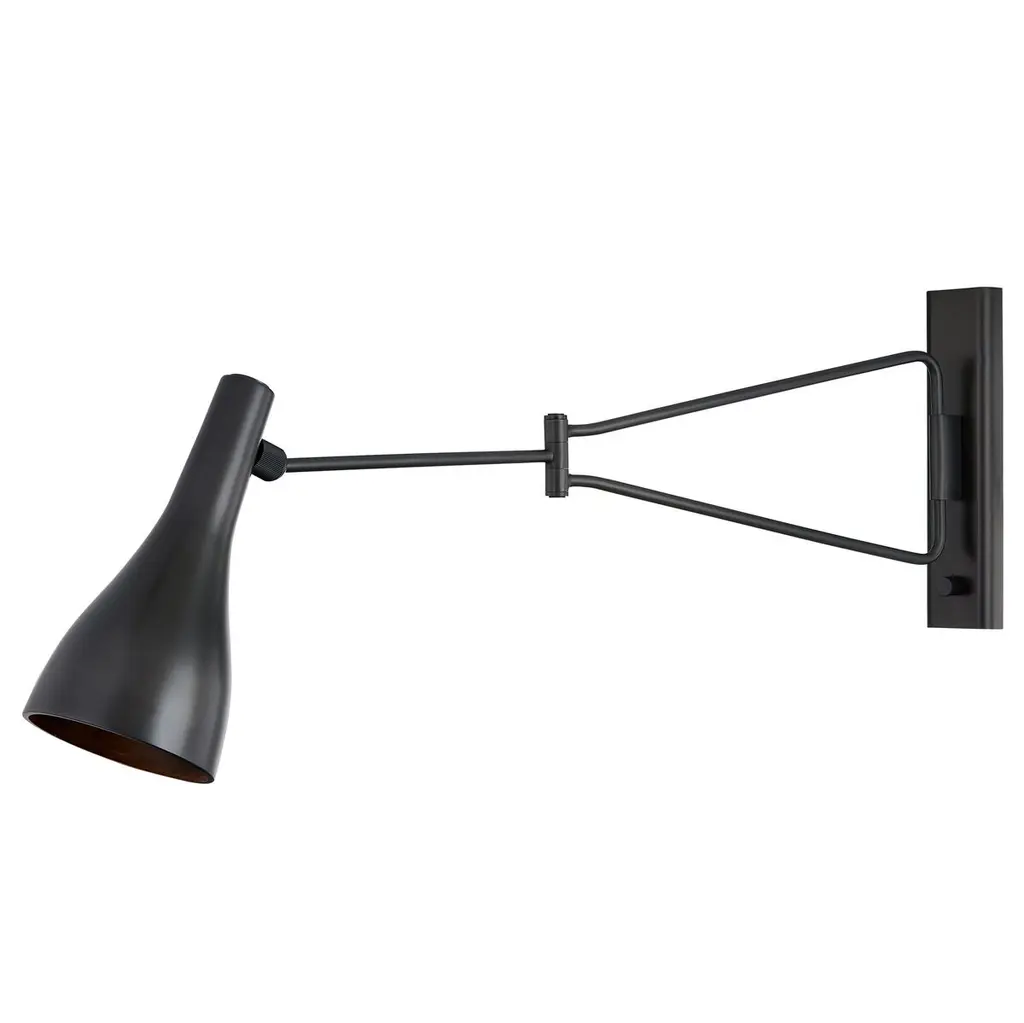 Inspired by mid-century design aesthetics, Vaela features a playful triangular arm and bell-shaped shade. The narrow backplate includes a dimmer switch that allows for precise adjustments in brightness. This fixture is perfect as a reading light above a sofa or lounge chair, or anywhere adjustable task lighting is required.