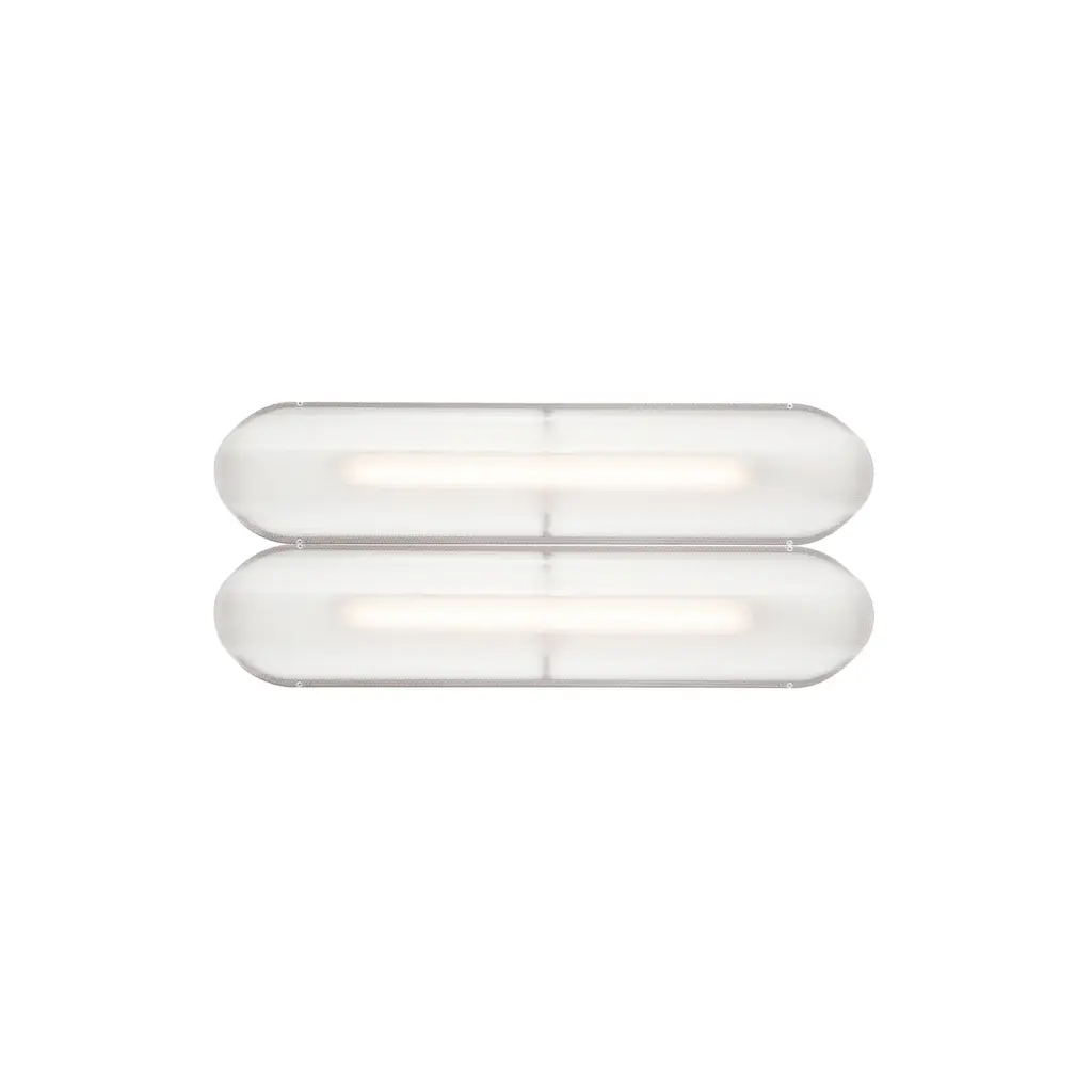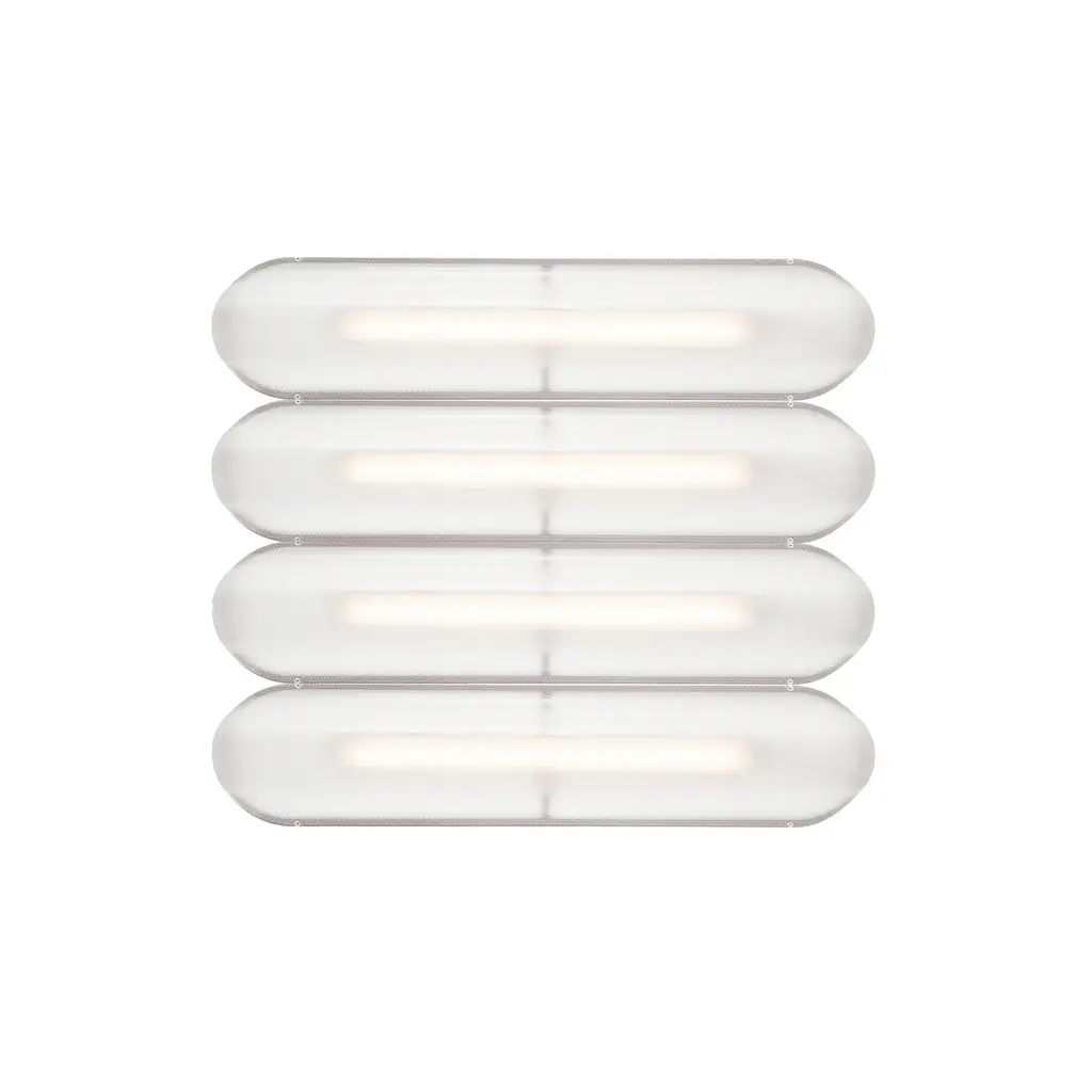 Designer Caine Heintzman's Vale System includes a horizontal version with multiples of the sculptural LED light in a stacked, side-by-side arrangement. Whether a single unit or layered up to 6 fixtures high, each flush-mounted light attaches to the wall or ceiling with a low-profile aluminum backplate in anthracite, silica, or rust finish. Fronted by a heat-molded acrylic lens with a textured surface, the prismatic effect glows with even ambient illumination.