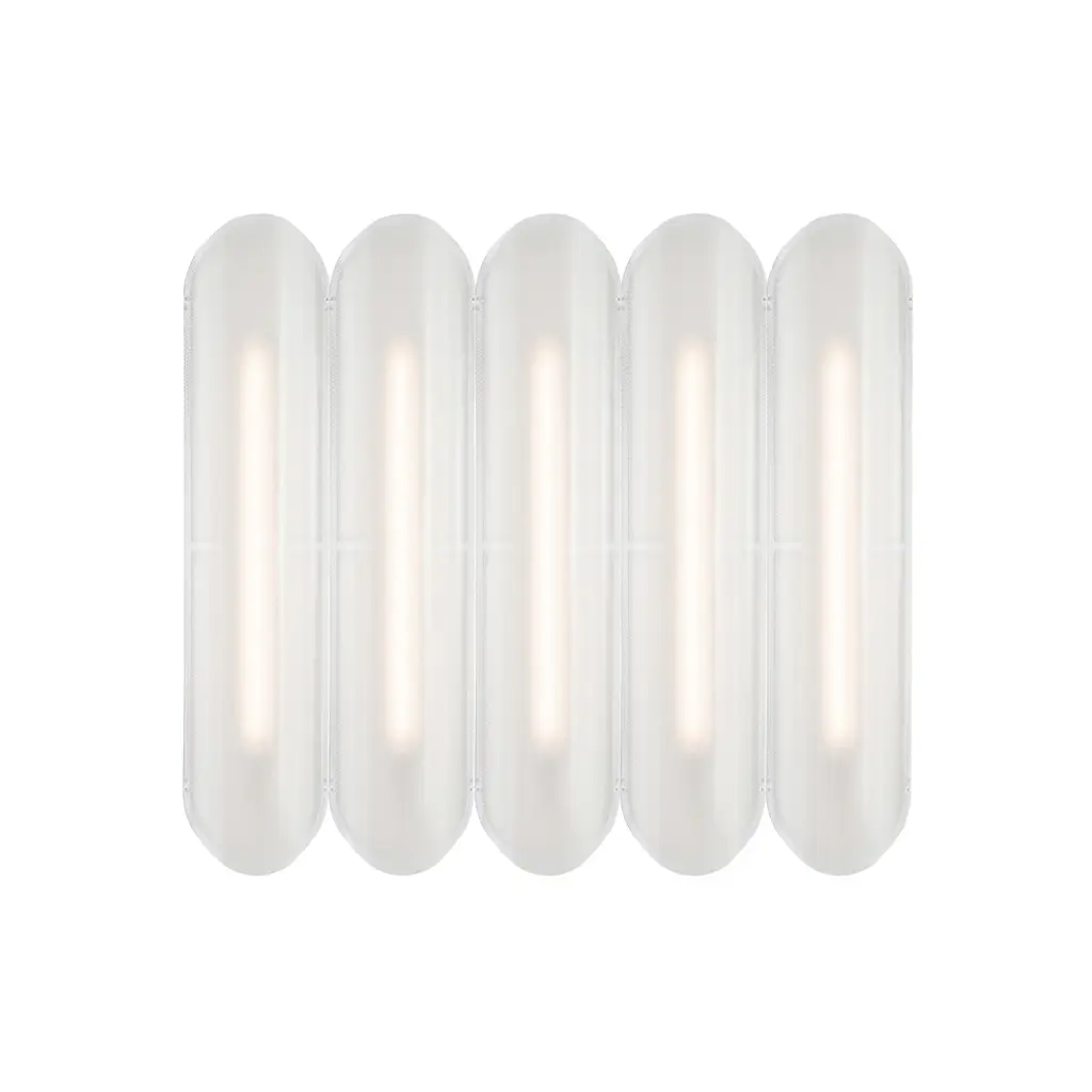 Vale from designer Caine Heintzman also comprises a vertically situated version featuring multiples of the sculptural LED light deployed side-by-side. From a sole model to an awesome bank of 6 fixtures, each light attaches flush to the wall or ceiling with a low-profile aluminum backplate in anthracite, silica or rust finish. The curving front in heat-molded acrylic with a textured surface creates a prismatic effect for softly glowing illumination.