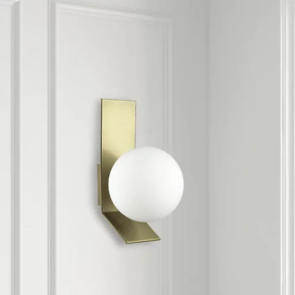 The Valemont Wall Sconce from Dainolite is a refined piece, giving one's home an artful and architectural silhouette. This sconce rests on the wall with a hidden backplate for a floating look. A rectilinear metal panel rests on top, angling forward to beautifully cradle the lamping. A globe shade rests at the base, charming like a bright pearl. Light scatters softly through the shade, translating to a soft glazing glow