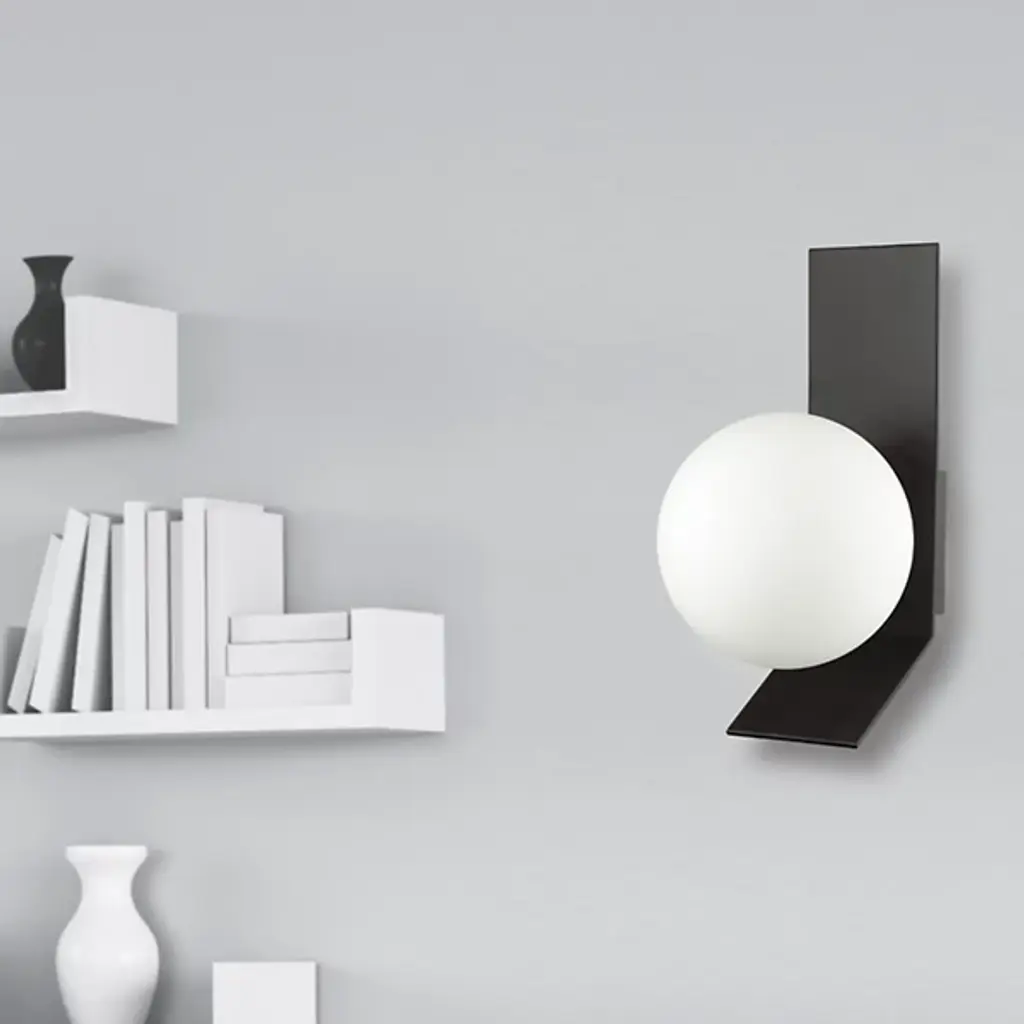 The Valemont Wall Sconce from Dainolite is a refined piece, giving one's home an artful and architectural silhouette. This sconce rests on the wall with a hidden backplate for a floating look. A rectilinear metal panel rests on top, angling forward to beautifully cradle the lamping. A globe shade rests at the base, charming like a bright pearl. Light scatters softly through the shade, translating to a soft glazing glow
