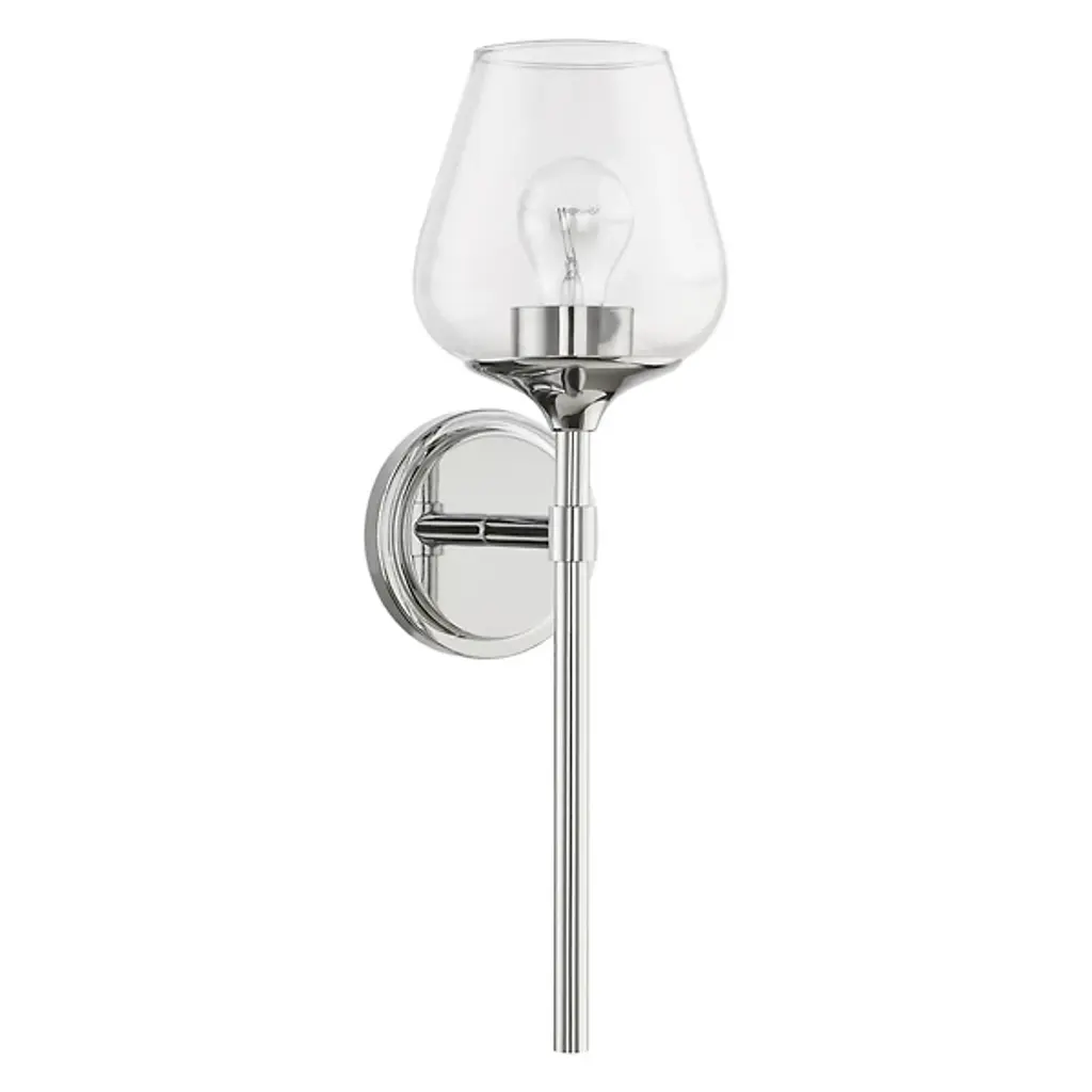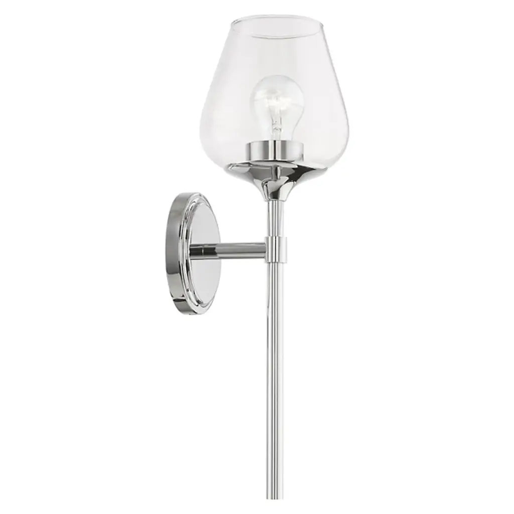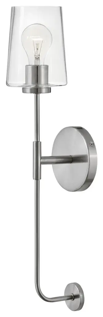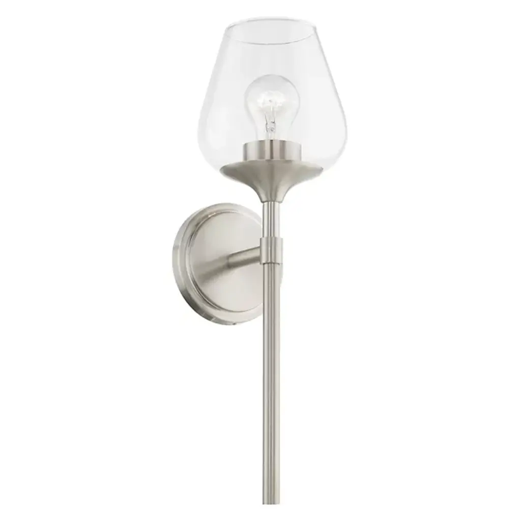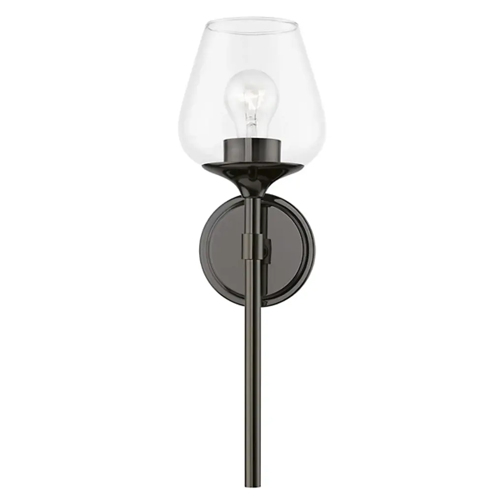 The Valentina Wall Sconce by Alder & Ore has understated elegance. It features minimal details and clear curved glass with and metal framework, bringing a transitional aesthetic to your home décor. This fixture’s incandescent lamp is supported by an ultra-slim arm. The neat contours of the glass shade gives this piece a look of refinement.