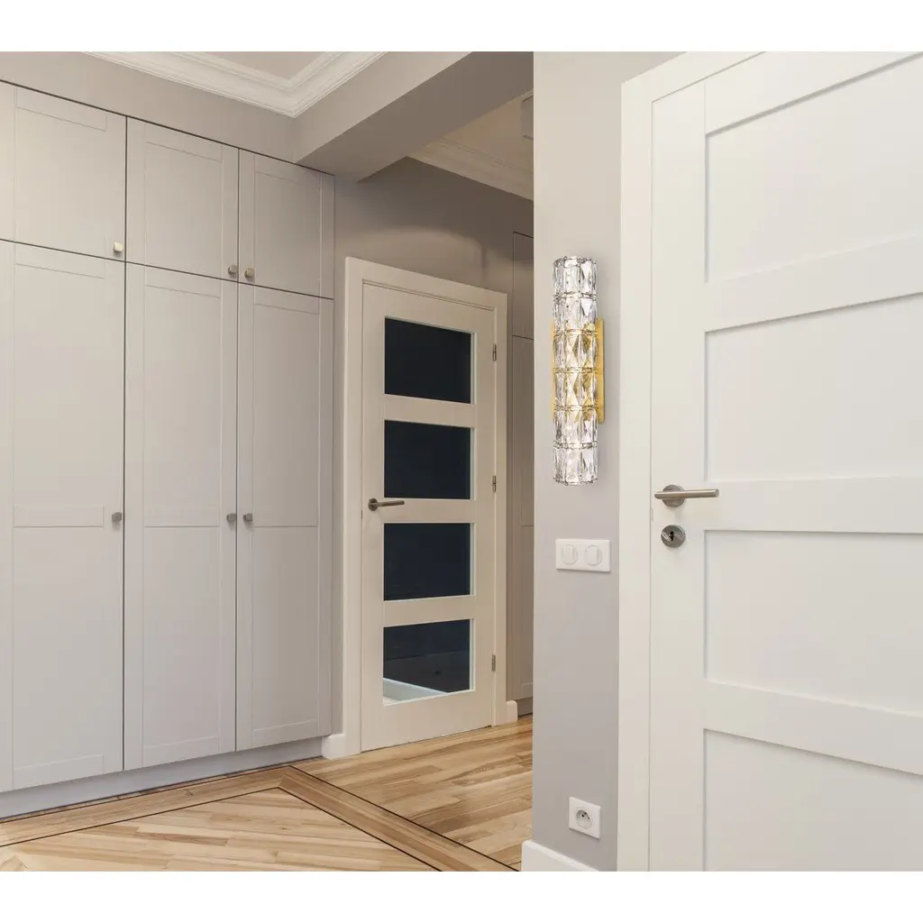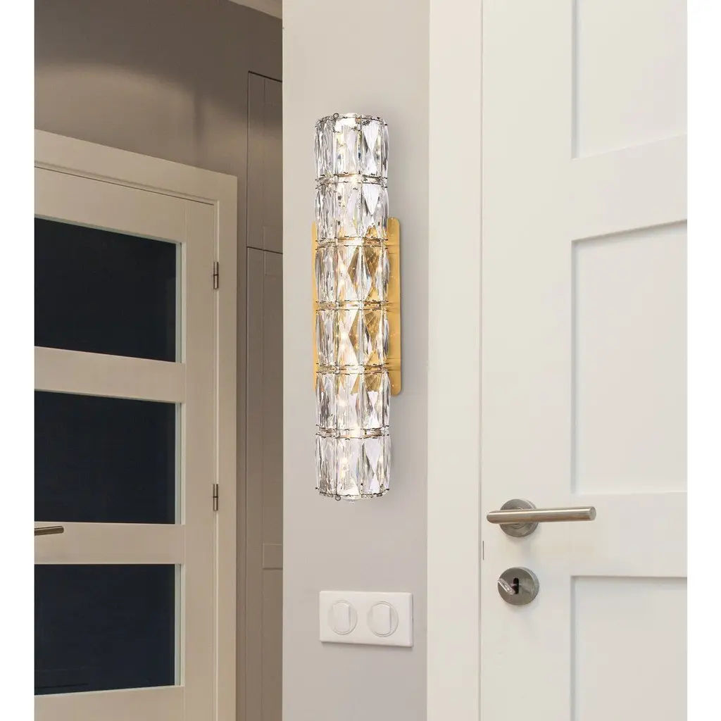 Valetta hanging fixtures dress up a living room, dining room, or bedroom without overwhelming the surrounding décor. This collection features an octagonal tube-shaped stainless-steel frame that’s covered almost entirely with shining rectangular clear crystals. A rectangular mounting plate is connected to the frame by slender cables that keep everything secure. A sleek metal finish completes this modern look with warm led lighting. Available in three sizes.