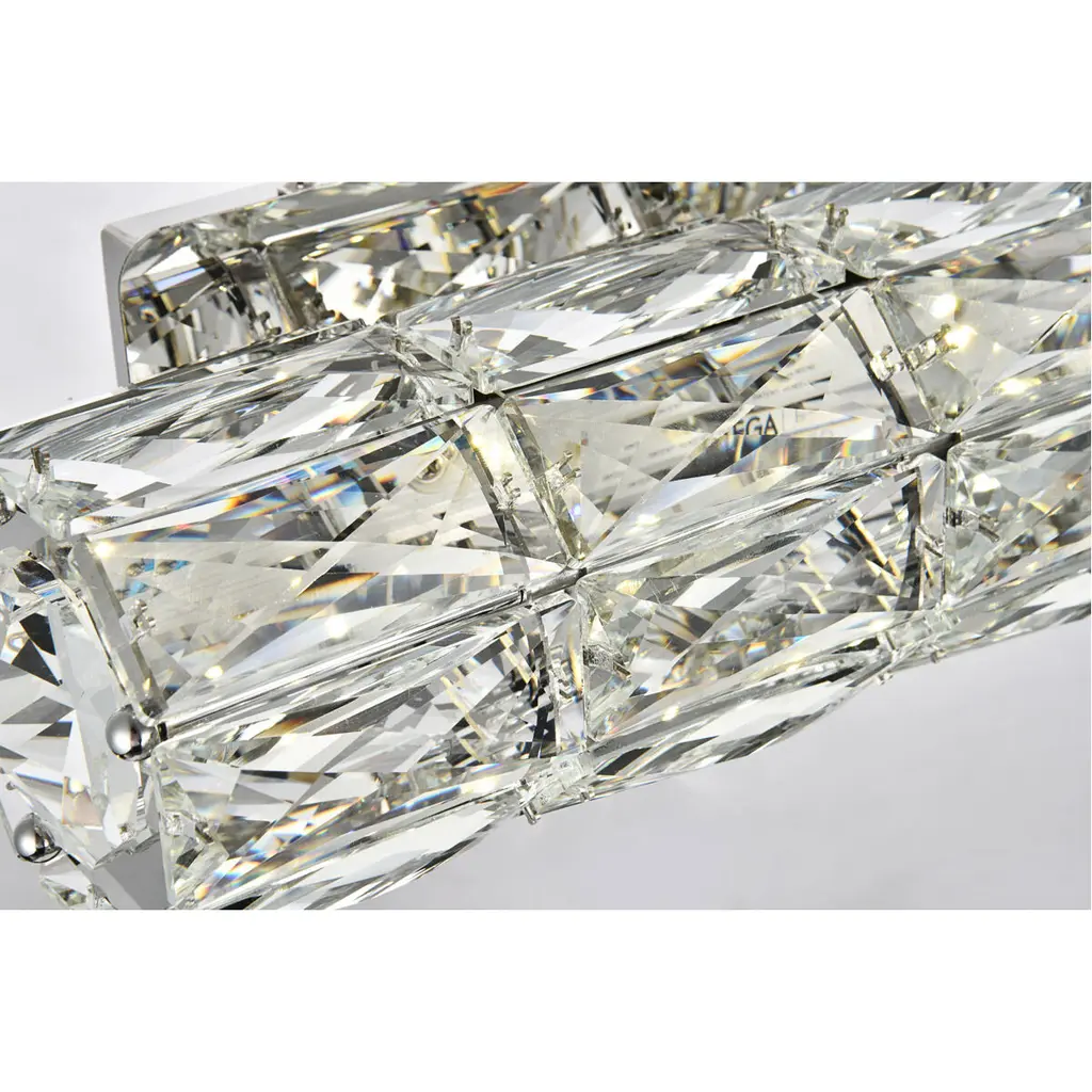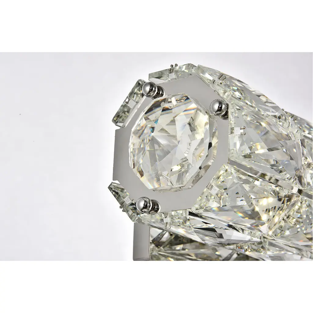 Valetta wall sconces dress up a bathroom, office, or bedroom without overwhelming the surrounding décor. This collection features an octagonal tube-shaped stainless-steel frame covered almost entirely with shining rectangular royal-cut clear crystals. Faceted crystal octagonal crystals cover both ends as a charming finishing touch. The chrome-finished backplate is polished to a mirror shine and reflects the glittering crystals for additional sparkle. A sleek chrome finish completes this modern look. Available in four size options.