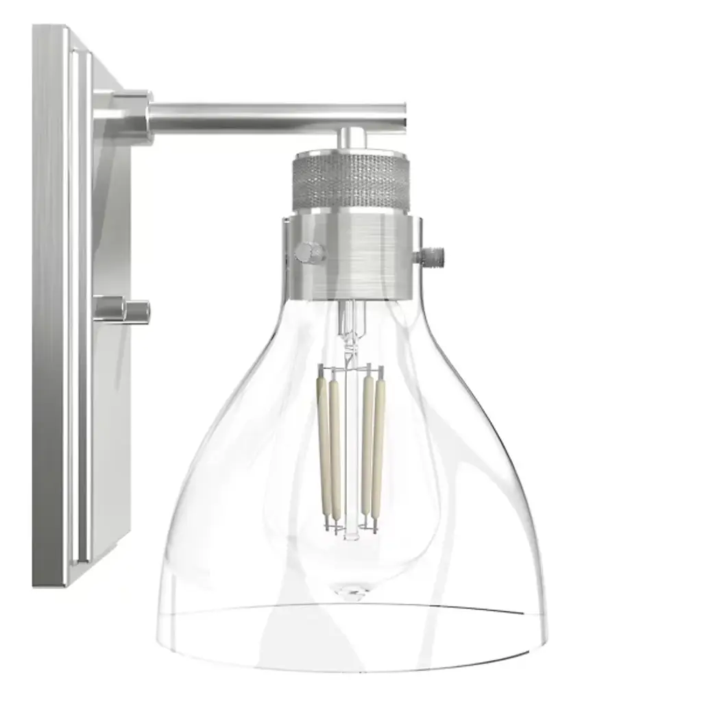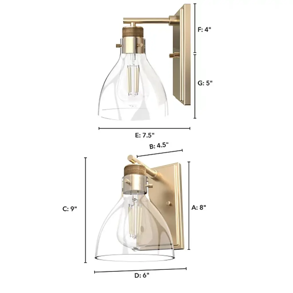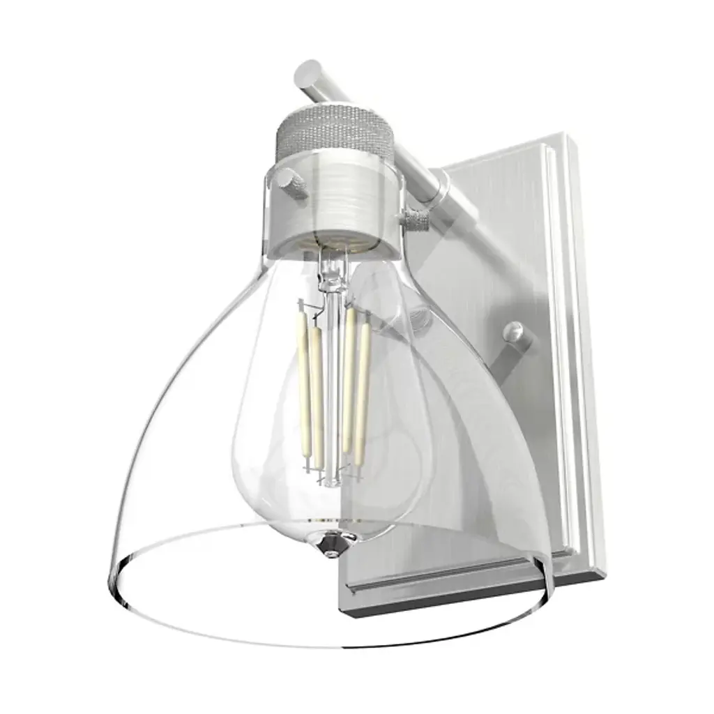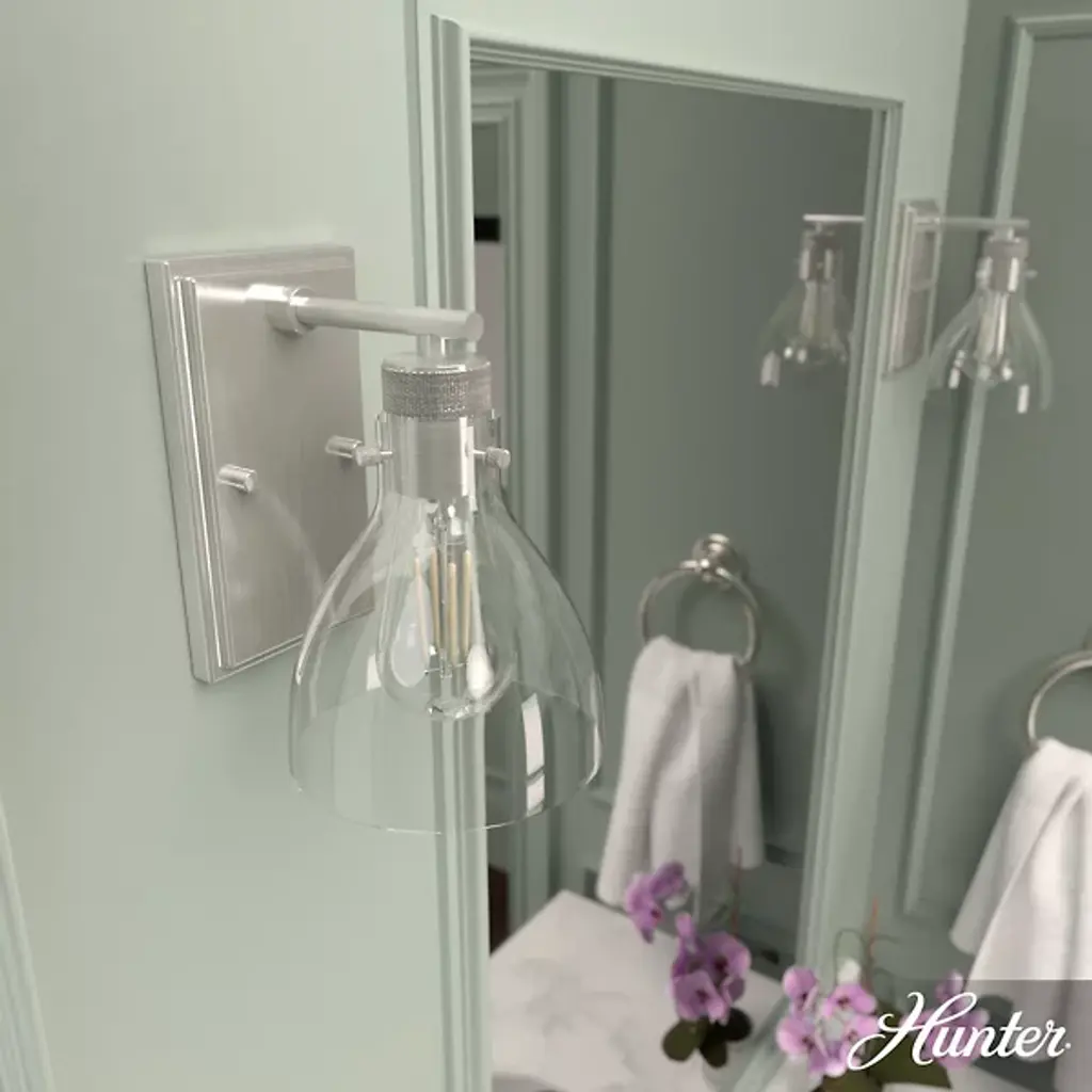 The Van Nuys Wall Sconce by Hunter Fans is a tailored addition to spaces with some vintage flair. Elegant in its simplicity, this wall sconce is anchored by a rectangular backplate and supports a crisp, flared glass shade from a single arm. A knurled socket and some industrial detailing add a thoughtful touch to this handsome design as it houses a single, visible bulb within that offers plenty of illumination to its surroundings.