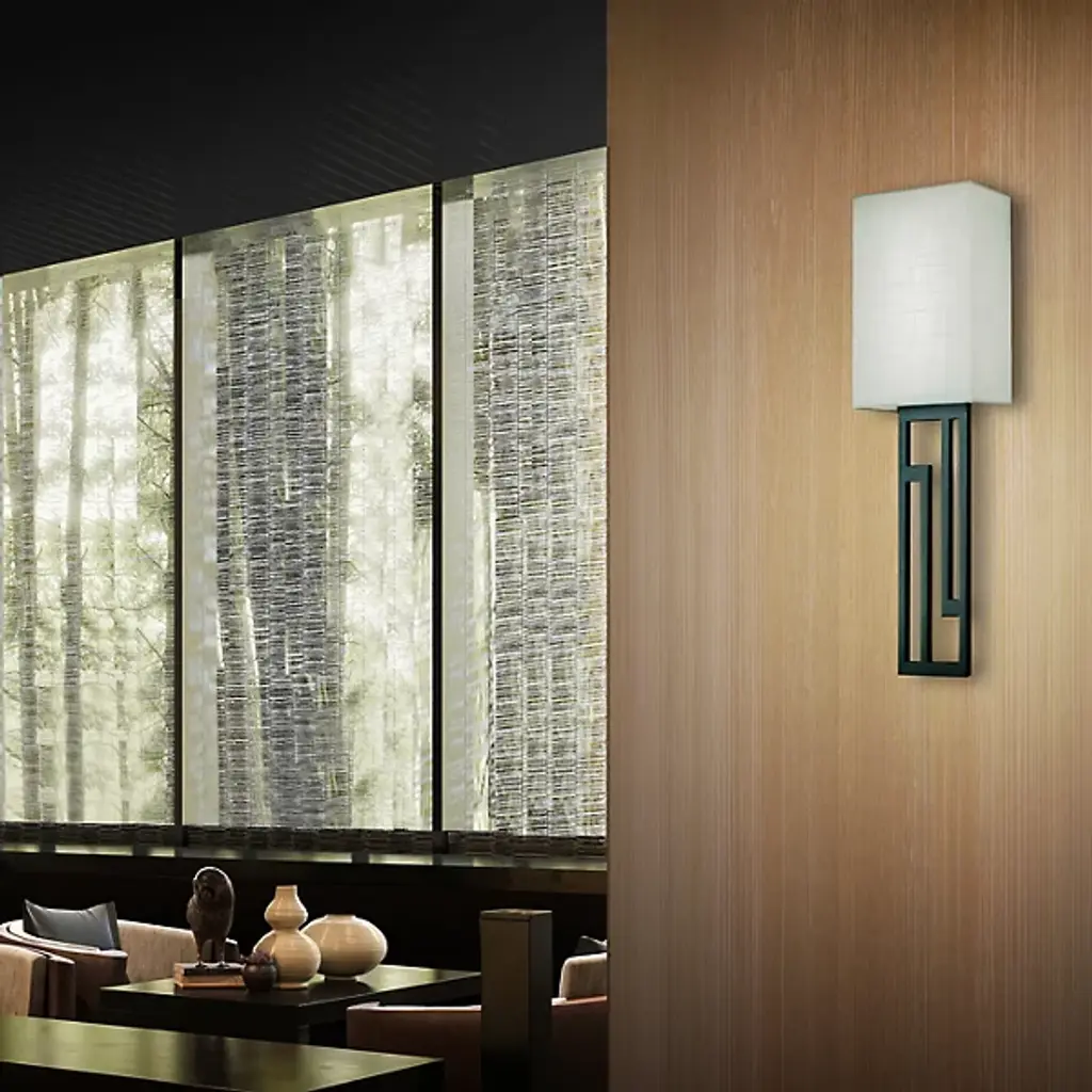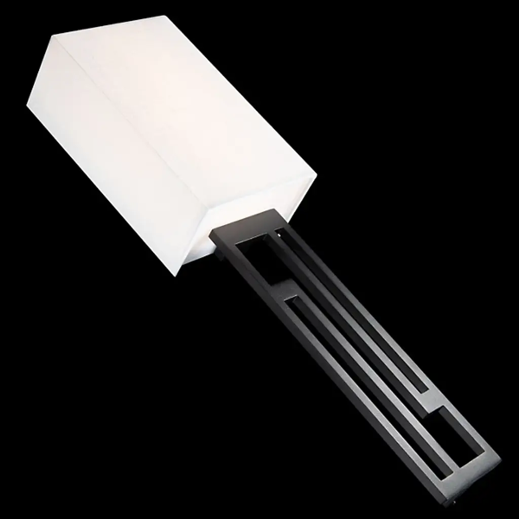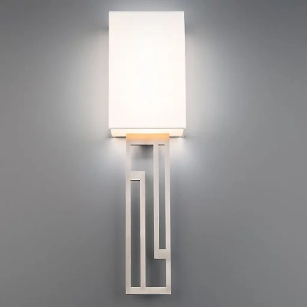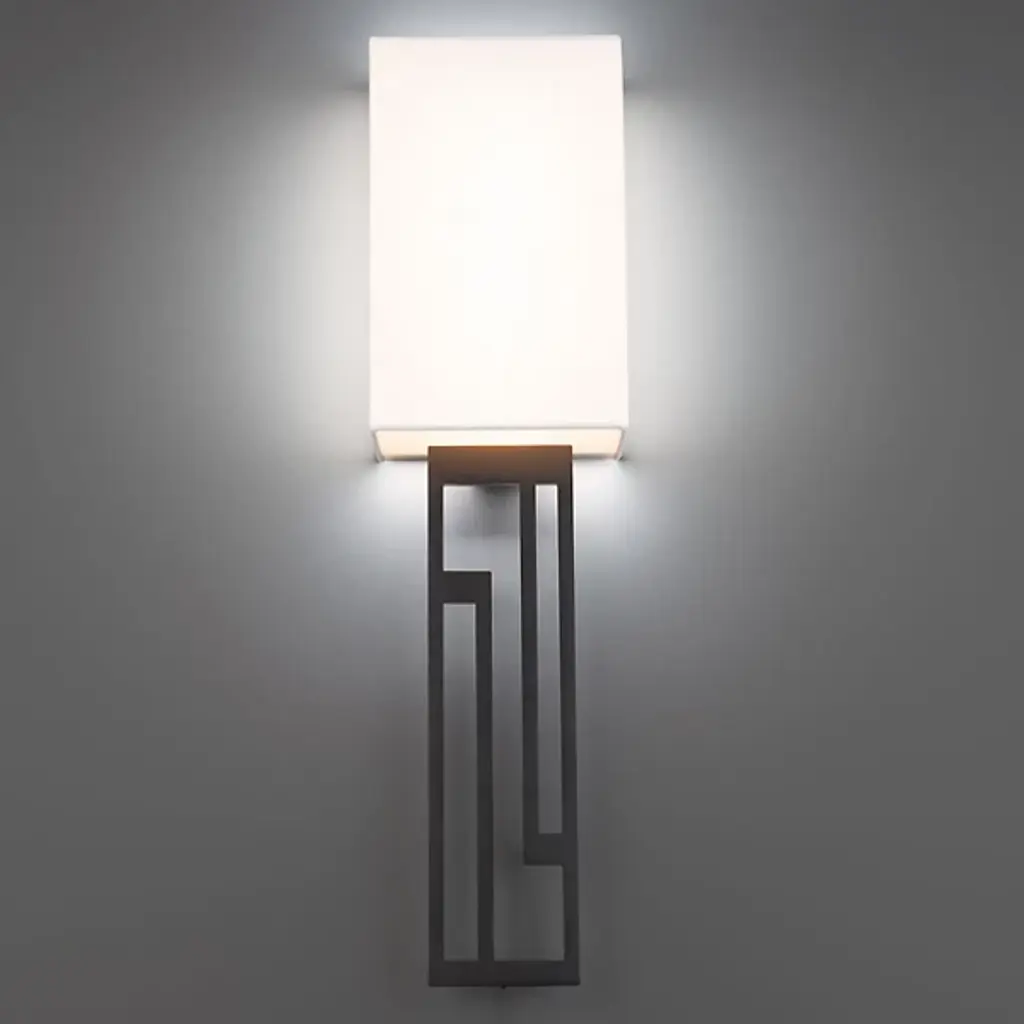 Add a luxurious, expressive luminance to inside walls with the svelte and engaging lines of the Vander LED Vertical Wall Sconce from Modern Forms. A slim rectangular plate in robust aluminum holds the fixture’s lamping, contrasting bracket-style patterns with echoing cutouts. The lamping is efficient and ADA-compliant, mellowed by a polycarbonate diffuser and a rectangular shade of woven fabric. The shade structure contrasts well with the structure below, creating a character at once artistic and functional.