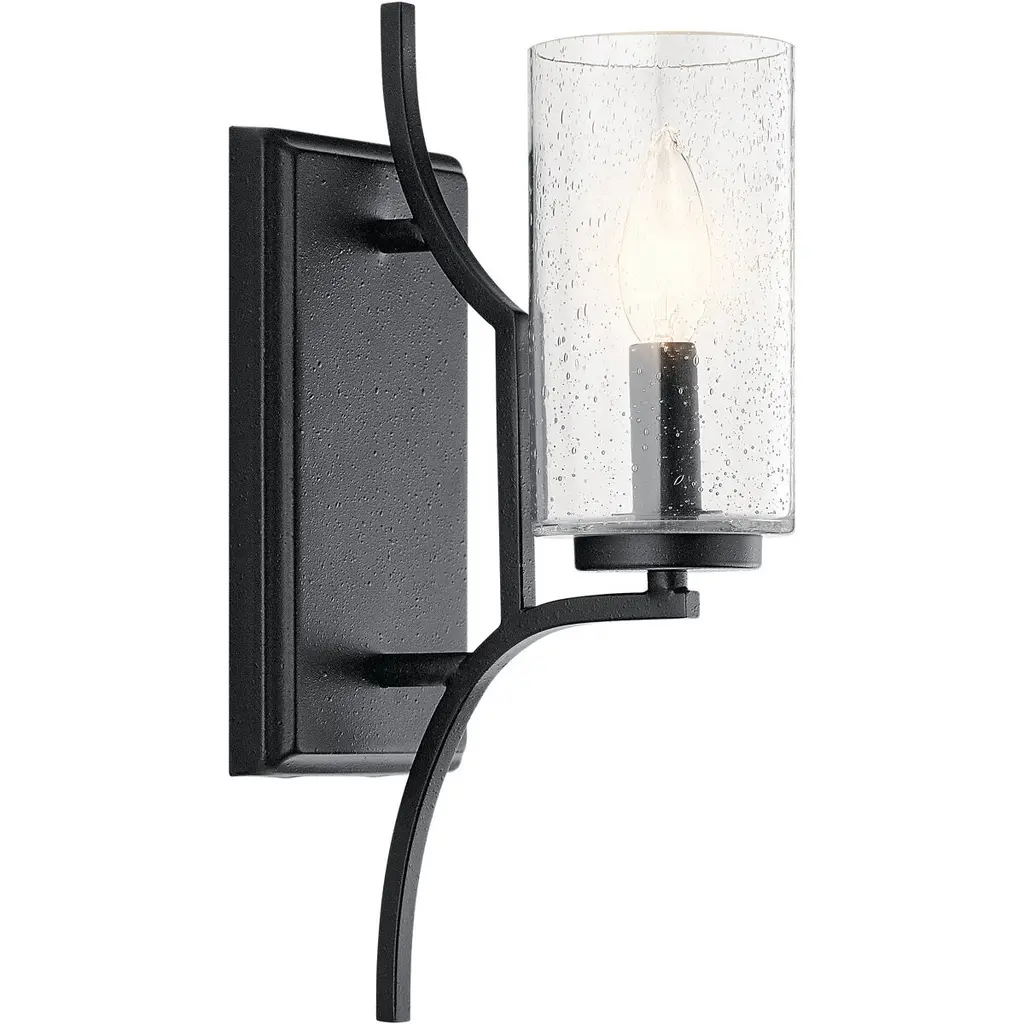 A popular mission fixture gets the designer touch with the 1-light wall sconce in Distressed Black from the Vara collection. The sturdy ironwork supports feature linear detailing and the glass shades have a seeded effect, helping to soften the overall traditional masculine look.