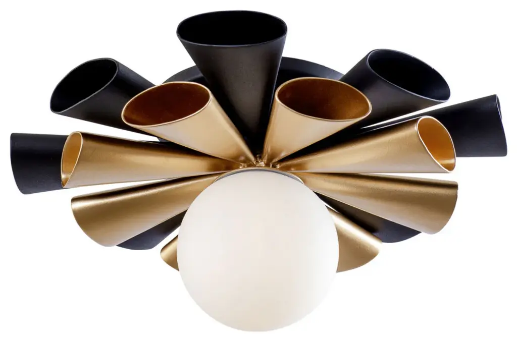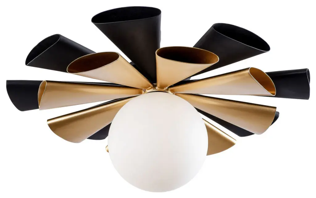 One Light Convertible Flush Mount/Wall Sconce from Daphne collection in Matte Black/French Gold finish. Number of Bulbs 1. Max Wattage 60.00 . No bulbs included. Taking its cues from the Ryan NYP Spirit of St. Louis, the plane used on the first solo flight across the Atlantic, our Daphne collection takes you on an inspirational flight of the imagination. The gold and black fins on this dynamic design are inspired by the radial engine that powered the aircraft on its record setting flight. Fun fact: the Daphne name is taken from a photo of a woman named Daphne observing a placard honoring the event. No UL Availability at this time.