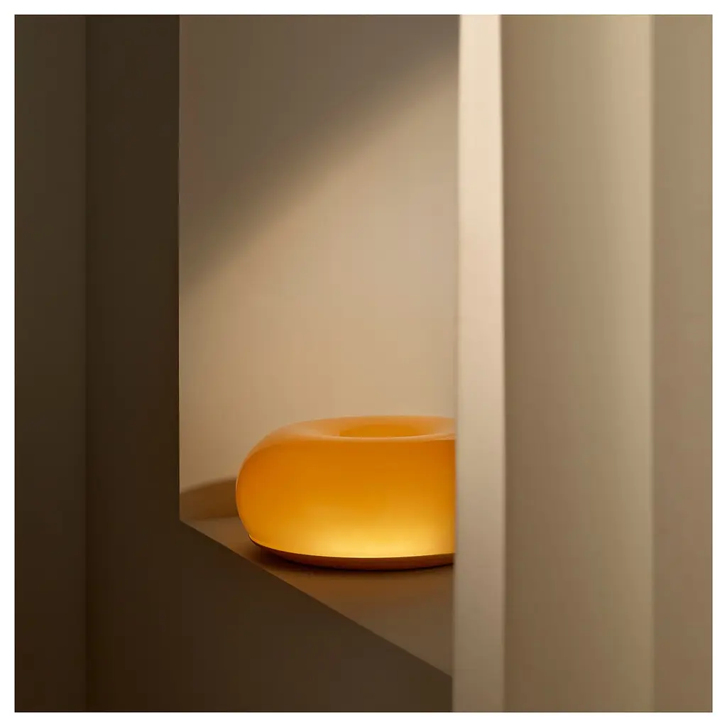 VARMBLIXT LED table/wall lamp - orange glass/round 12 ". Creates a soft, cozy mood light in your home. Table lamp or wall lamp – you can decide since the lamp can also be mounted on the wall. You never have to change a light bulb as this lamp has LED light sources built right into it.
