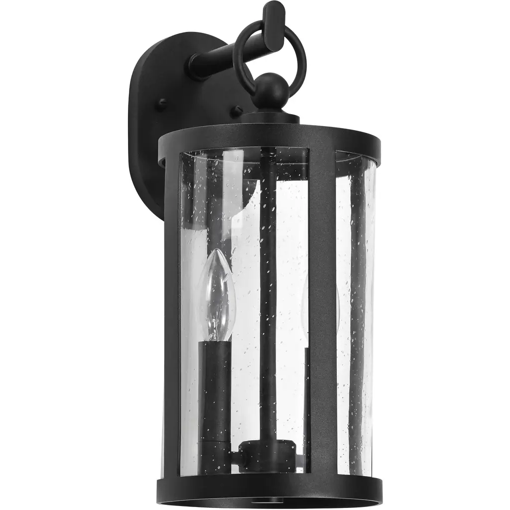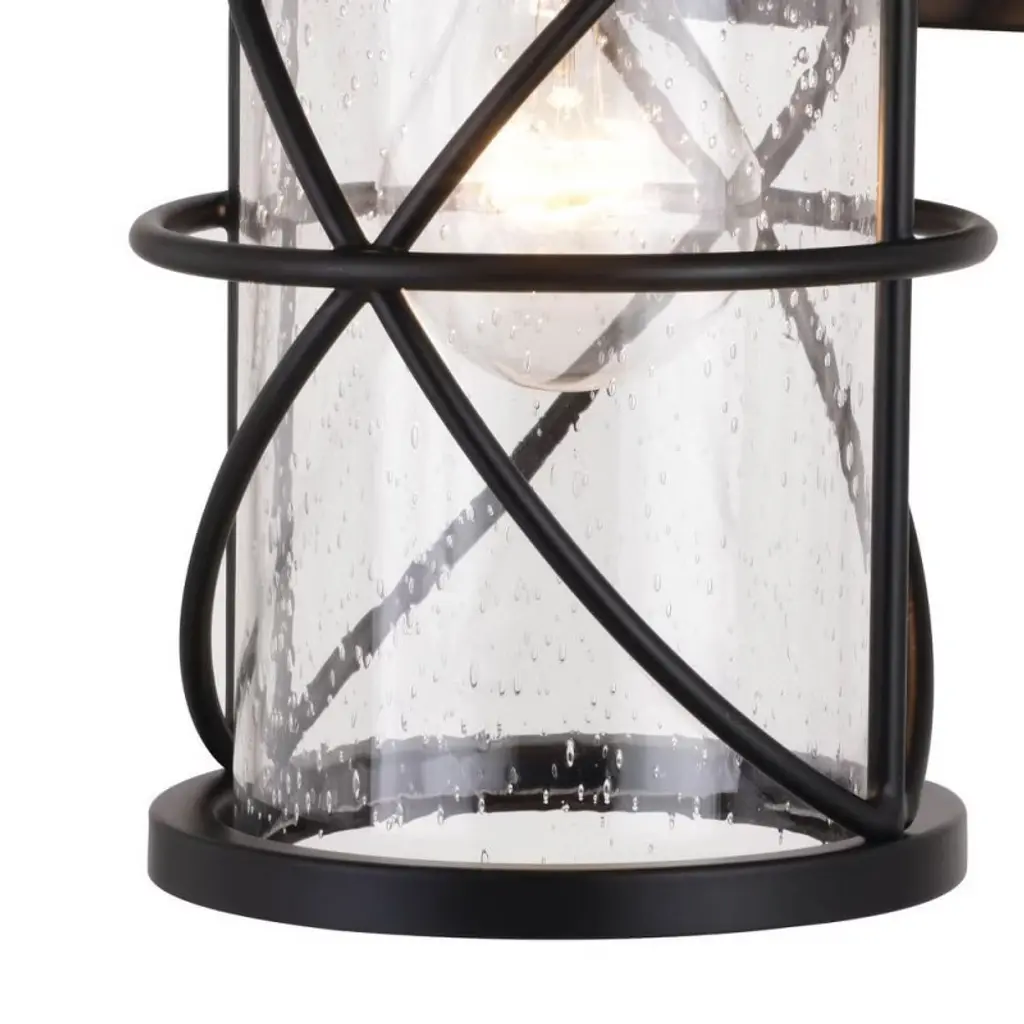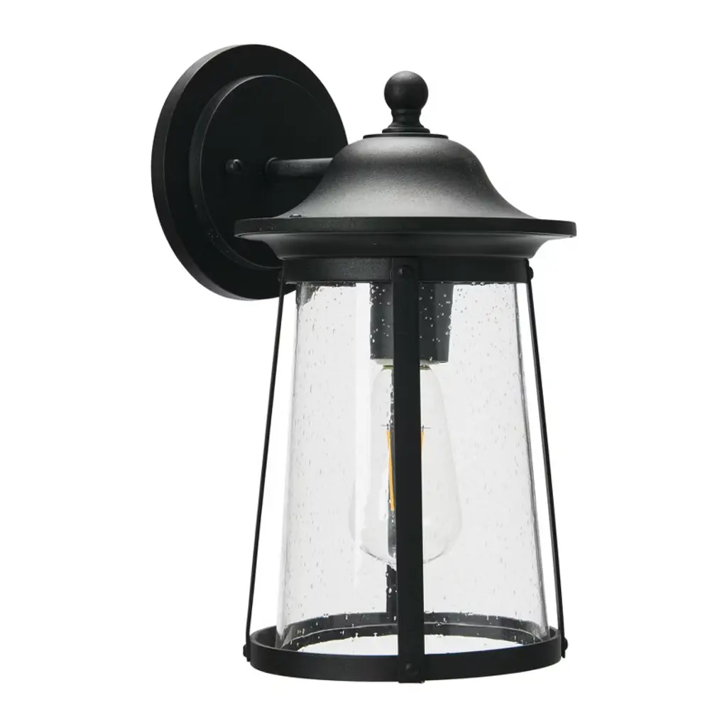 Collection: Adams, Material: Steel, Finish Color: Black, Width: 5.5", Height: 12", Depth: 6.75", Height From Outlet Box: 4.5", Backplate Width: 4.72", Backplate Length: 4.72", Lamping Type: Incandescent, Number Of Bulbs: 1, Wattage: 60 Watts, Dimmable: Yes, Moisture Rating: Wet Rated, Desc: The Adams collection brings a lighthearted style to a traditional lantern. Cylindrical seeded glass is topped off with a strong black cap, as it hangs from a solid curved hook. Slim black lines crisscross around the glass drawing the eye up and around its shape. This outdoor wall light is ideal for your porch, entryway, garage, or any other area of your home. Dusk to dawn photo cell automatically turns fixture on in the dark and off in the light for added safety and security, saving energy during daylight hours / Weather resistant steel material provides long lasting durability / Clear seeded glass provides bright illumination and a traditional feel / Uses 1 x 60 watt E26 medium base bulb (not in