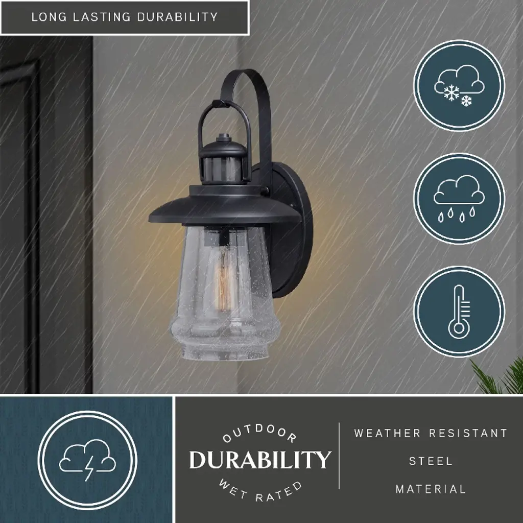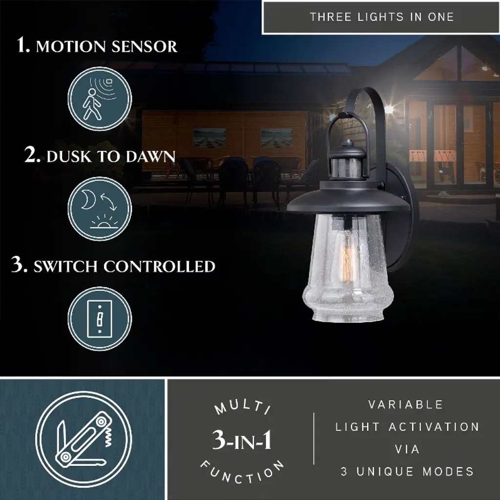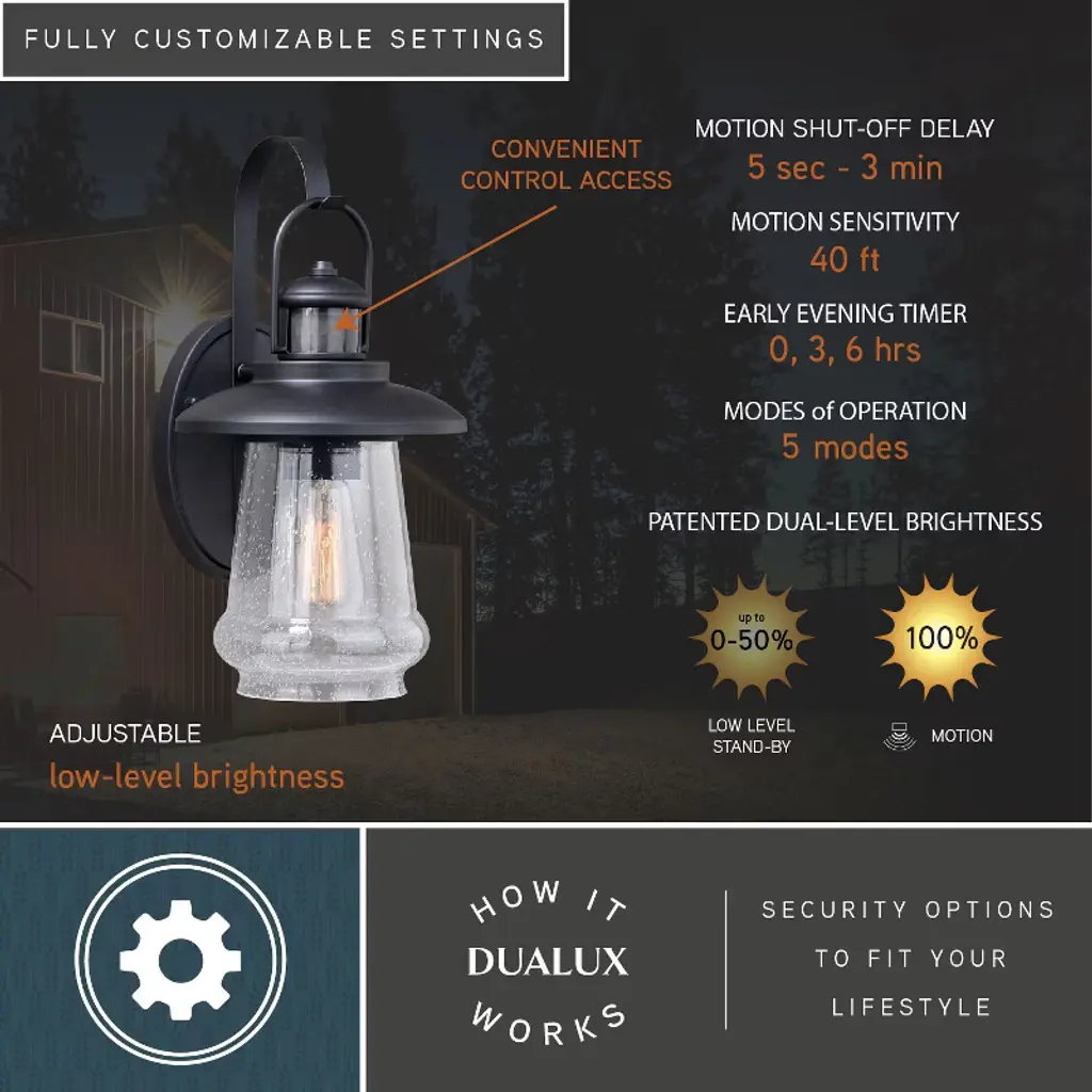 A modern take on a traditional nautical lantern, the Bridgeport takes a classic New England style and makes it better. This outdoor coastal collection combines an oil rubbed bronze finish with clear seeded glass. Combine that with a vintage Edison style filament bulb to complete the look. Dualux dual-level outdoor security lighting is designed to fit your lifestyle and enhance the beauty, safety, and usability of your home's exterior areas. Enjoy the comfort and convenience of continuous bright illumination during the early evening hours with automatic dimming late at night to provide soft, ambient illumination until dawn. Rest assured knowing that whenever motion is detected, on-demand bright illumination will be triggered to keep your property safe and secure. This fixture works with most dimmable LED bulb models. You get convenience, security, and efficiency with Dualux outdoor light fixtures.