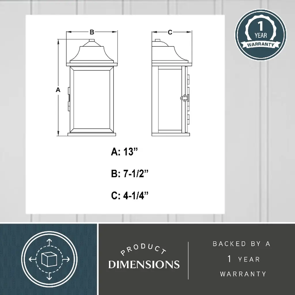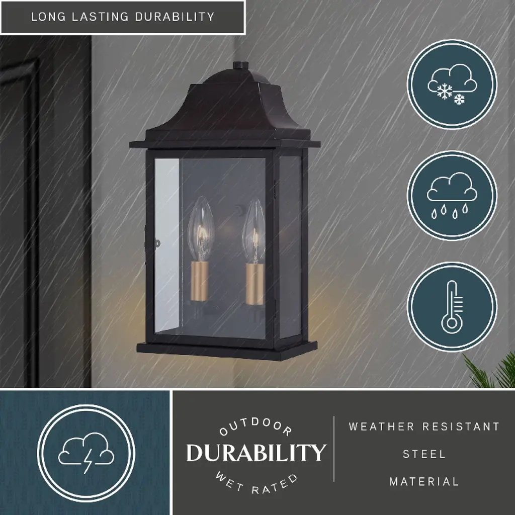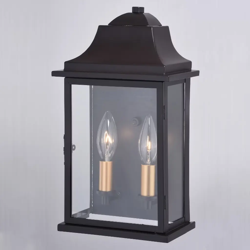 Sleek and handsome perfectly defines the Bristol collection's fresh take on a two-tone colonial-style lantern. The dark oil rubbed bronze finish contrasts with the light gold candle sticks to create a warm welcome. A hinged front panel allows for easy access when changing the bulb. This outdoor wall light is ideal for your covered porch, entryway, garage, or any other area of your home.