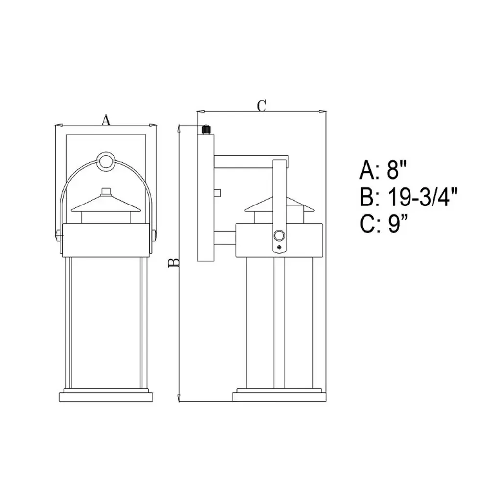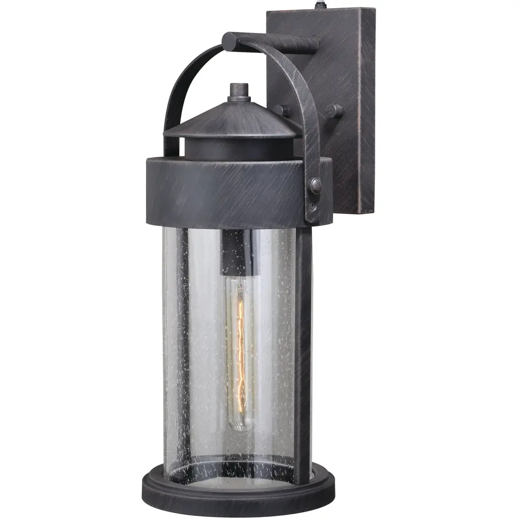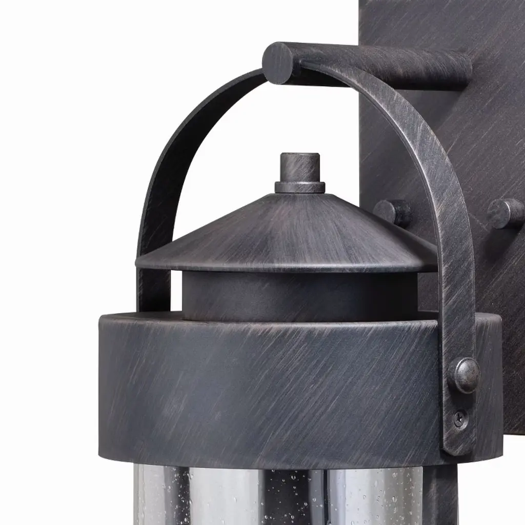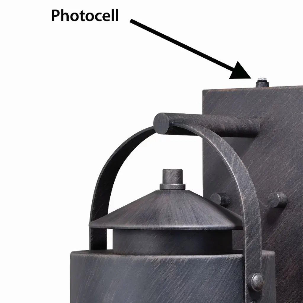 Collection: Cumberland, Material: Steel, Finish Color: Rust Iron, Width: 4.5", Height: 8", Depth: 4.75", Height From Outlet Box: 3.75", Backplate Width: 4.57", Backplate Length: 5.9", Lamping Type: Incandescent, Number Of Bulbs: 1, Wattage: 60 Watts, Moisture Rating: Wet Rated, Desc: The Cumberland outdoor collection highlights a modern twist on a classic lantern design. This wall lights, pendants or flush mounts features the very popular clear seeded glass and when paired with a vintage bulb are the perfect throwback light source for your homes exterior. Dusk to dawn photo cell automatically turns fixture on in the dark and off in the light for added safety and security, saving energy during daylight hours. Assembly Required: Yes / Back Plate Height: 5.90 / Back Plate Width: 4.57 / Bulb Shape: A19 / Shade Included: Yes. ,