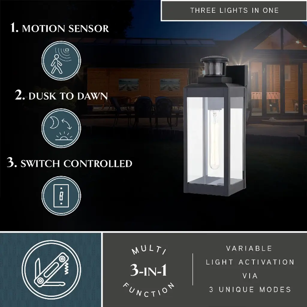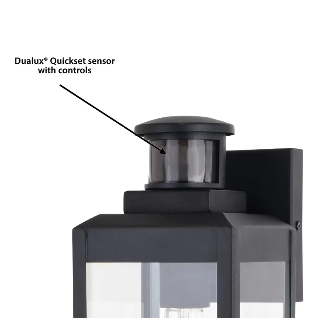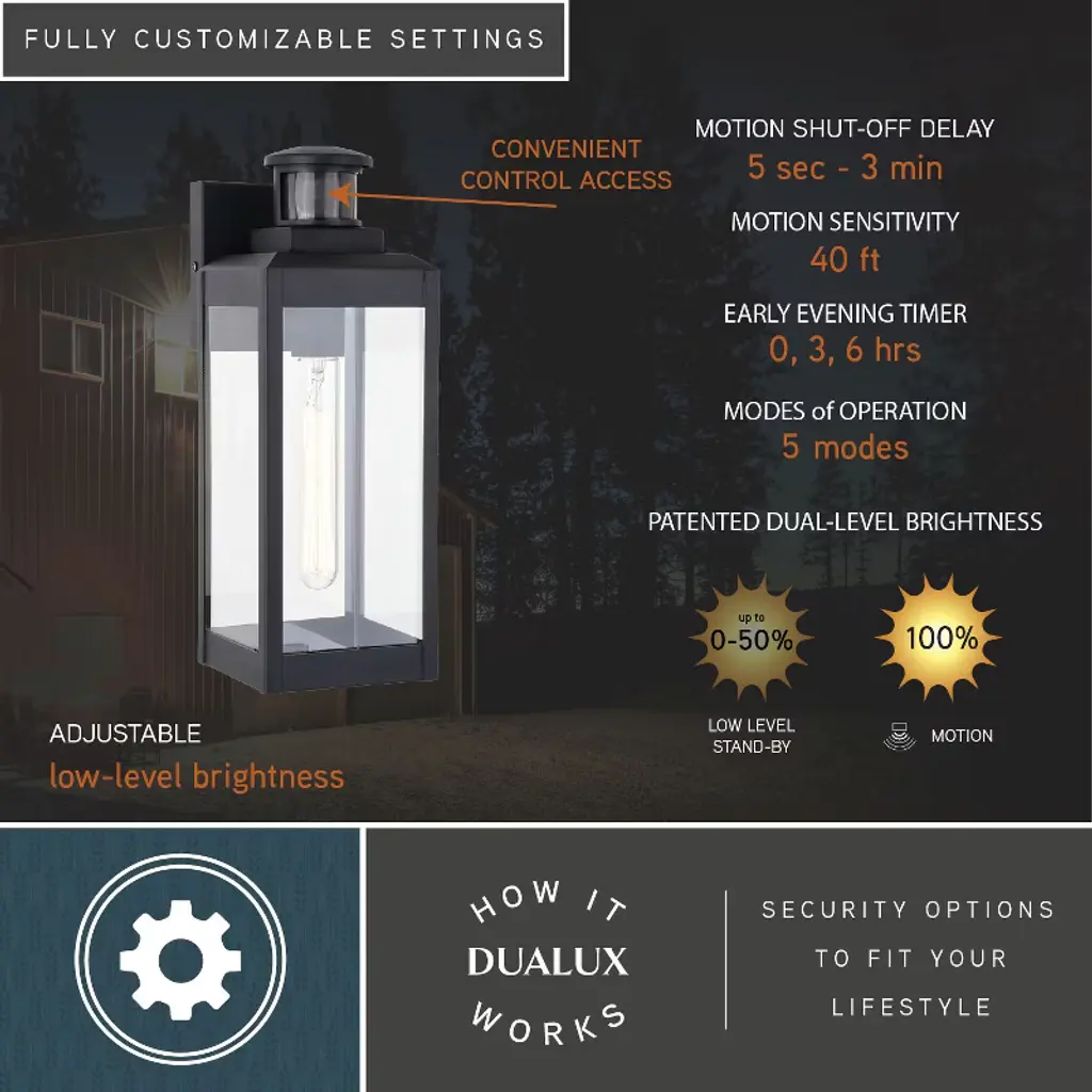 Elongated, slim, clear glass panels frame the Kinzie for a clean, contemporary feel. Finished in textured black, the Kinzie creates a bold but understated look perfect for highlighting your space. This outdoor wall light is ideal for your covered porch, entryway, garage, or any other area of your home. Dualux patented dual-level security lighting is outdoor lighting made smarter, brighter light at dusk, dimmer at night, brightening instantly when it detects motion. Designed to reliably and effortlessly enhance your home's beauty, security and efficiency from dusk to dawn with its built in motion sensor and photocell. This fixture works with most dimmable LED bulb models.