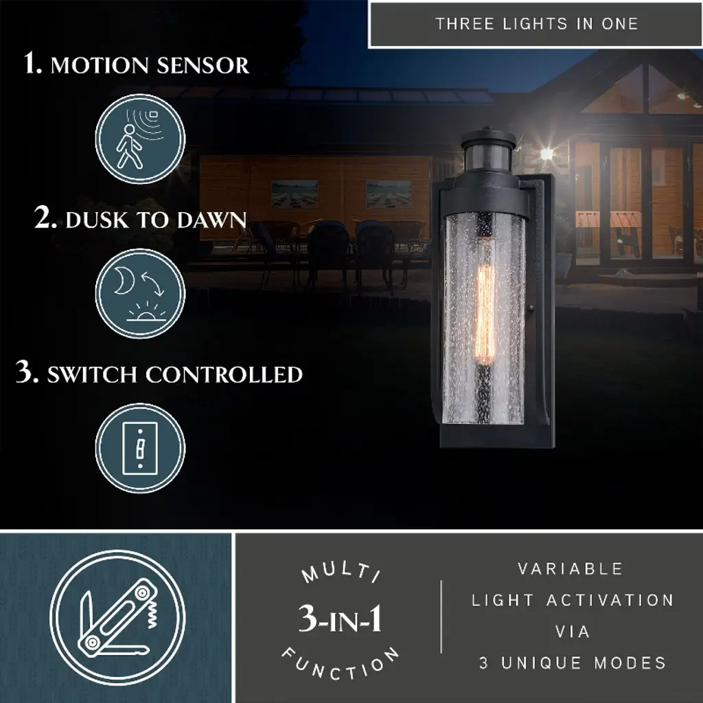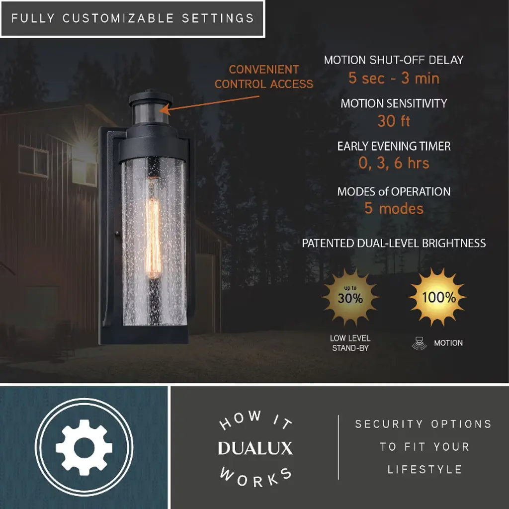 off motion detection or full brightness dusk-to-dawn modes are also available to try using the EZSET controls. This fixture works with most dimmable LED bulb models. You get convenience, security, and efficiency with Dualux outdoor light fixtures.