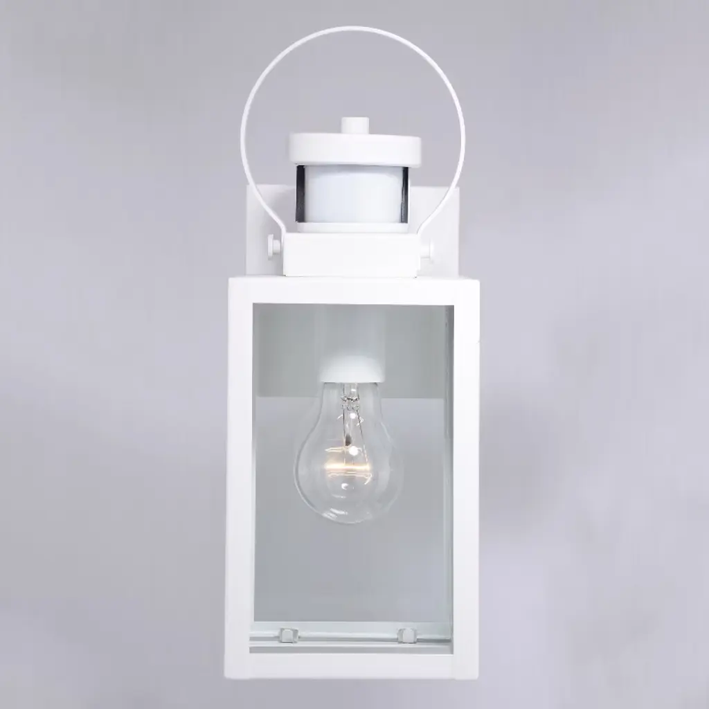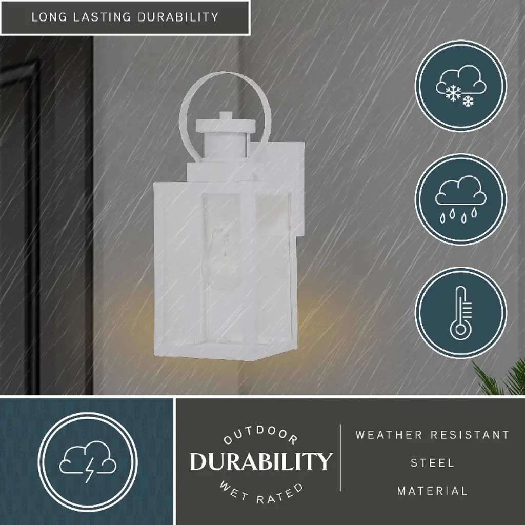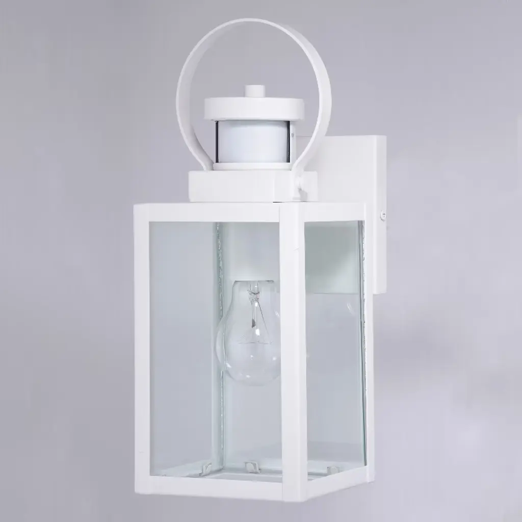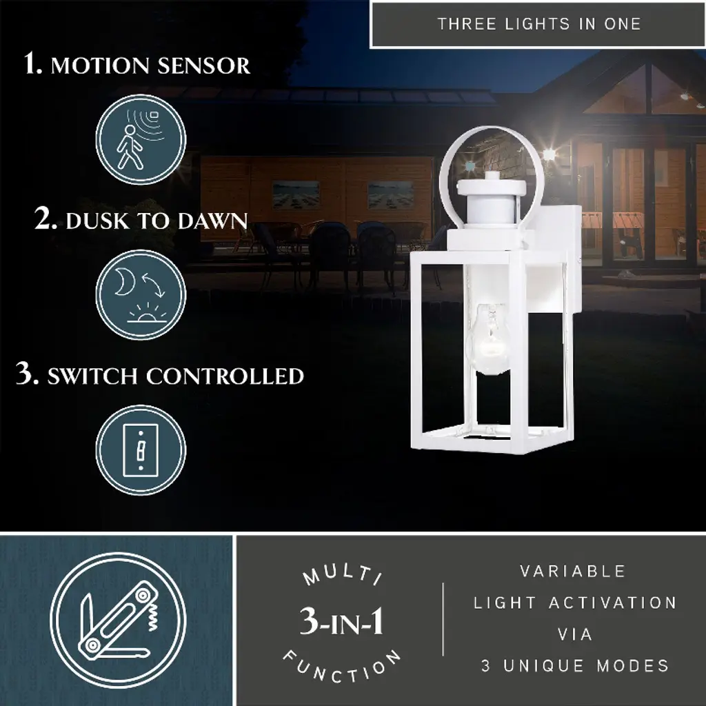 The Medinah is an example of classic minimalist elegance. Large panes of clear glass are framed by textured white frames. The top looped lantern handle adds an additional focal point to the overall design. This outdoor wall light is ideal for your covered porch, entryway, garage, or any other area of your home. This fixture combines a motion sensor, dusk to dawn photocell, and timer all in one decorative light. Our easy access quick-set control puts all these features at your fingertips. Enjoy bright illumination (0-6 hours) during the early evening hours with automatic, energy saving dimming until dawn. Whenever motion is detected, bright light keep your property safe and secure. It works with most dimmable LED bulb models. This outdoor security light is designed to enhance the beauty, safety, and efficiency of your home.