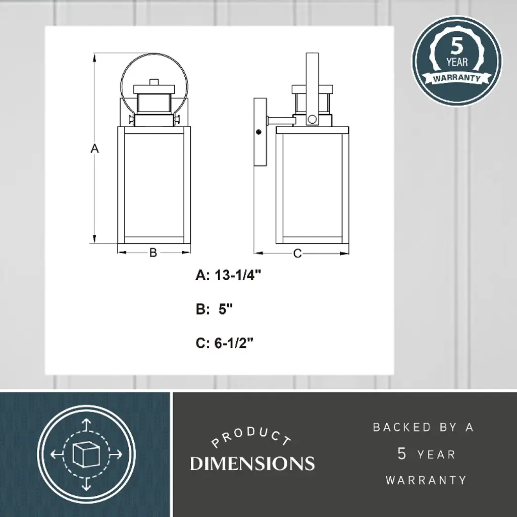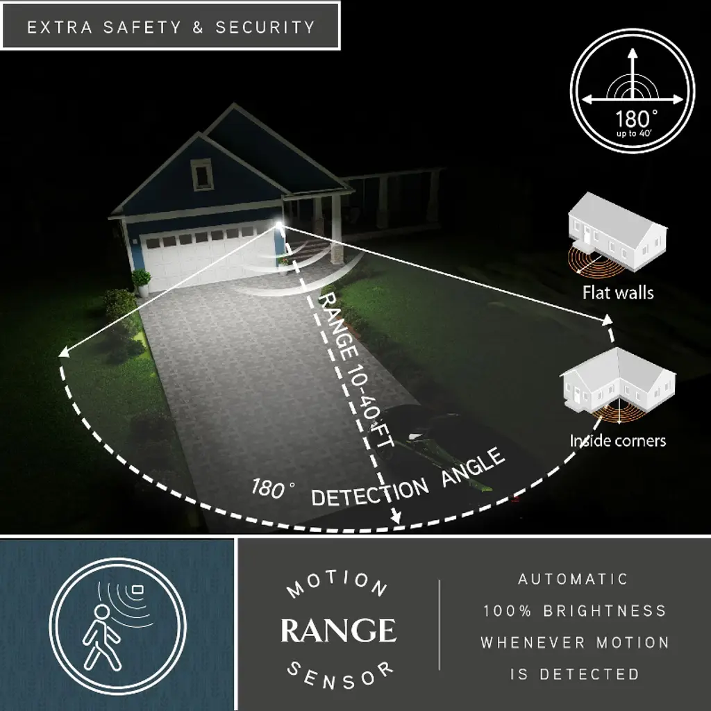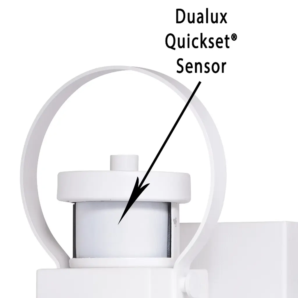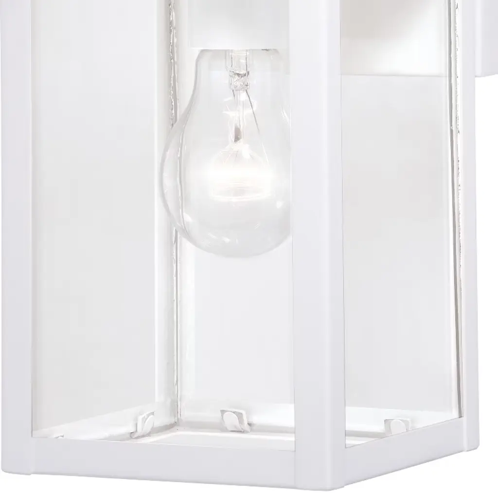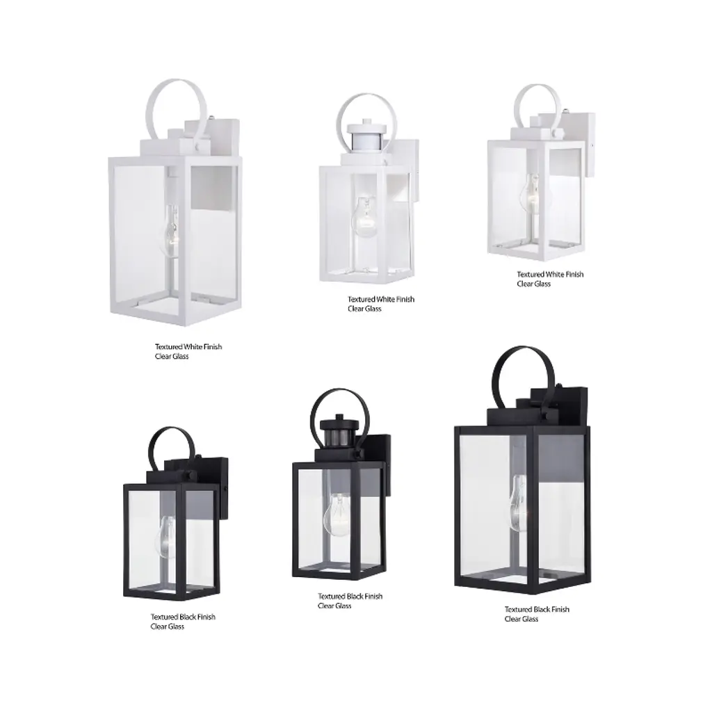 The Medinah is an example of classic minimalist elegance. Large panes of clear glass are framed by textured white frames. The top looped lantern handle adds an additional focal point to the overall design. This outdoor wall light is ideal for your covered porch, entryway, garage, or any other area of your home. This fixture combines a motion sensor, dusk to dawn photocell, and timer all in one decorative light. Our easy access quick-set control puts all these features at your fingertips. Enjoy bright illumination (0-6 hours) during the early evening hours with automatic, energy saving dimming until dawn. Whenever motion is detected, bright light keep your property safe and secure. It works with most dimmable LED bulb models. This outdoor security light is designed to enhance the beauty, safety, and efficiency of your home.