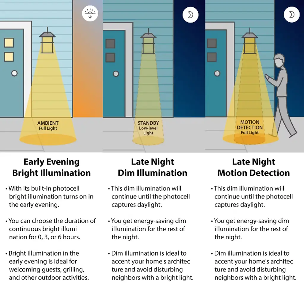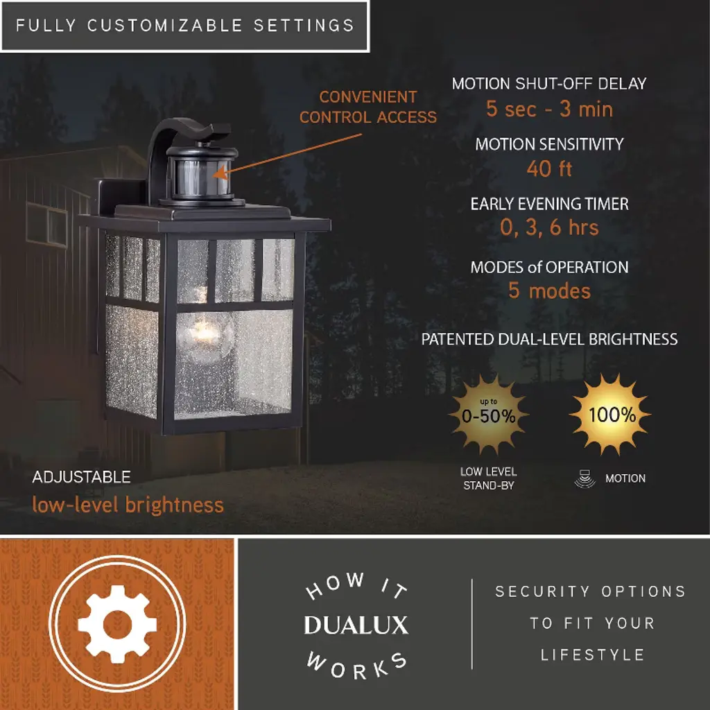 Dualux dual-level outdoor security lighting is designed to fit your lifestyle and enhance the beauty, safety, and usability of your home's exterior areas. Enjoy the comfort and convenience of continuous bright illumination during the early evening hours with automatic dimming late at night to provide soft, ambient illumination until dawn. Rest assured knowing that whenever motion is detected, on-demand bright illumination will be triggered to keep your property safe and secure. This fixture works with most dimmable LED bulb models. You get convenience, security, and efficiency with Dualux outdoor light fixtures.
