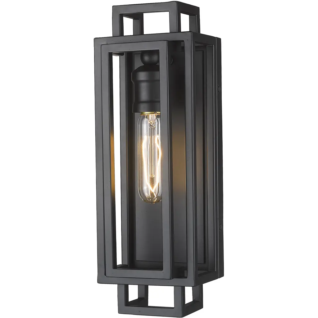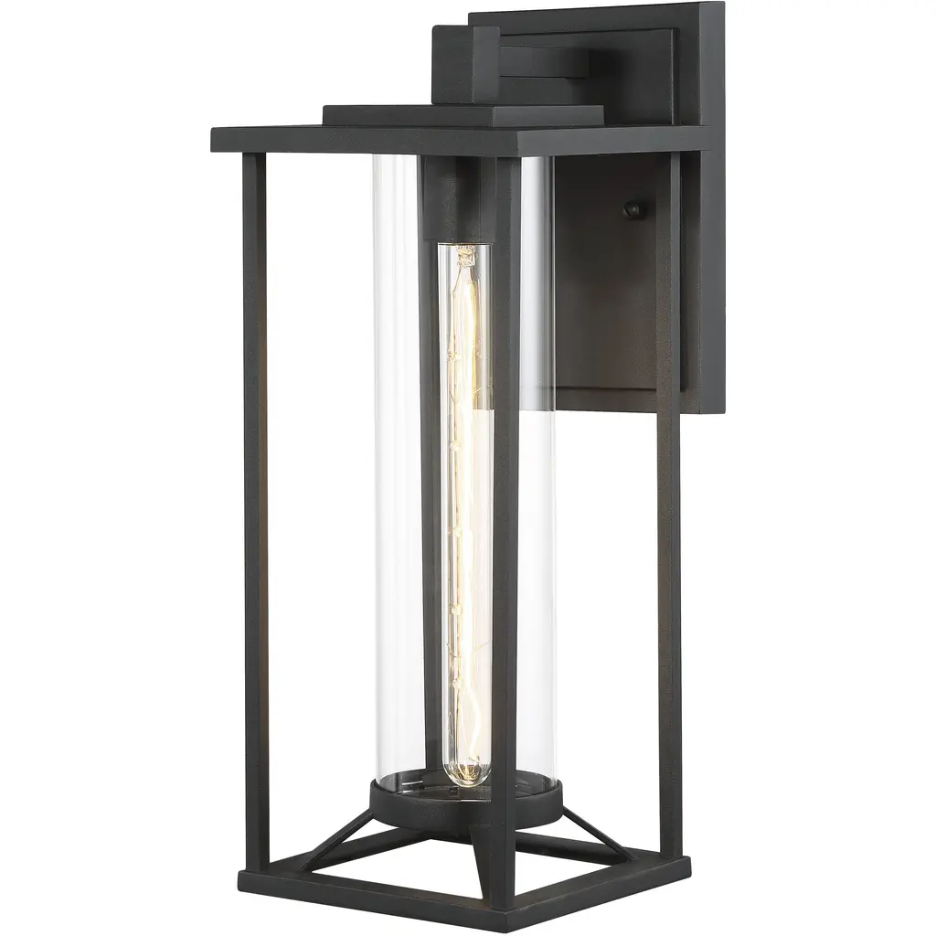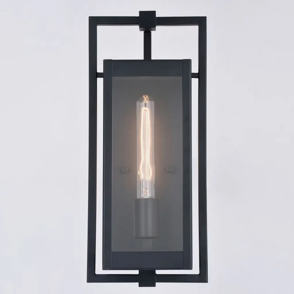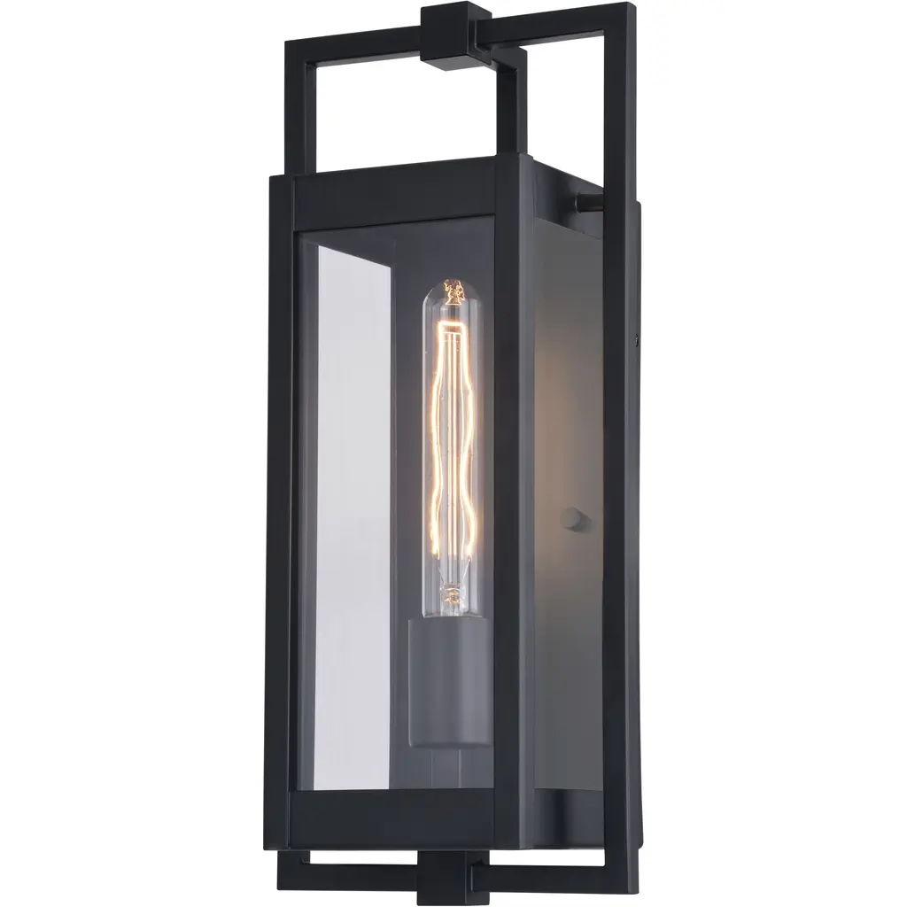 Collection: Sheridan, Material: Glass, Finish Color: Matte Black, Width: 7", Height: 16.25", Depth: 5.25", Height From Outlet Box: 9.25", Backplate Width: 4.75", Backplate Length: 11.75", Lamping Type: Incandescent, Number Of Bulbs: 1, Wattage: 60 Watts, Dimmable: Yes, Moisture Rating: Wet Rated, Desc: A unique outer frame and rectangle shape defines this lighting collection called Sheridan. Matte black frames around the clear flat glass panels give this wall lamp collection its exceptional contemporary style. No frills get in the way with this clean look. Ideal for your outside porch, patio, entryway, garage, laundry room, or any other area of your home. Matte black finish and an updated flush mount sconce style is equally at home in exterior or interior spaces / Weather resistant steel construction provides long lasting durability / Uses 1 x 60 watt E26 medium base bulb (not included); LED compatible, dimmable for desired illumination levels when used with dimmable bulbs and compa