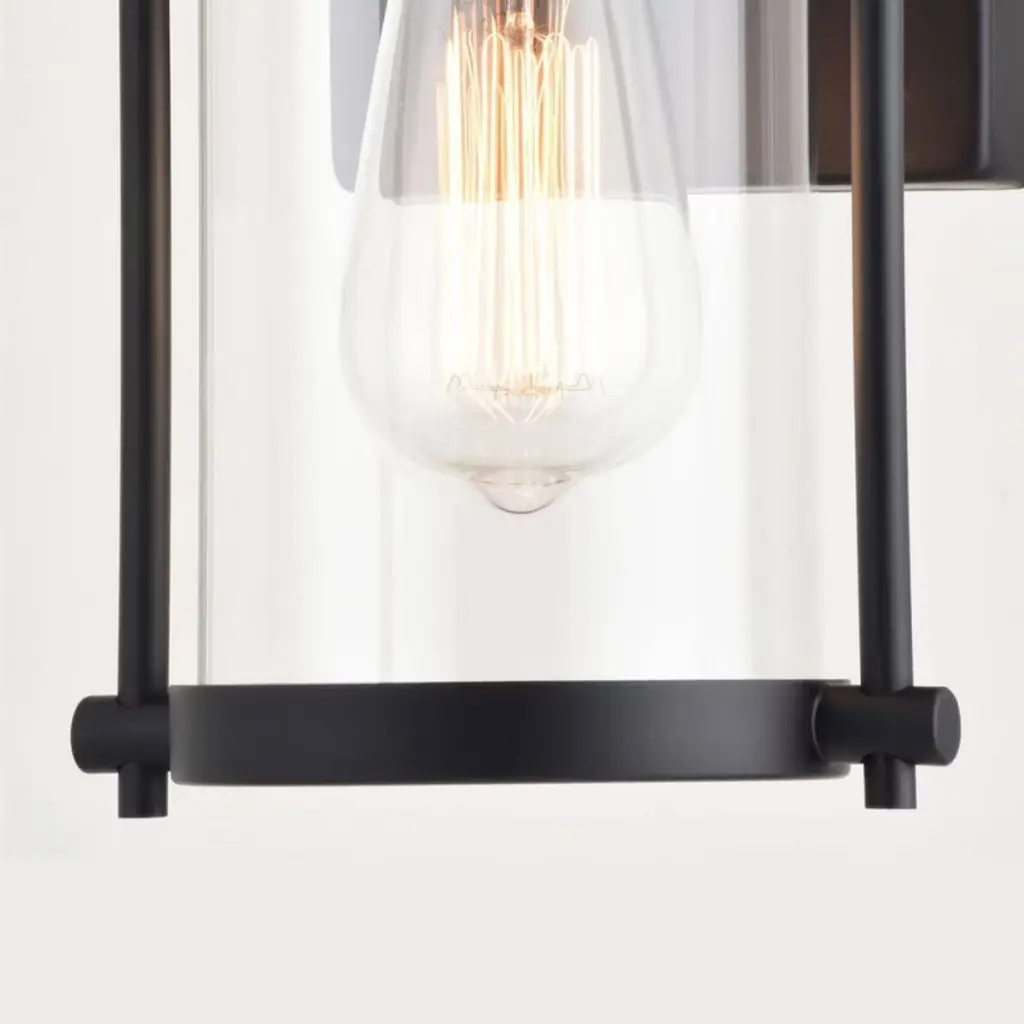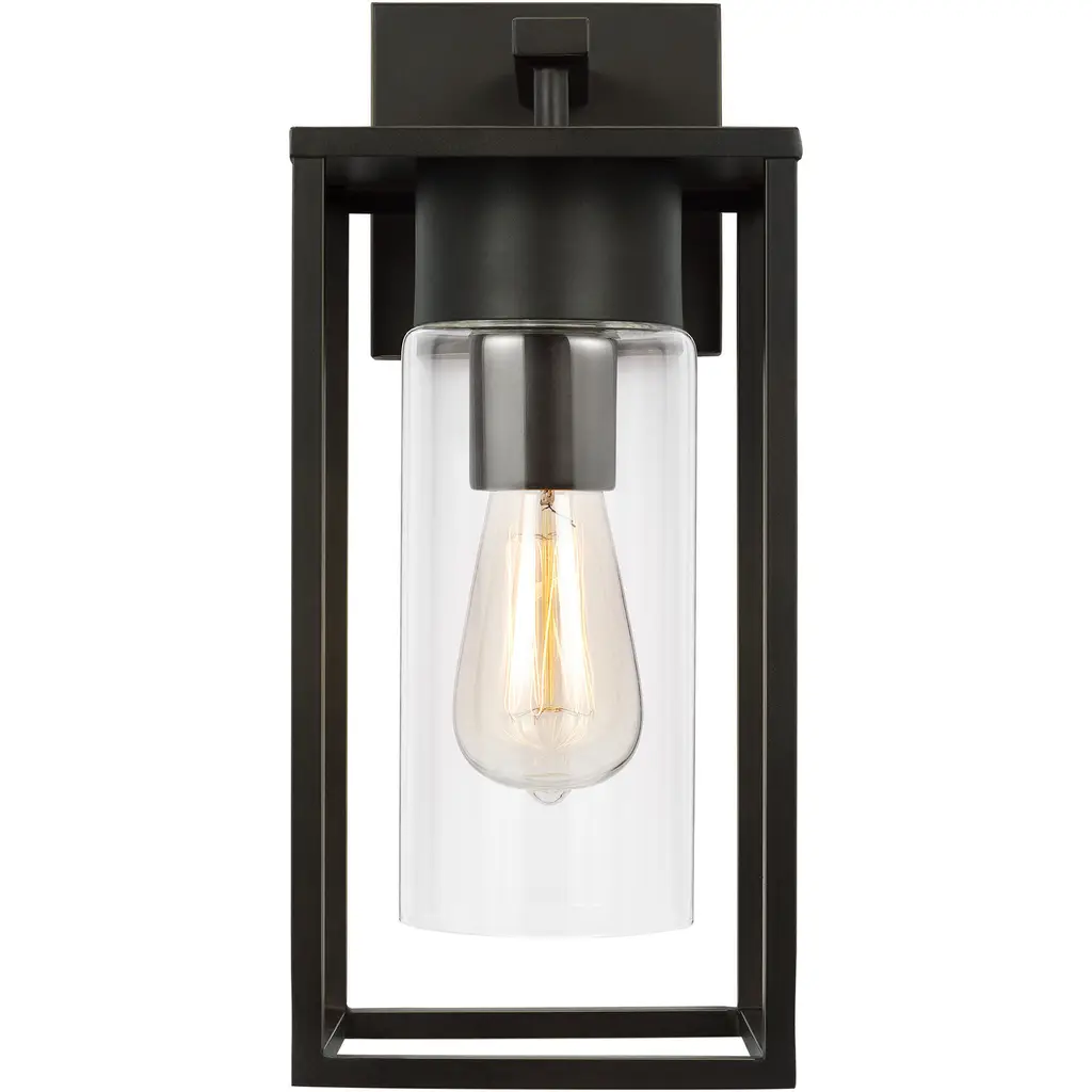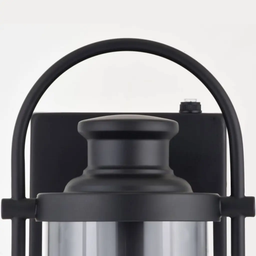 Collection: Winfield, Material: Metal, Finish Color: Matte Black, Width: 5.75", Height: 11.5", Depth: 5.5", Height From Outlet Box: 4.5", Backplate Width: 4.75", Backplate Length: 6", Lamping Type: Incandescent, Number Of Bulbs: 1, Wattage: 60 Watts, Dimmable: Yes, Moisture Rating: Wet Rated, Desc: With its distinctive wrap-around handle, the Winfield collection is a blend of both transitional and contemporary styling. The matte black finish and clear cylindrical glass shade will enhance any home exterior. It has a built-in dusk to dawn photocell that automatically turns the light on at dusk and turns it off at dawn, saving energy during daylight hours. This outdoor wall light is ideal for your covered porch, entryway, or garage. Weather resistant metal material provides long lasting durability / Clear glass provides bright illumination and a transitional feel / Uses 1 x 60 watt E26 medium base bulb (not included); led compatible / 5.75-in W x 11.5-in H x 5.5-in D / Open bottom for