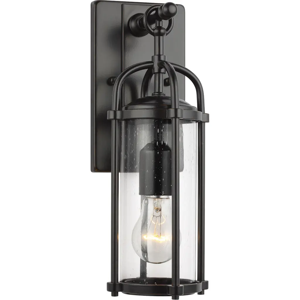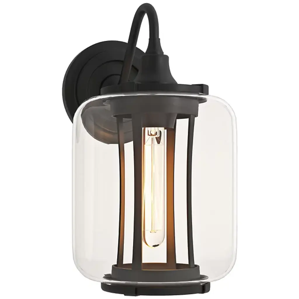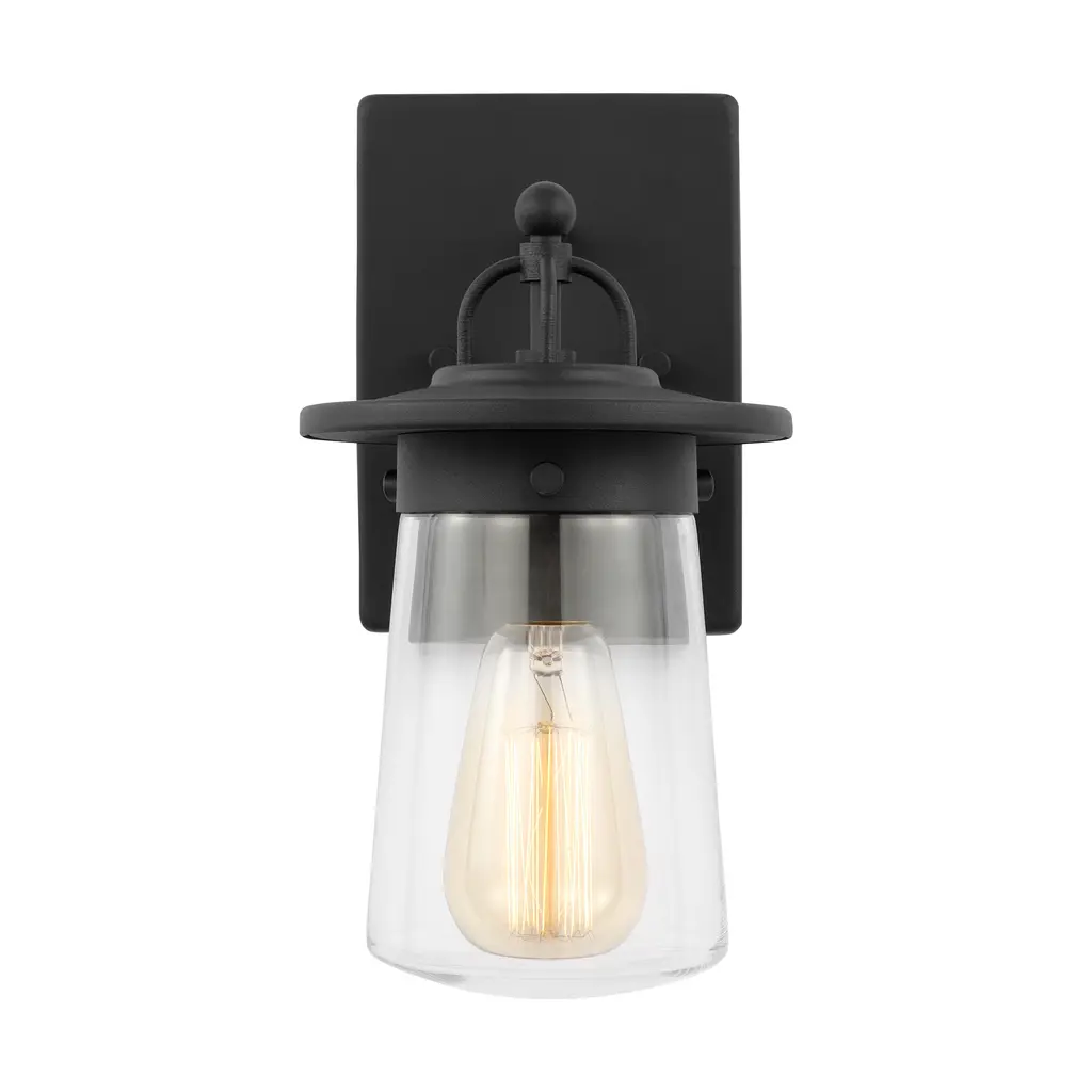 Collection: Winfield, Material: Metal, Finish Color: Matte Black, Width: 5.75", Height: 11.5", Depth: 5.5", Height From Outlet Box: 4.5", Backplate Width: 4.75", Backplate Length: 6", Lamping Type: Incandescent, Number Of Bulbs: 1, Wattage: 60 Watts, Dimmable: Yes, Moisture Rating: Wet Rated, Desc: With its distinctive wrap-around handle, the Winfield collection is a blend of both transitional and contemporary styling. The matte black finish and clear cylindrical glass shade will enhance any home exterior. It has a built-in dusk to dawn photocell that automatically turns the light on at dusk and turns it off at dawn, saving energy during daylight hours. This outdoor wall light is ideal for your covered porch, entryway, or garage. Weather resistant metal material provides long lasting durability / Clear glass provides bright illumination and a transitional feel / Uses 1 x 60 watt E26 medium base bulb (not included); led compatible / 5.75-in W x 11.5-in H x 5.5-in D / Open bottom for