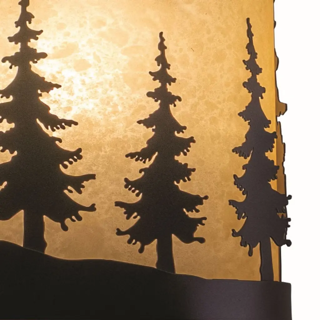Collection: Yosemite, Material: Steel, Finish Color: Burnished Bronze, Width: 3.75", Height: 6", Depth: 3.75", Lamping Type: Incandescent, Number Of Bulbs: 1, Wattage: 100 Watts, Dimmable: Yes, Moisture Rating: Wet Rated, Desc: Evoking the spirit of the wilderness, this rustic themed light is clad in a burnished bronze finish and features silhouetted tree imagery atop glowing white tiffany style glass. It is a great choice for a vacation lodge, cabin or suburban home and will complement a variety of home styles: anywhere you want to bring an element of nature. This versatile light is outdoor damp rated and can be used indoors as well as outdoors. Mount these lights on your porch, hallway, or entryway and experience this stylish look for yourself. Burnished bronze finish offers a distinctive look and quality steel construction Amber flake glass provides bright illumination and a rustic feel Uses 1 x 100 watt E26 medium base bulb (not included); led compatible 8-in W x 11-in H x 5-i