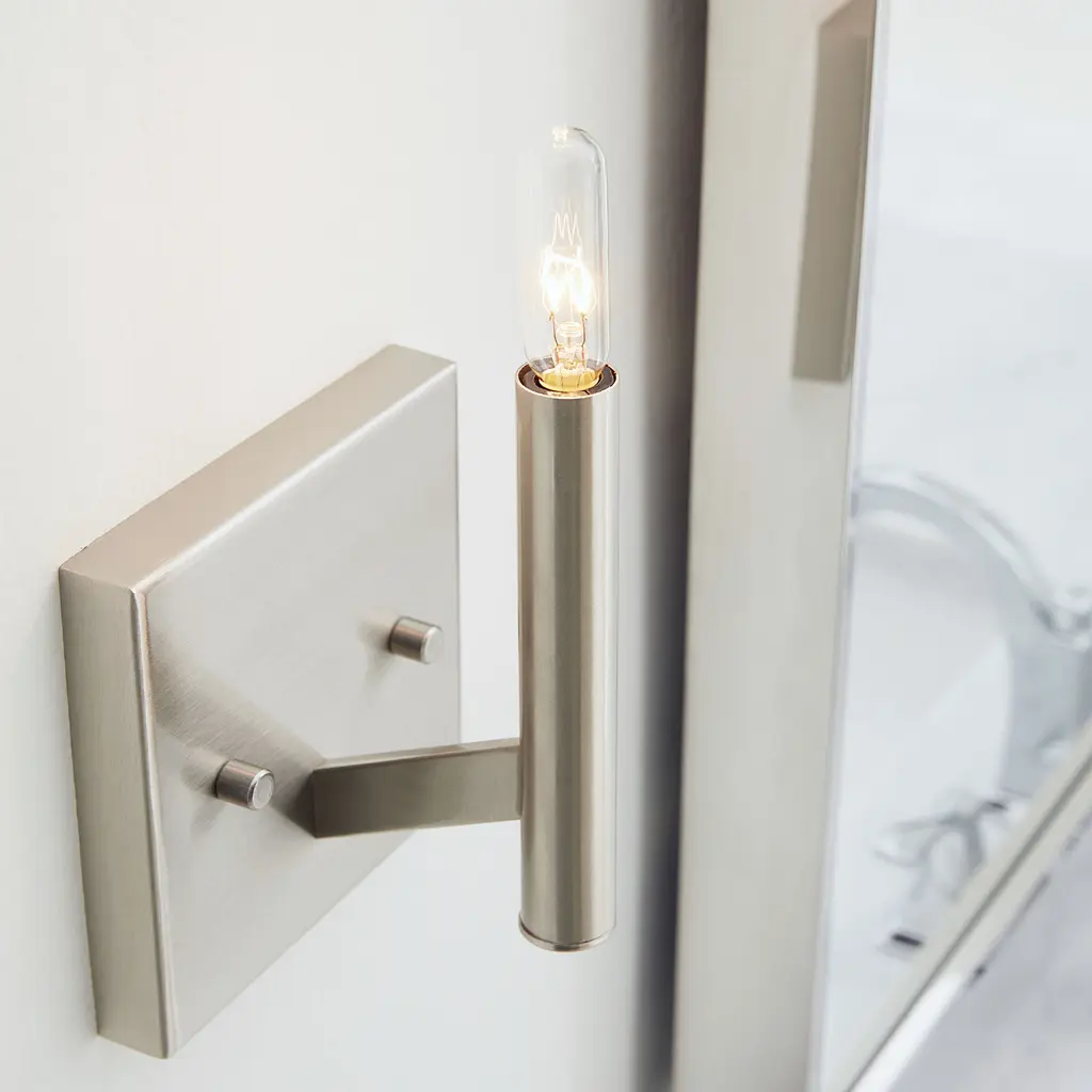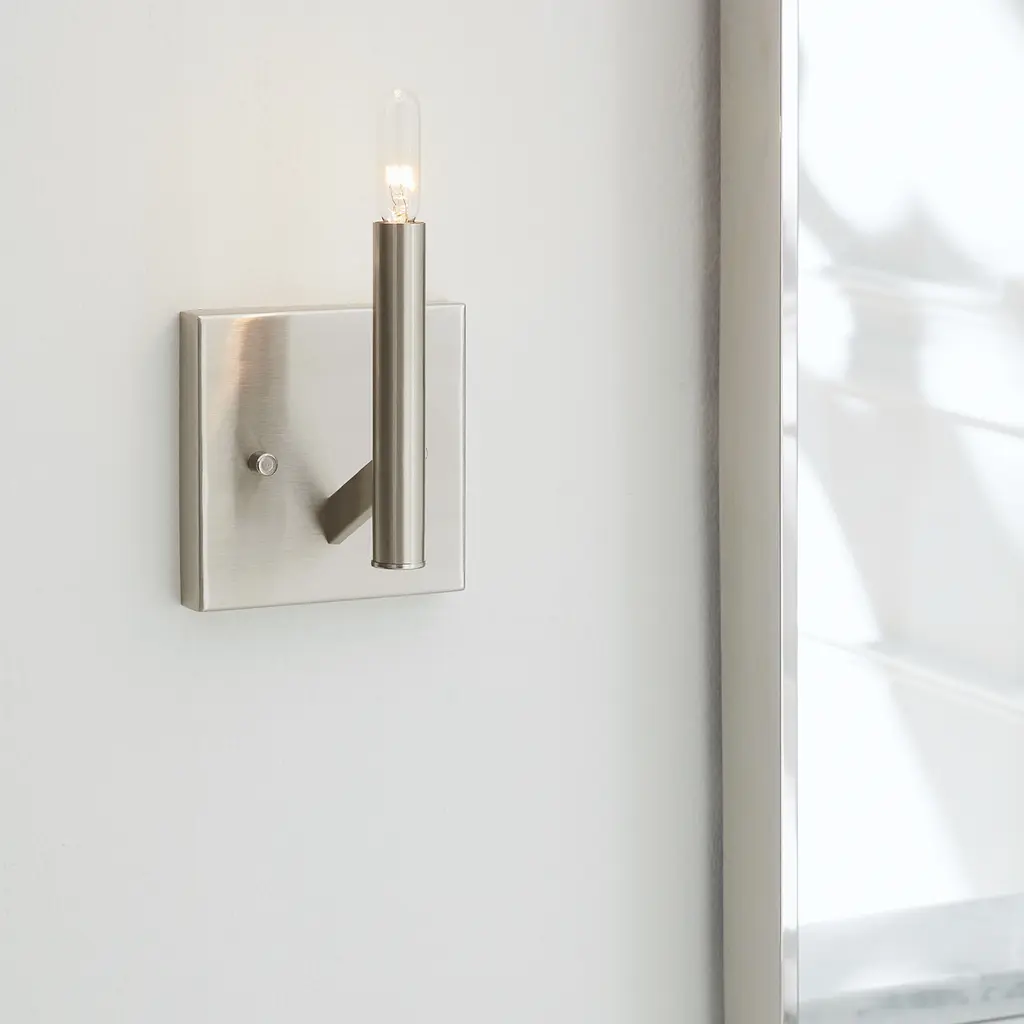 The Vector one light wall sconce in brushed nickel provides abundant light for your bath vanity, while adding a layer of today's style to your interior design. Inspired by mid-century modern design with simple straight lines