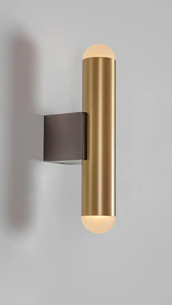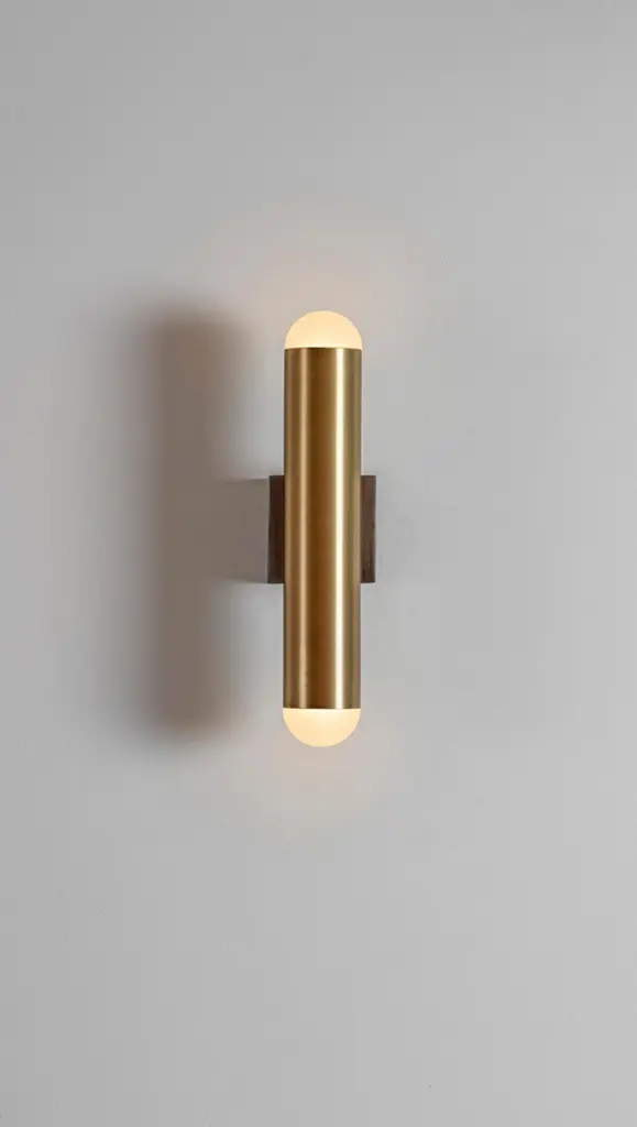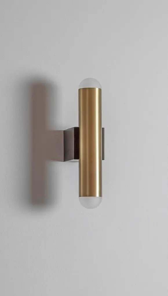 Vector wall lamp by Square in Circle, 2022Dimensions: W 7 x H 28 cm; projection: 11.5 cmMaterials: Dark bronze, opaque glass, brushed brassMinimalistic brushed brass wall light with a light source positioned on both ends. The light is connected to the brass back plate, which gives the impression of a floating object. Light is suitable for bathroom use.Square in circle is a London-based design studio founded in 2019. The studio explores lighting design in minimal, geometric forms inspired by the Modernist Era. Materials such as marble, metal and glass combine to make each sculptural piece a 'total and complete work of art', as in the manner of Gesamtkunstwerk.All our lamps can be wired according to each country. If sold to the USA it will be wired for the USA for instance.