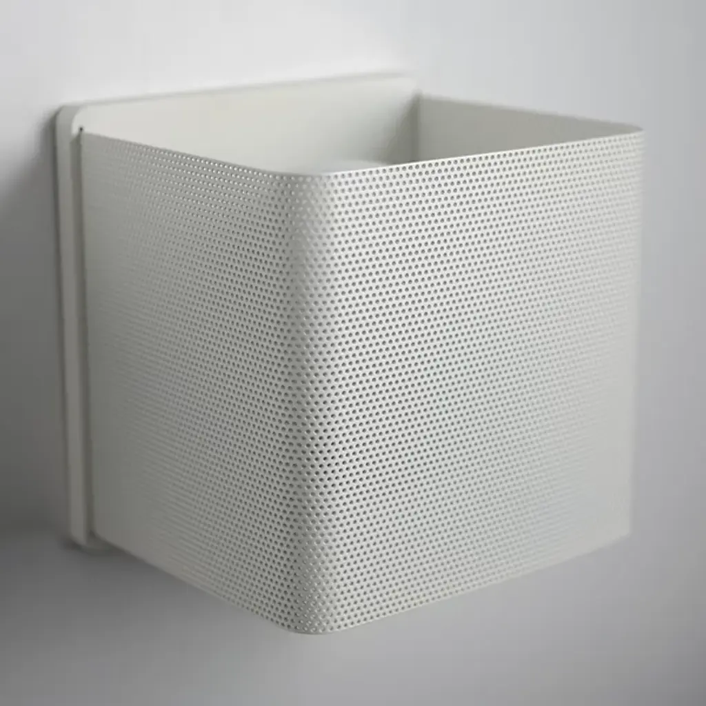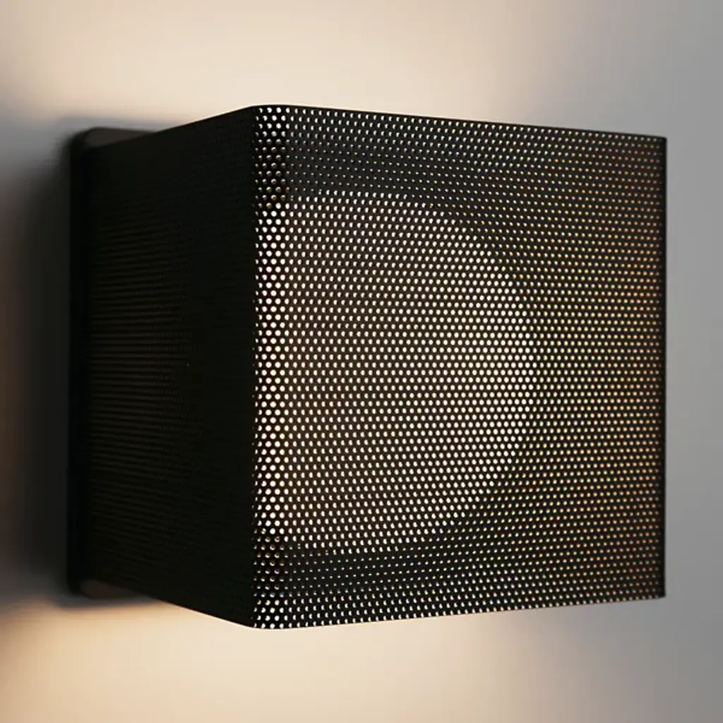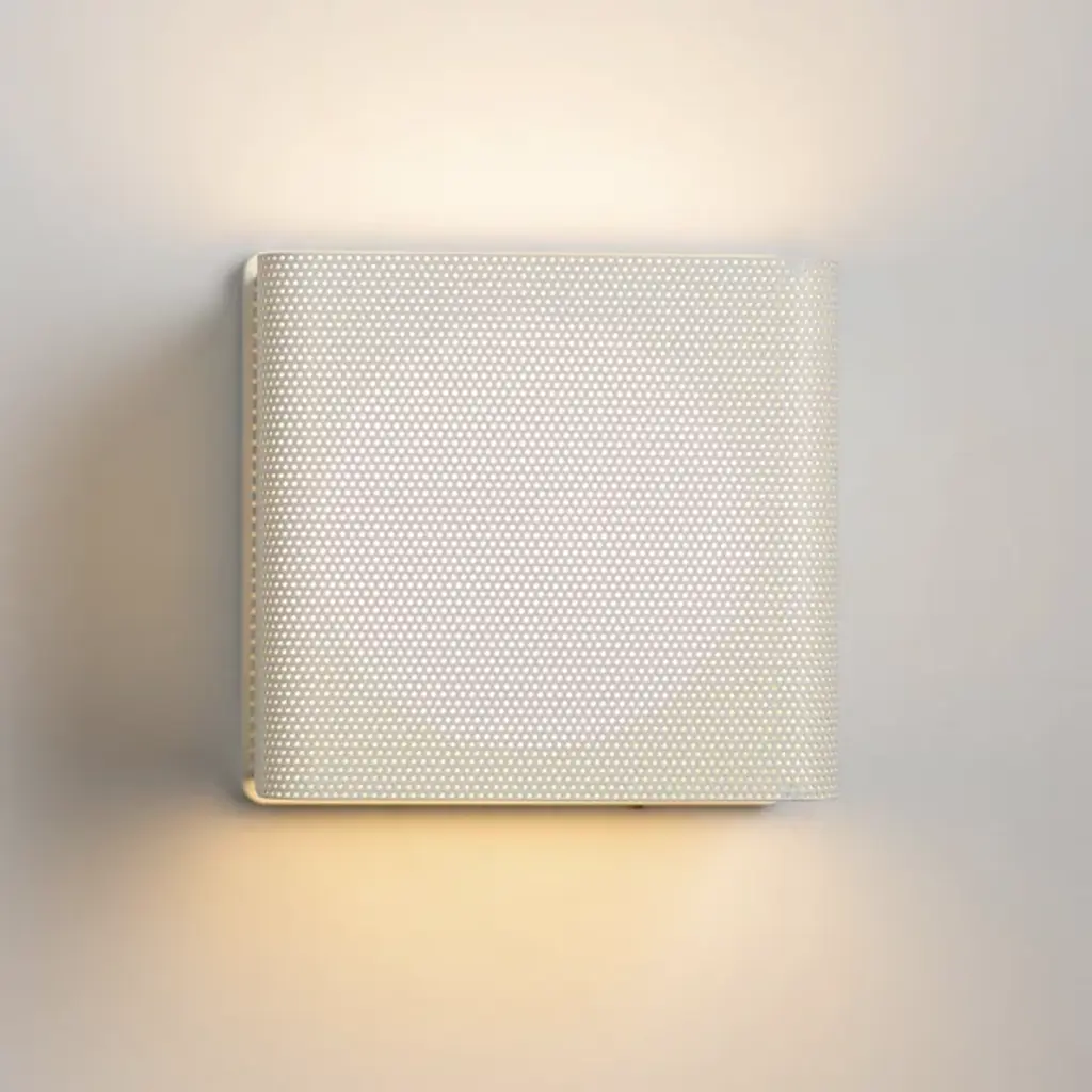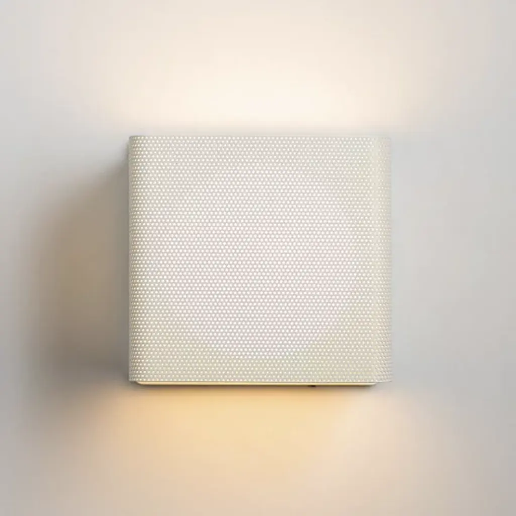 Present an inspired appeal to interior spaces with the clever, curve-cornered construction of the Veil 8 Wall Sconces from Tomnuk Design. An excellent choice for residential lighting while remaining touch enough for commercial use. Updated industrial simplicity is the brainchild of Jordan Tomnuk. Starting with a square metal wall plate that holds the fixture’s lamping securely, the lamping is accompanied by a slim steel shade accented by a series of tiny pinholes, forming an intricate pattern. The glass diffuser set within is hand-blown, creating an individual warmth as it mellows direct glare to all sides and splashes a band of soft warmth to the center, running between angular projections of vertical wall wash.