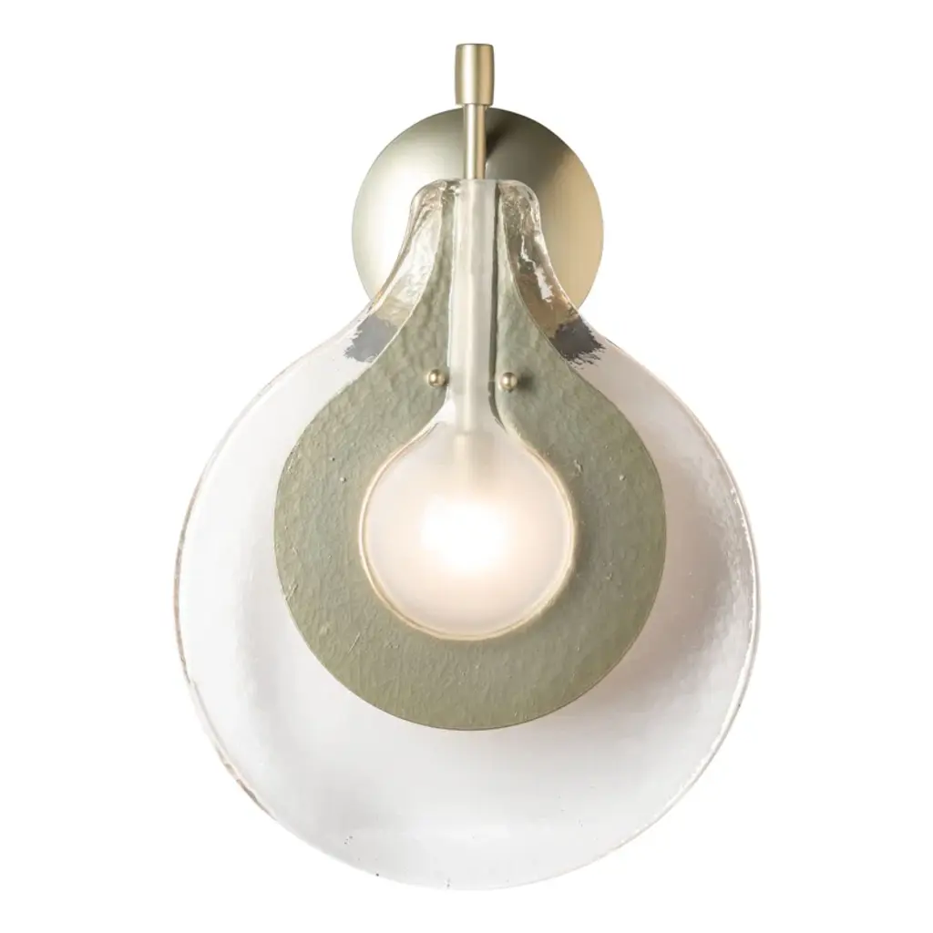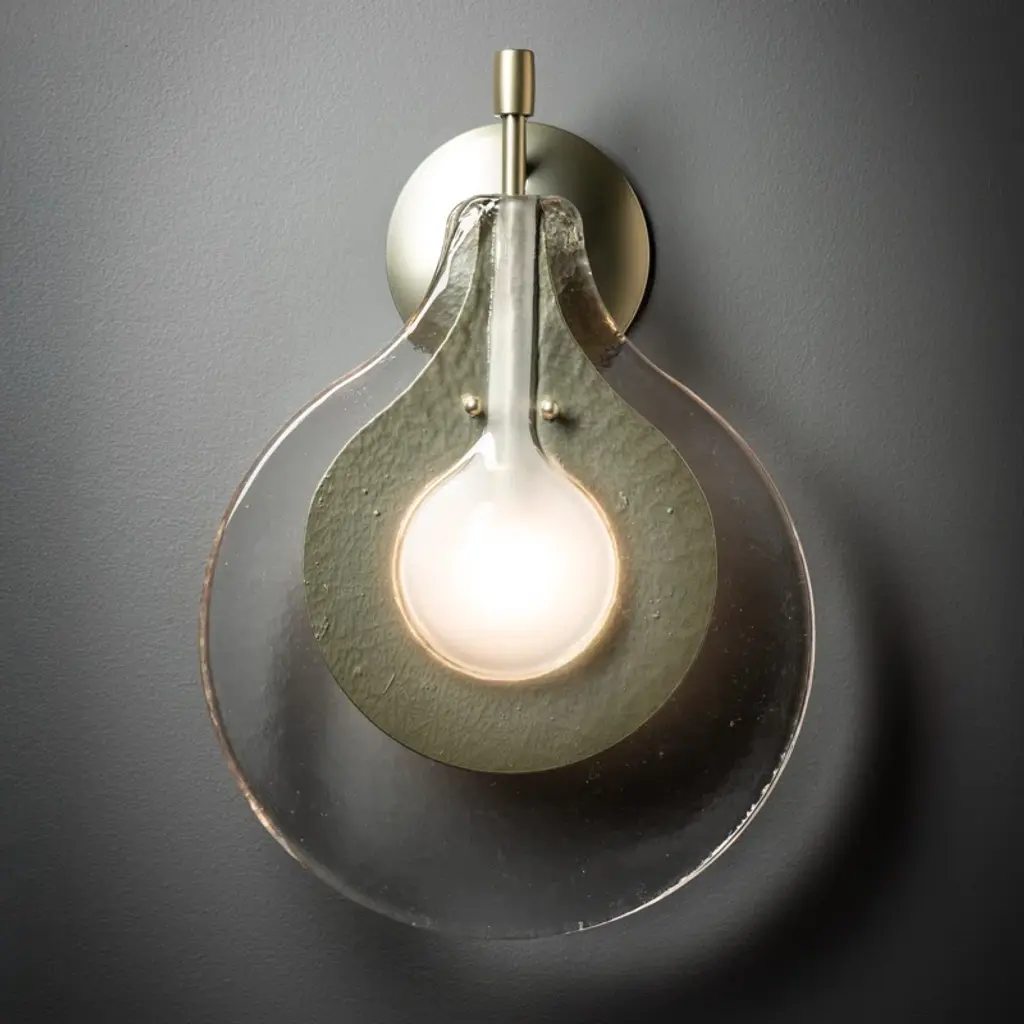Italian Venetian glass sets the tone for this beautiful wall sconce. Twin layers resembling a large "drop" of handmade, tactile glass encase a sculptural piece of steel that nestles the bulb within a frosted glass. Hubbardton Forge's Jason Hancock designed this with a very small wall mount that complements this unique and stunning piece.