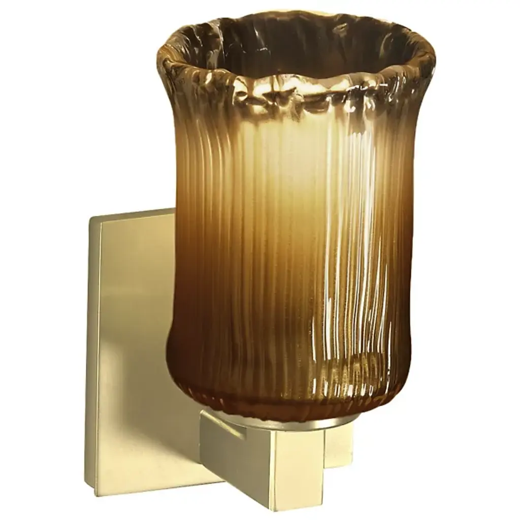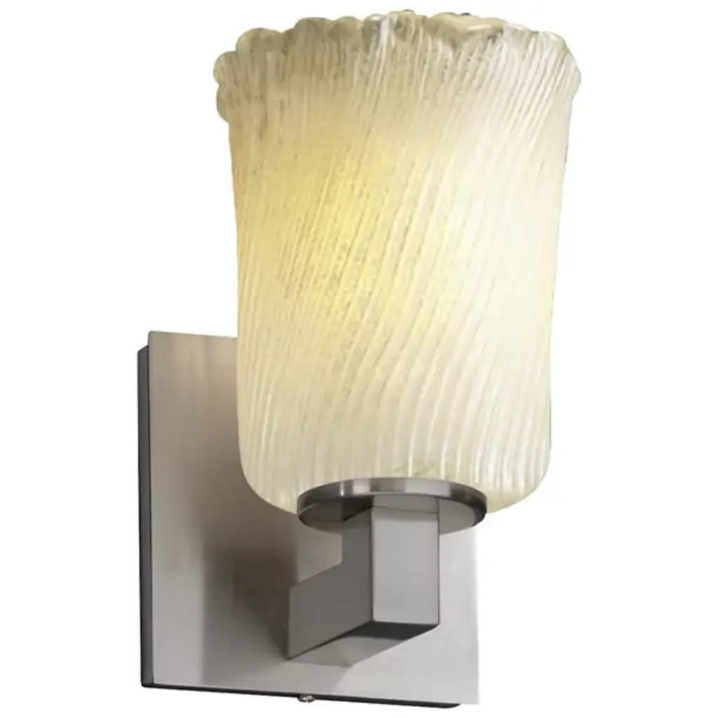 Che bellezza! The Veneto Luce Modular Wall Sconce by Justice Design Group personifies the beauty of Italian craftsmanship with its iconic Venetian glass design. The shade has a classic cylindrical shape that stands on a small, metal-finished base which joins to a square wall plate via support arm. Whether installed as an uplight or downlight, the fixture’s open top (or bottom) allows for light to have a direct, undiffused spill in addition to a refractive glow from the surrounding shade.